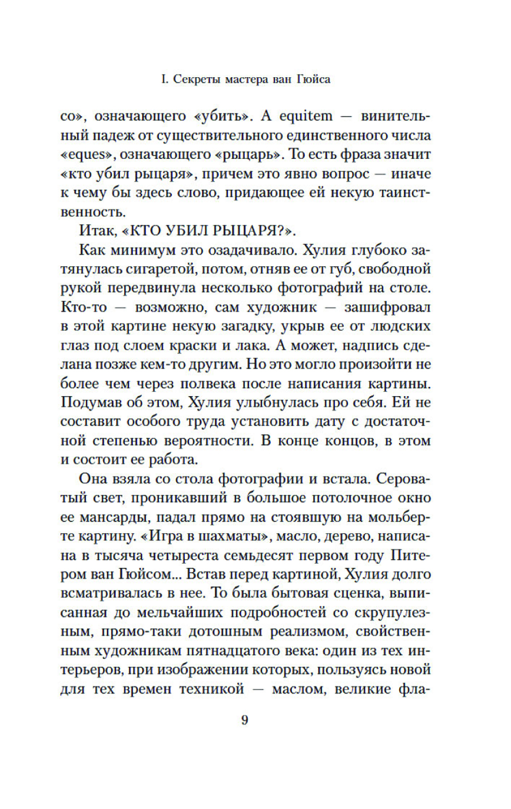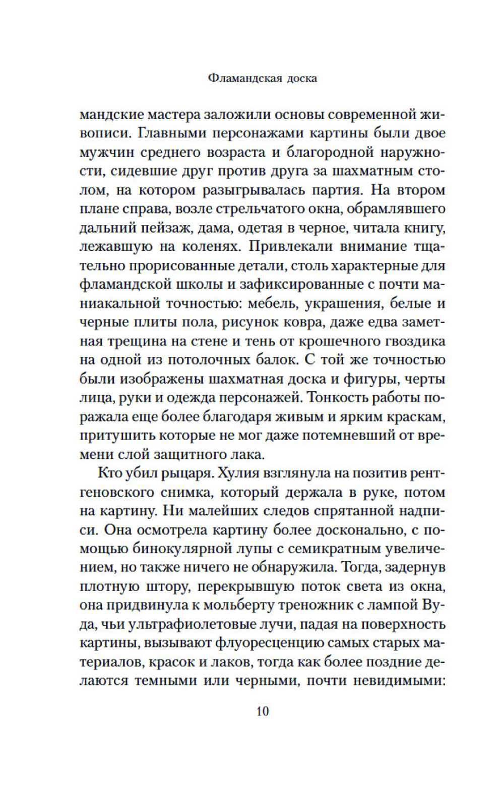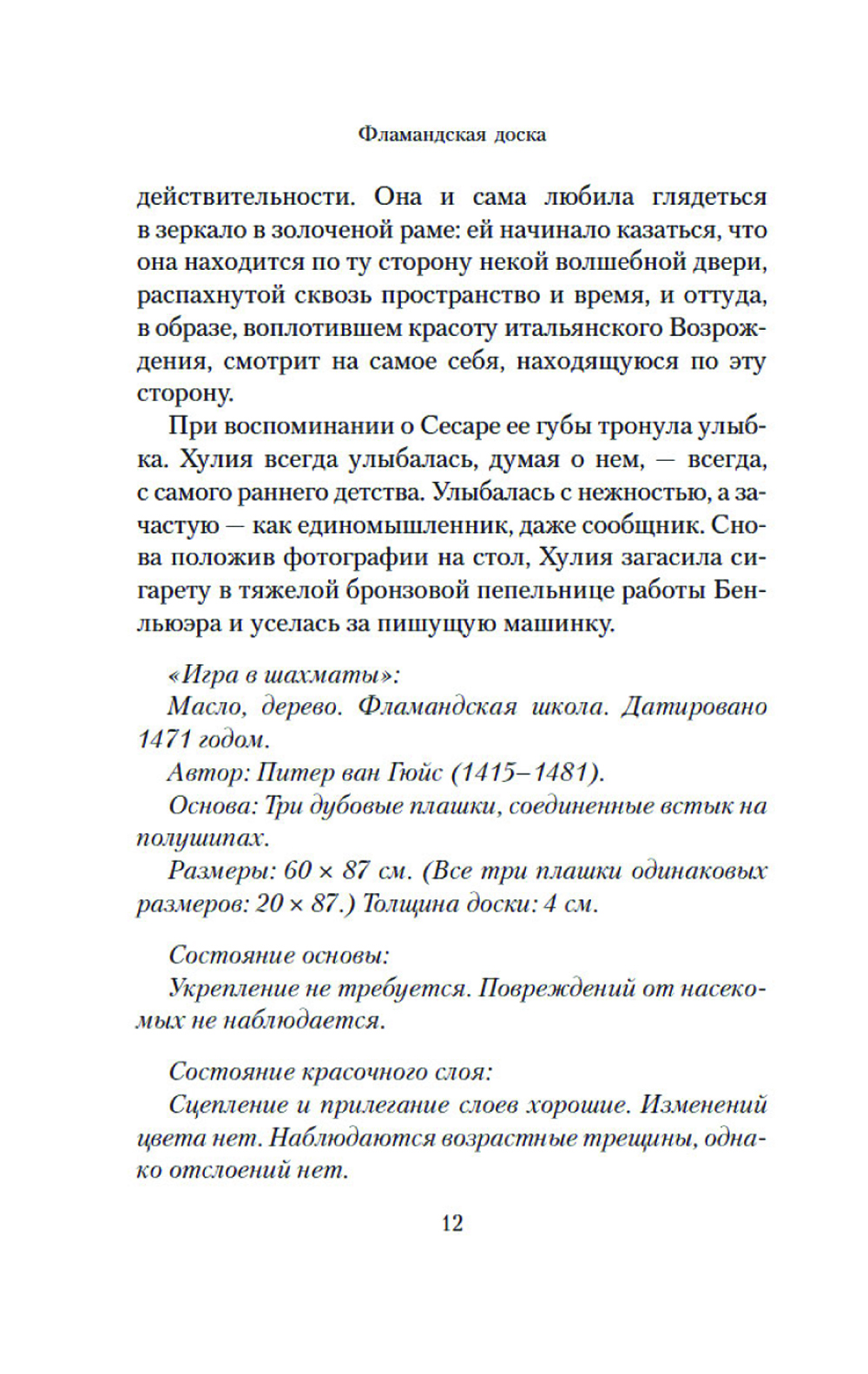 Неоконченная шахматная партия на картине фламандского художника и загадочная надпись, обнаруженная на ней под слоем краски, становятся ключом в расследовании убийств, которые происходят в наши дни. Каждый из героев романа превращается в шахматную фигуру, которая участвует в развернувшейся вокруг дьявольской игре. И безмолвная драма, отраженная в картине, получает странное продолжение спустя несколько веков. Живопись и математика, логика и история ставятся в романе на службу точному, идеально проработанному сюжету из мира коллекционеров и антикваров. Действие уводит героев в прошлое и заставляет обнаружить, что время не властно над человеческими страстями. И в отличие от шахмат, в реальности «ничто не бывает только черным или белым»: добро легко обращается в зло, а жертва в палача.