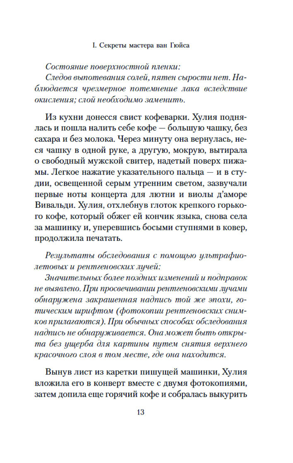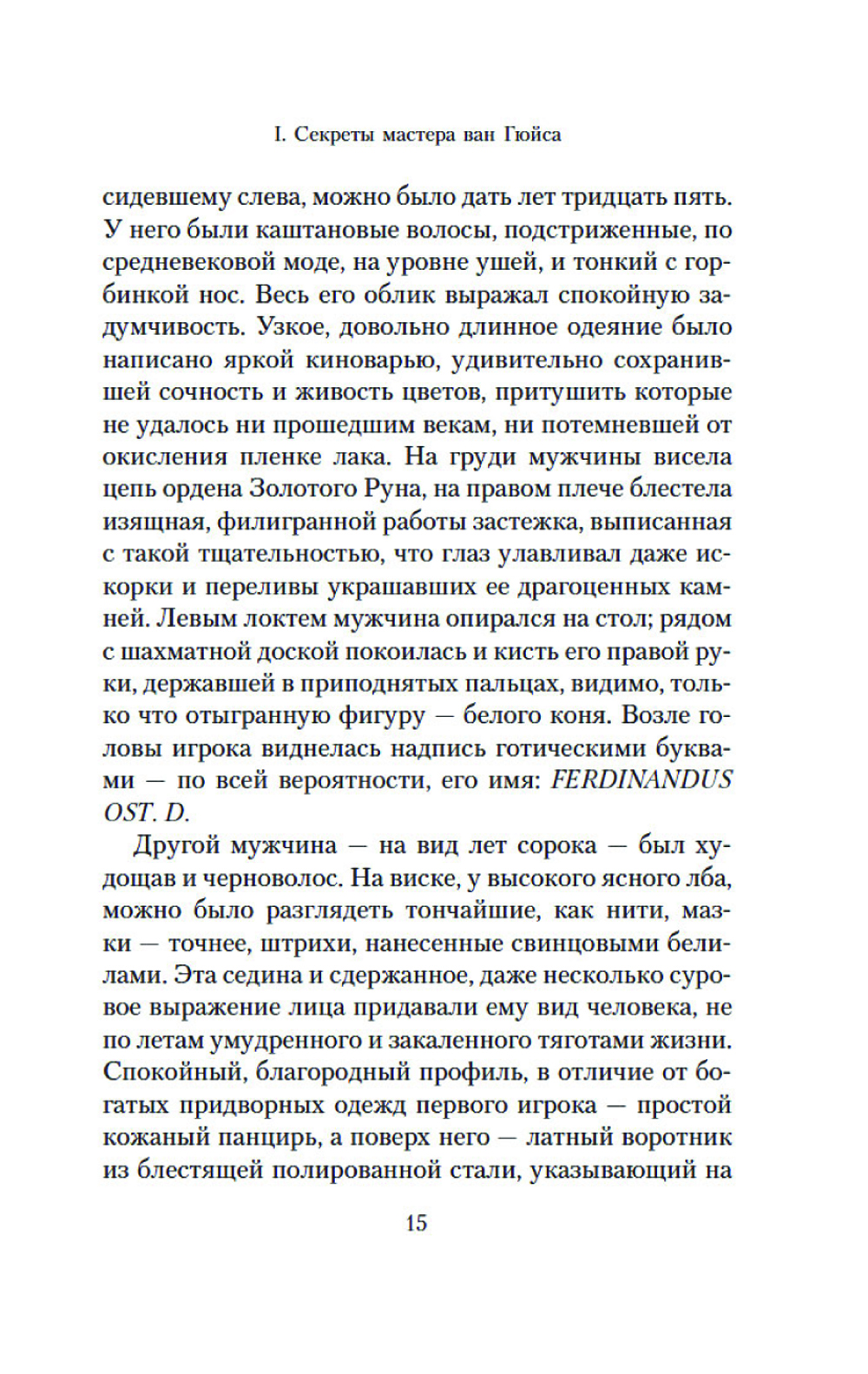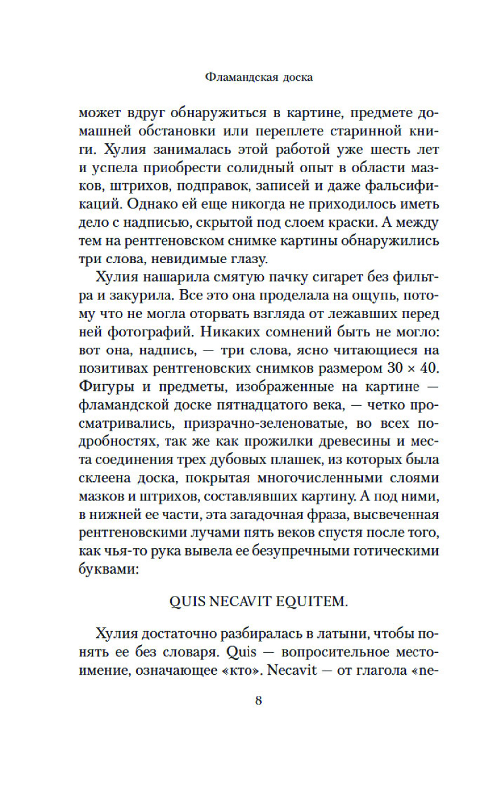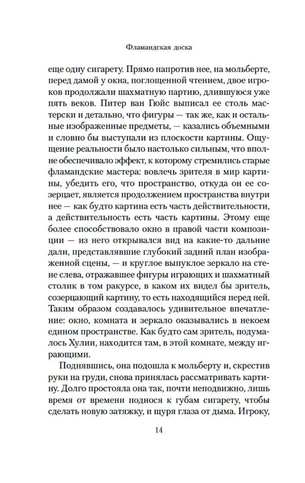 Неоконченная шахматная партия на картине фламандского художника и загадочная надпись, обнаруженная на ней под слоем краски, становятся ключом в расследовании убийств, которые происходят в наши дни. Каждый из героев романа превращается в шахматную фигуру, которая участвует в развернувшейся вокруг дьявольской игре. И безмолвная драма, отраженная в картине, получает странное продолжение спустя несколько веков. Живопись и математика, логика и история ставятся в романе на службу точному, идеально проработанному сюжету из мира коллекционеров и антикваров. Действие уводит героев в прошлое и заставляет обнаружить, что время не властно над человеческими страстями. И в отличие от шахмат, в реальности «ничто не бывает только черным или белым»: добро легко обращается в зло, а жертва в палача.