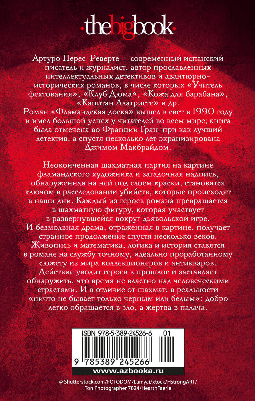 Неоконченная шахматная партия на картине фламандского художника и загадочная надпись, обнаруженная на ней под слоем краски, становятся ключом в расследовании убийств, которые происходят в наши дни. Каждый из героев романа превращается в шахматную фигуру, которая участвует в развернувшейся вокруг дьявольской игре. И безмолвная драма, отраженная в картине, получает странное продолжение спустя несколько веков. Живопись и математика, логика и история ставятся в романе на службу точному, идеально проработанному сюжету из мира коллекционеров и антикваров. Действие уводит героев в прошлое и заставляет обнаружить, что время не властно над человеческими страстями. И в отличие от шахмат, в реальности "ничто не бывает только черным или белым": добро легко обращается в зло, а жертва в палача.| Издательство | Азбука-Аттикус Издат.группа ООО |