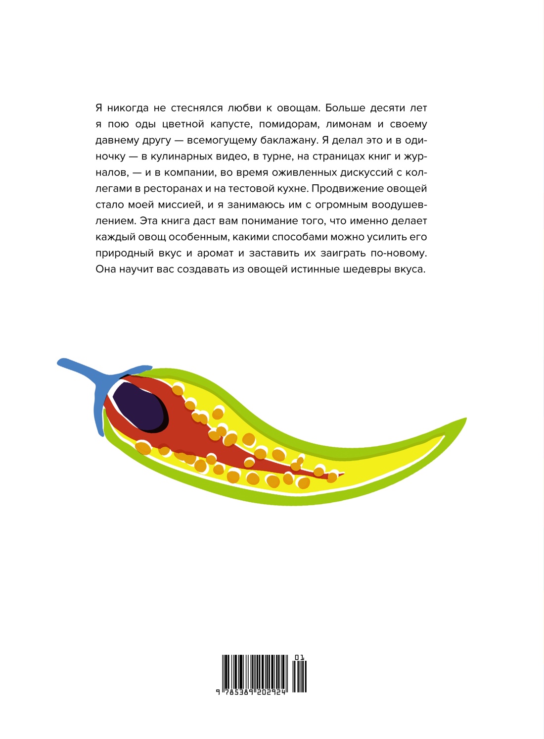 «Эта книга полностью посвящена овощам и научит вас создавать из них истинные шедевры вкуса. Первый ее раздел описывает основные процессы, происходящие во время приготовления овощей и других важных ингредиентов. Второй рассказывает о том, с чем их сочетать, чтобы подчеркнуть их характерные особенности. Третий касается самих продуктов - той чистой глубины вкуса, которой некоторые из них обладают от природы, что позволяет им играть главную роль в блюде, становясь более или менее самостоятельной его частью или компонентом, усиливающим и подчеркивающим вкус других овощей. Из 100 приведенных в книге рецептов 45 являются строго веганскими, еще 17 "веганизированы". Какими бы ни были ваши личные предпочтения, я уверен, что вы найдете достаточно причин, чтобы присоединиться ко мне в восхвалении всех вкусов и ароматов, которые могут предложить овощи». ( Йотам Оттоленги)| Издательство | КоЛибри |