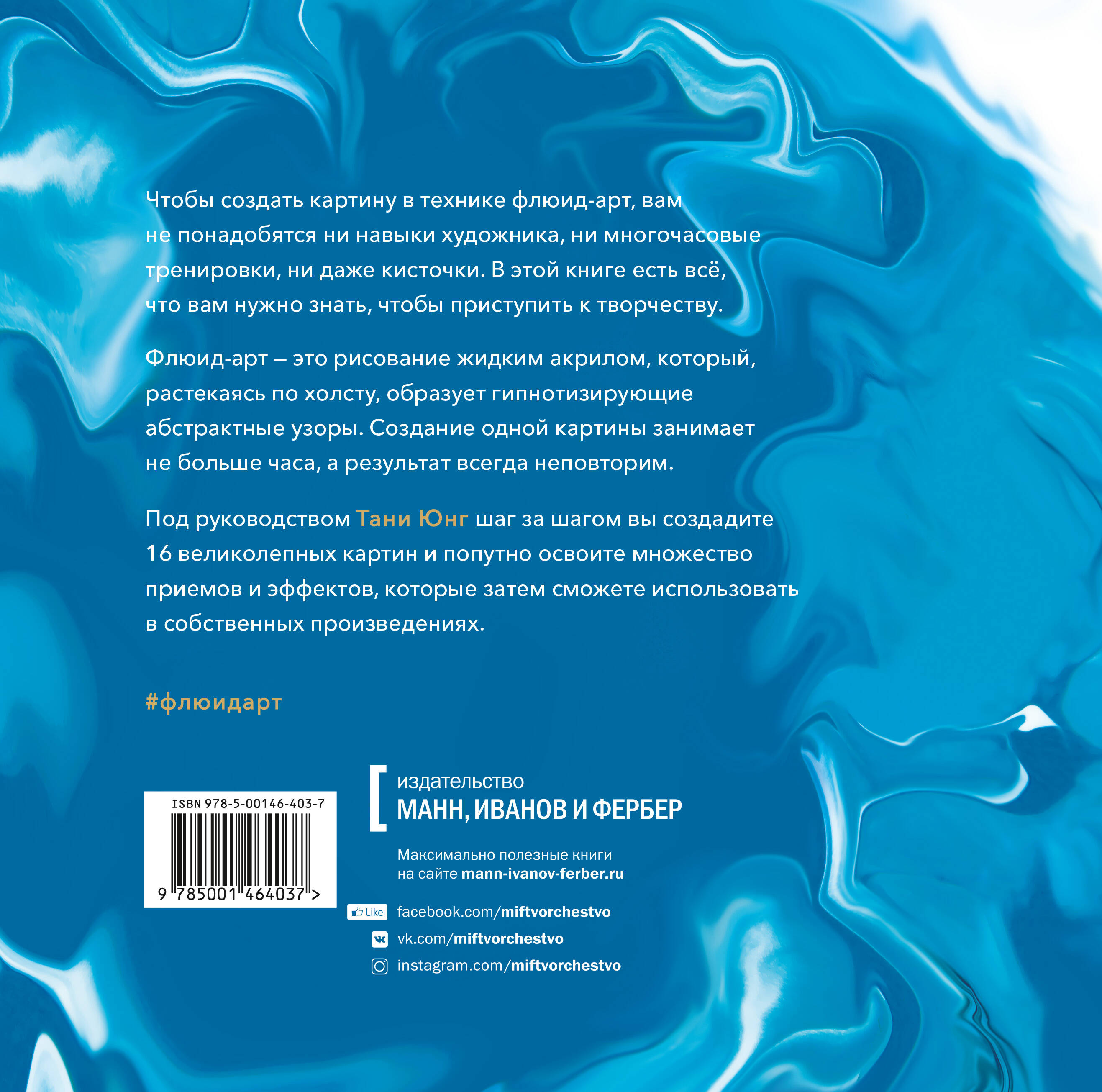 Флюид-арт - это техника рисования жидким акрилом, который, растекаясь по холсту, образует абстрактные узоры. На каждую картину у вас уйдет не больше часа. Под руководством Тани Юнг шаг за шагом вы создадите 16 великолепных полотен.| Издательство | МАНН, ИВАНОВ И ФЕРБЕР ООО |