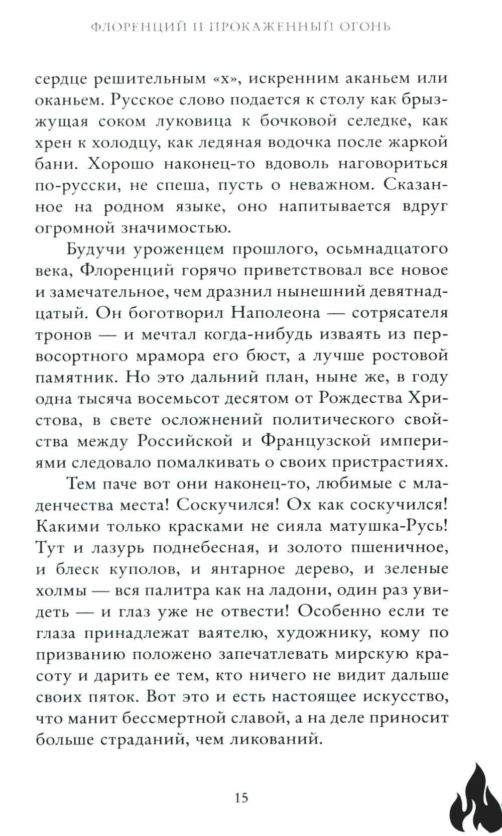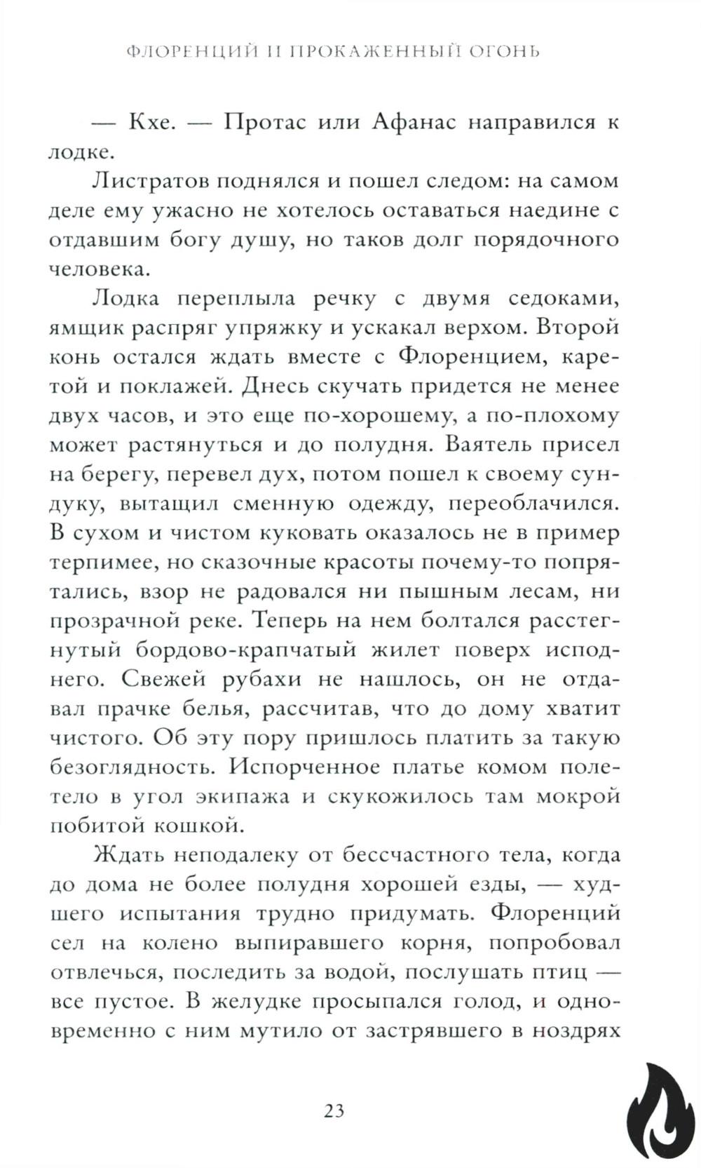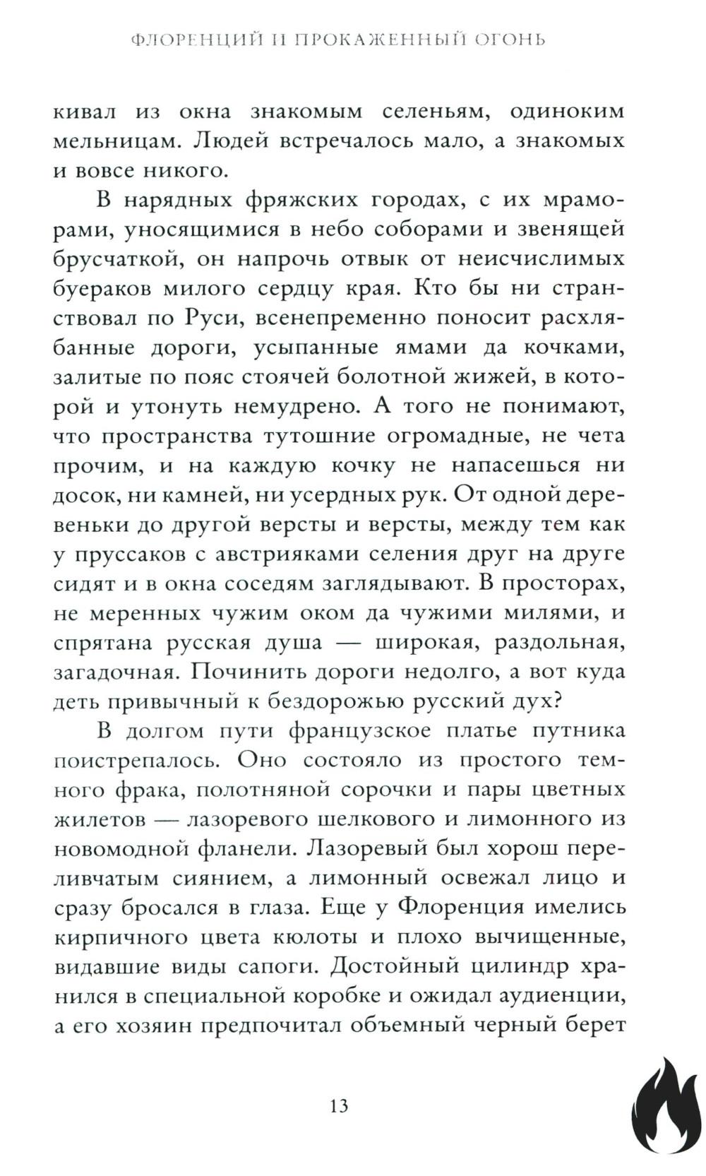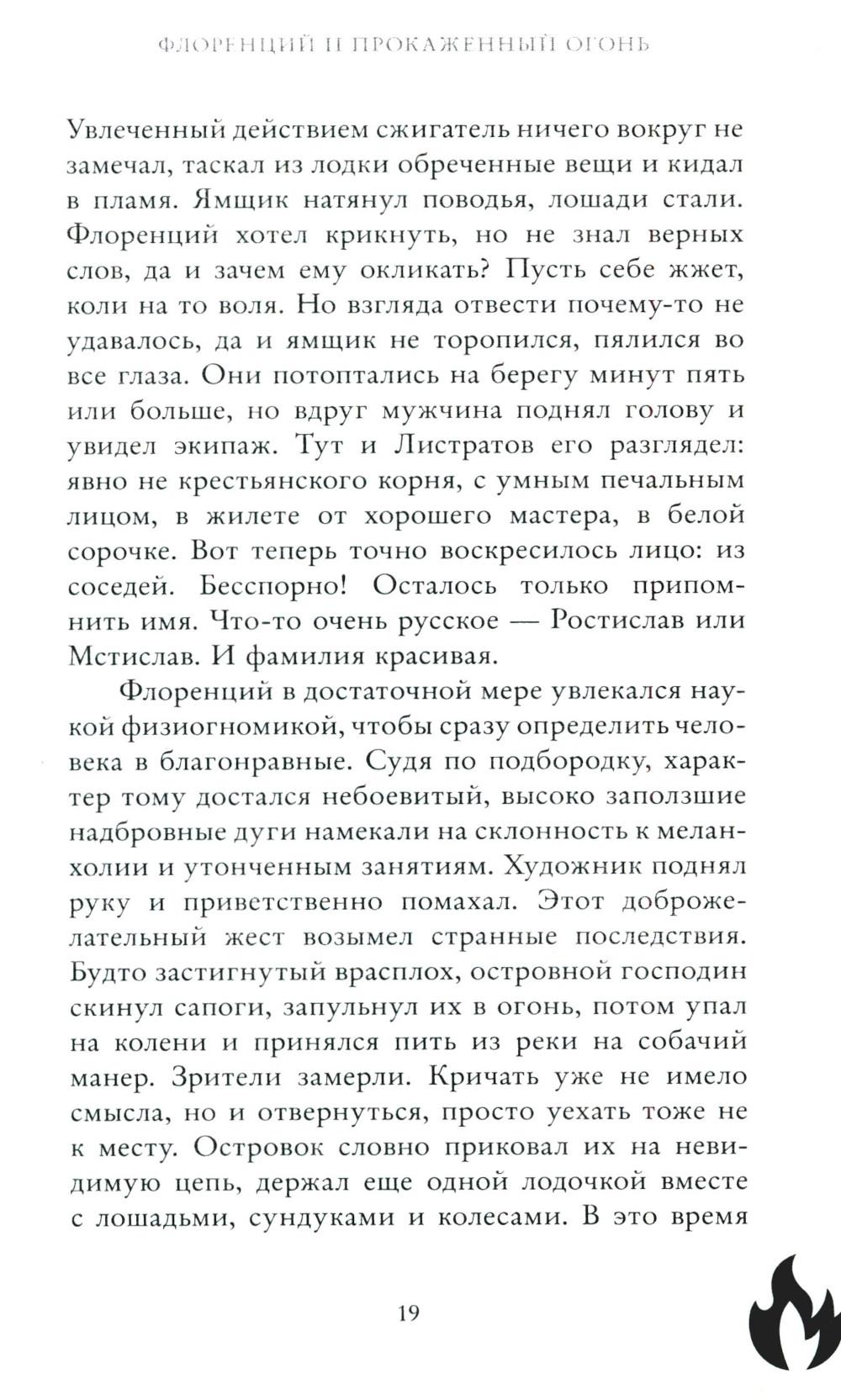 «Флоренций и прокаженный огонь» - захватывающий и атмосферный детектив, который приглашает погрузиться в далекий и полный тайн XIX век. Русская деревня в 1810 году сродни стоячей воде... Возвращаясь из Италии после долгих лет учебы, скульптор Флоренций Листратов не знал, что застрянет в родном селе, к тому же обвиненный в убийстве. Жителям деревни неведомо, почему почтенный господин Обуховский шагнул в пылающий костер и погиб в нем. Флоренция, единственное оружие которого - зоркий глаз художника, записывают в подозреваемые. Он-то и подмечает, что местный романтический злодей держит в захламленной комнате тайник, а в фамильных летописях имеет родство с весьма популярной особой. Быть может, эти обстоятельства как-то связаны с огненной казнью? Флоренцию предстоит узнать, кто мутит стоячую воду родной монастырки, а главное - за какой корыстью.| Издательство | Клевер-Медиа-Групп |