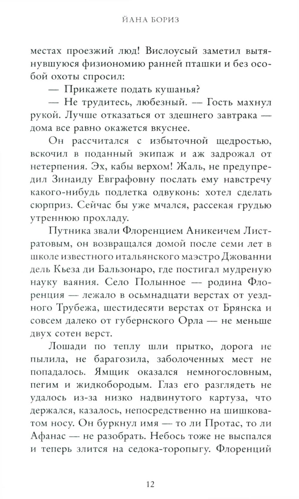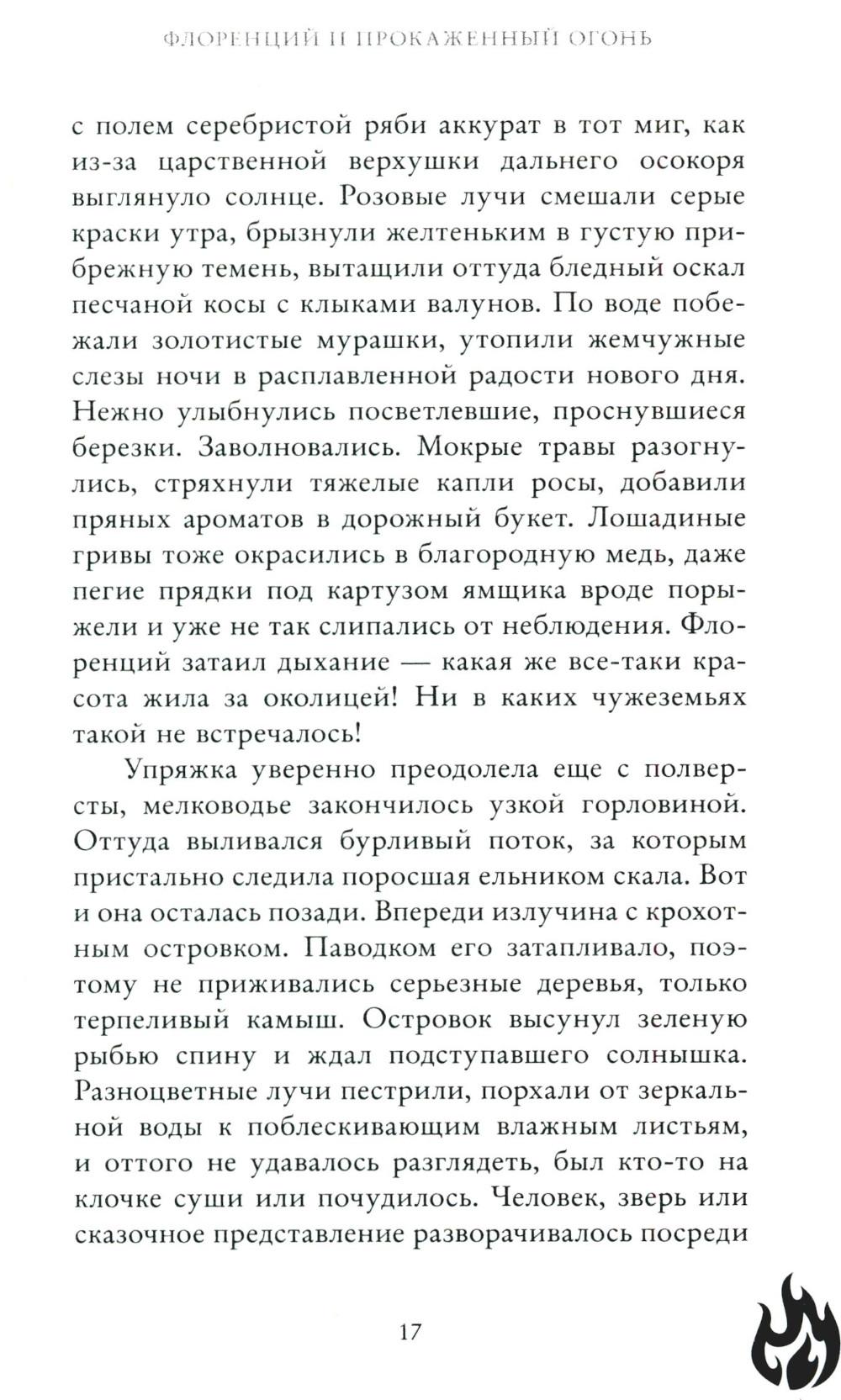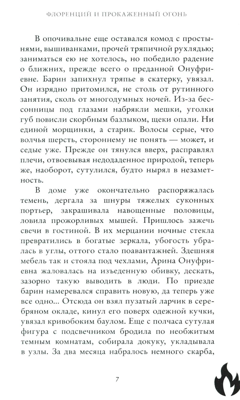 «Флоренций и прокаженный огонь» - захватывающий и атмосферный детектив, который приглашает погрузиться в далекий и полный тайн XIX век. Русская деревня в 1810 году сродни стоячей воде... Возвращаясь из Италии после долгих лет учебы, скульптор Флоренций Листратов не знал, что застрянет в родном селе, к тому же обвиненный в убийстве. Жителям деревни неведомо, почему почтенный господин Обуховский шагнул в пылающий костер и погиб в нем. Флоренция, единственное оружие которого - зоркий глаз художника, записывают в подозреваемые. Он-то и подмечает, что местный романтический злодей держит в захламленной комнате тайник, а в фамильных летописях имеет родство с весьма популярной особой. Быть может, эти обстоятельства как-то связаны с огненной казнью? Флоренцию предстоит узнать, кто мутит стоячую воду родной монастырки, а главное - за какой корыстью.| Издательство | Клевер-Медиа-Групп |