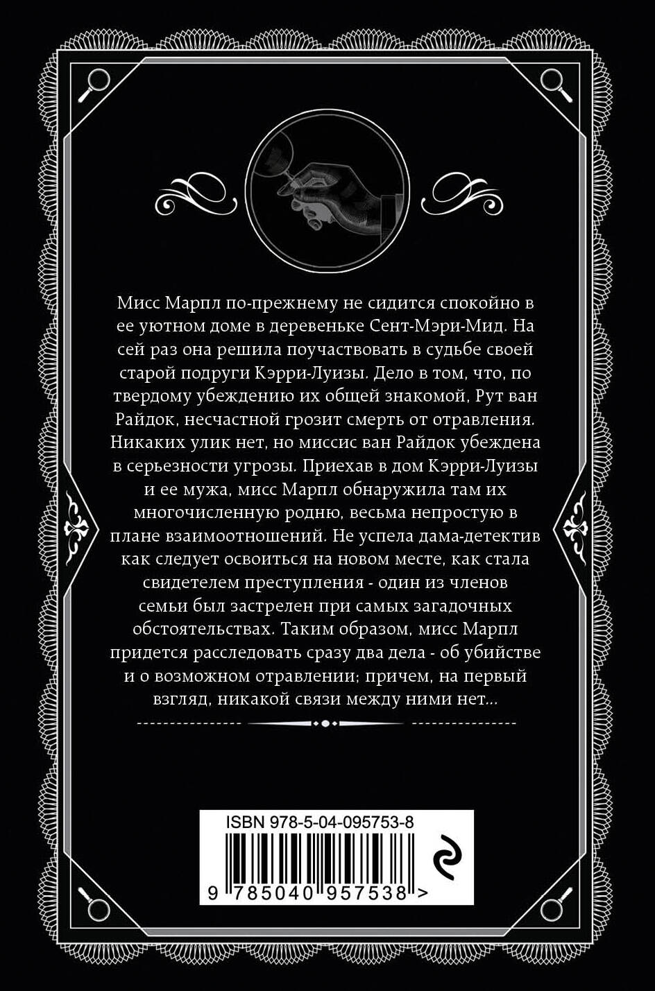 Мисс Марпл по-прежнему не сидится спокойно в ее уютном доме в деревеньке Сент-Мэри-Мид. На сей раз она решила поучаствовать в судьбе своей старой подруги Кэрри-Луизы. Дело в том, что, по твердому убеждению их общей знакомой, Рут ван Райдок, несчастной грозит смерть от отравления. Никаких улик нет, но миссис ван Райдок убеждена в серьезности угрозы. Приехав в дом Кэрри-Луизы и ее мужа, мисс Марпл обнаружила там их многочисленную родню, весьма непростую в плане взаимоотношений. Не успела дама-детектив как следует освоиться на новом месте, как стала свидетелем преступления - один из членов семьи был застрелен при самых загадочных обстоятельствах. Таким образом, мисс Марпл придется расследовать сразу два дела - об убийстве и о возможном отравлении; причем, на первый взгляд, никакой связи между ними нет...| Издательство | ООО "Издательство "Эксмо" |