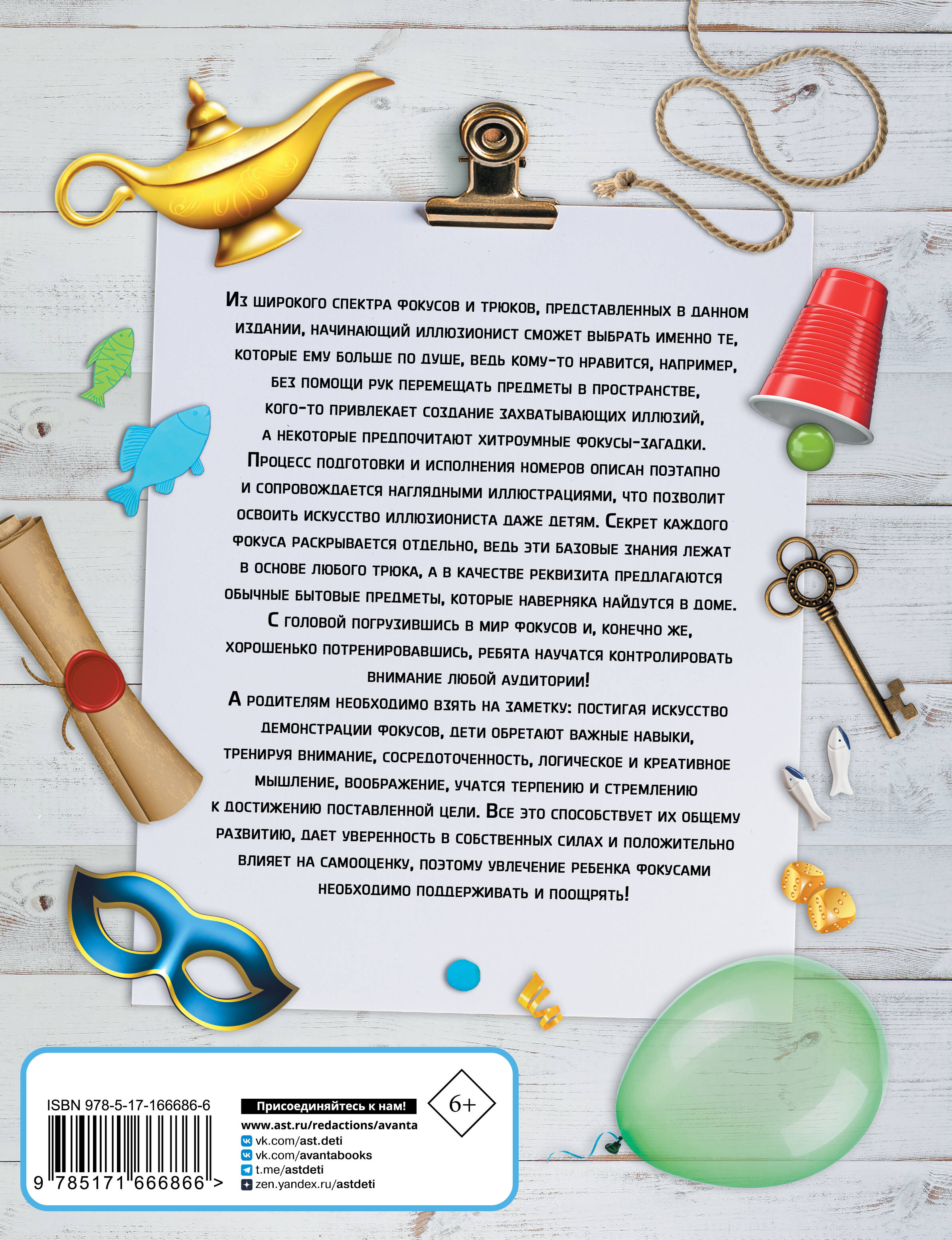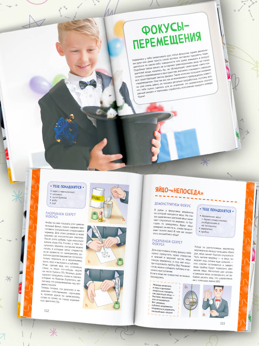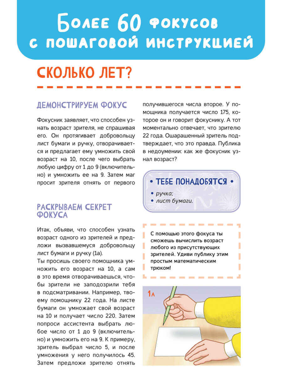 Фокусы и трюки - пожалуй, одна из самых загадочных сфер артистического искусства. В этой книге представлен широкий спектр зрелищных номеров как для начинающих, так и для более опытных иллюзионистов, которые смогут пополнить свой арсенал легко выполнимыми фокусами. Каждый шаг при подготовке к исполнению трюка и при его демонстрации подробно описан и сопровождается наглядными иллюстрациями, что делает постижение этого искусства доступным даже для детей. Носамое главное - для выполнения фокусов из этой книги не потребуется специальный реквизит: все необходимое можно найти в любом доме. И еще: помимо описания самого фокуса в данном издании присутствует теоретическая часть, гдераскрывается секрет трюка, что позволяет юным фокусникам сделать выводы о том, как важно уметь разгадывать загадки и постигать тайны, скрытые за видимой реальностью. А это, без сомнения, весьма занимательное занятие, которое может стать настоящим увлечением на всю жизнь. Для среднего школьного возраста.| Издательство | Издательство "АСТ" |