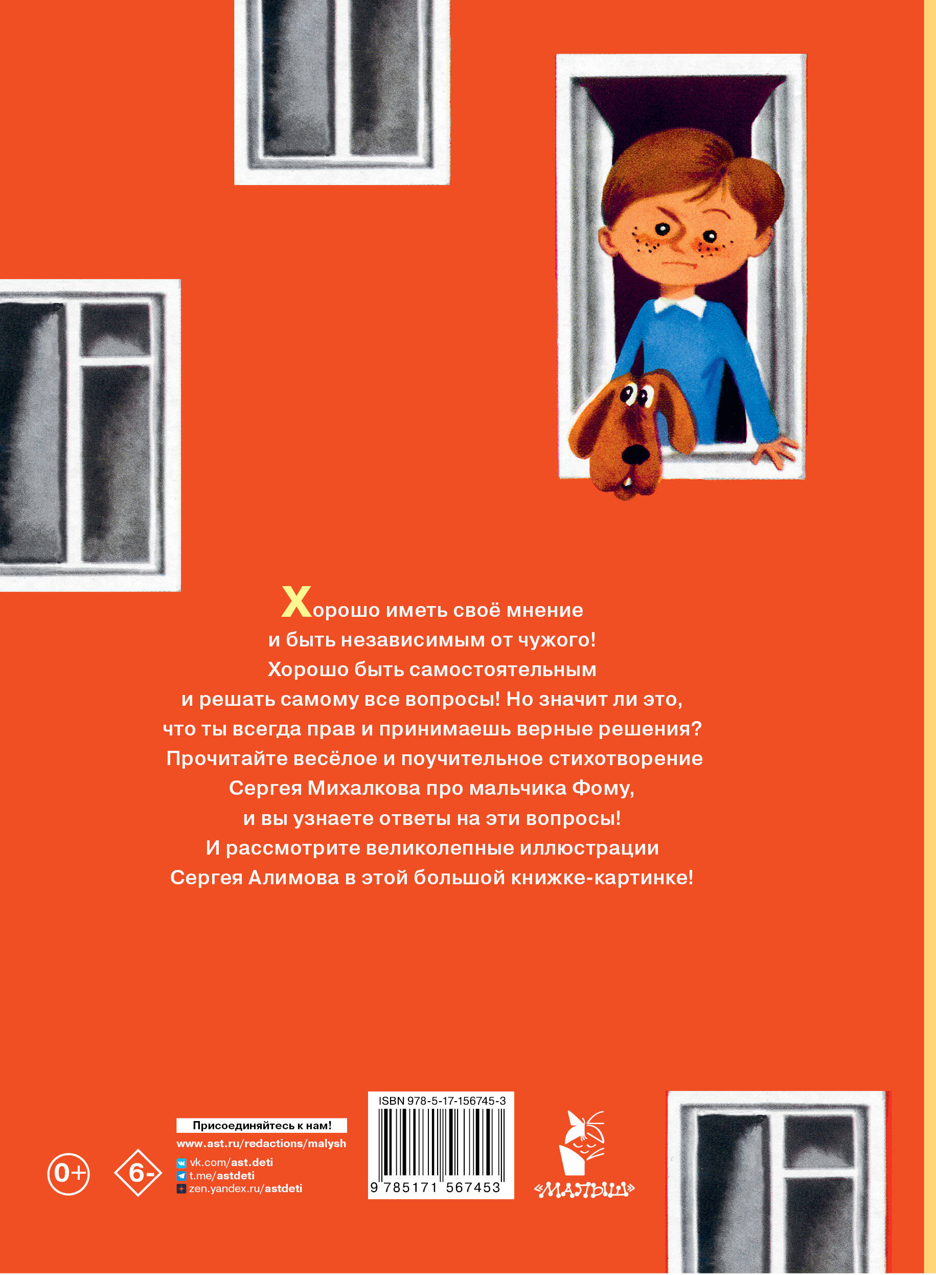 Хорошо иметь своё мнение и быть независимым от чужого! Хорошо быть самостоятельным и решать самому все вопросы! Но значит ли это, что ты всегда прав и принимаешь верные решения? Прочитайте весёлое и поучительное стихотворение Сергея Михалкова про мальчика Фому, и вы узнаете ответы на эти вопросы! И рассмотрите великолепные иллюстрации Сергея Алимова в этой большой книжке-картинке!| Издательство | ИЗДАТЕЛЬСТВО "АСТ" |