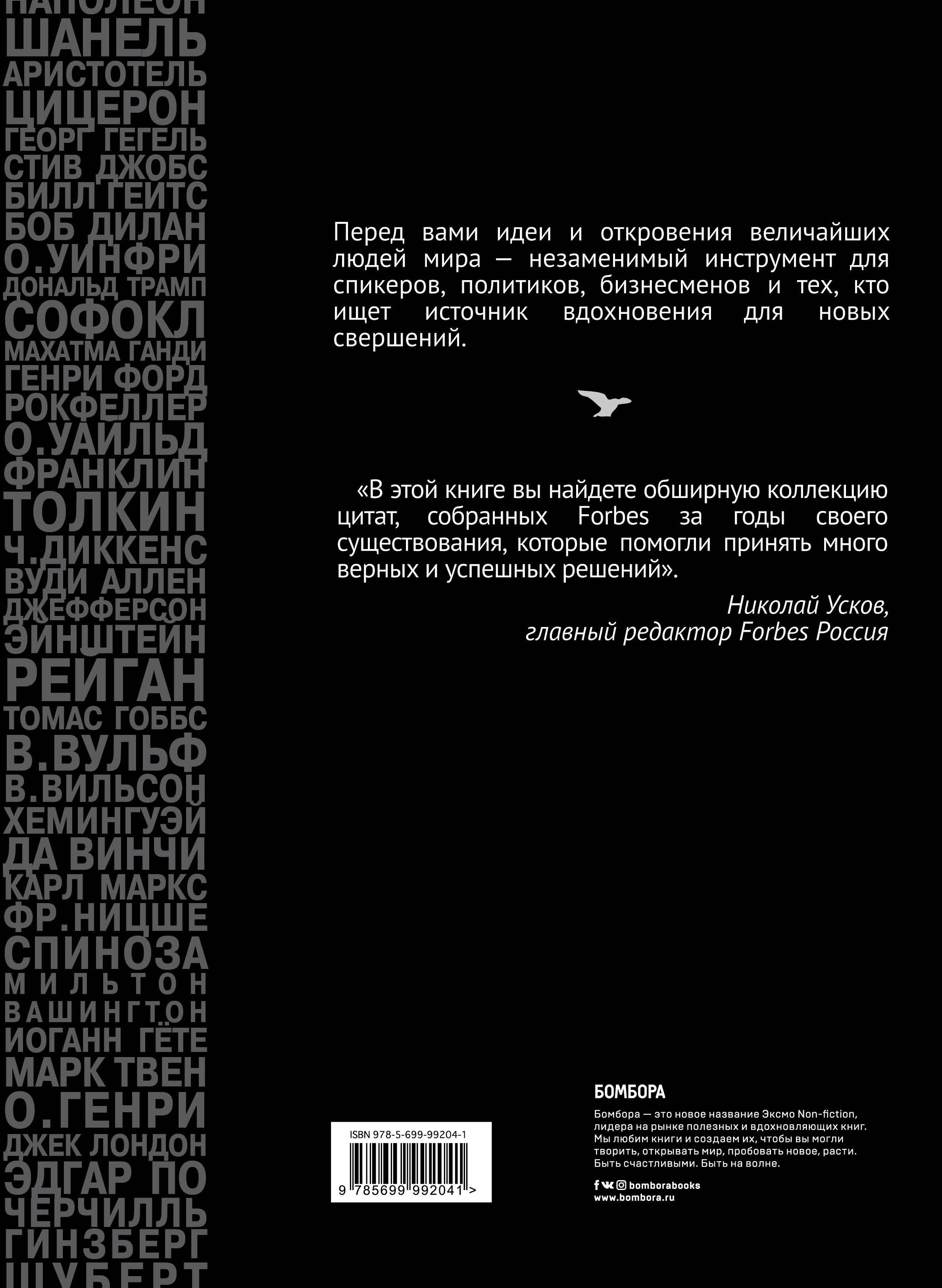 В 2017 году самому авторитетному финансово-экономическому журналу в мире исполняется 100 лет. За это время многое поменялось, однако раздел «Мысли о бизнесе и жизни», лежащий в основе этого издания, остался в числе популярных рубрик. Под одной обложкой редакторы Forbes собрали уникальную коллекцию из 10 000 мотивирующих, остроумных и проницательных высказываний. Цицерон, Аристотель, Гегель, Наполеон Бонапарт, Стив Джобс, Билл Гейтс, лауреат Нобелевской премии Боб Дилан и Опра Уинфри - в сборник вошли мысли профессионалов и мировых гениев. Вам откроется мудрость Махатмы Ганди, Генри Форда, Джона Д. Рокфеллера, Оскара Уайльда, Бенджамина Франклина, проницательность Джона Р.Р. Толкиена, Чарльза Диккенса, Вуди Аллена, Томаса Джефферсона, остроумие Альберта Эйнштейна, Рональда Рейгана, Вирджинии Вульф, Вудро Вильсона и Леонардо да Винчи. Перед вами идеи и откровения величайших людей мира - незаменимый инструмент для спикеров, политиков, бизнесменов и тех, кто ищет источник вдохновения для новых свершений.| Издательство | ООО "Издательство "Эксмо" |