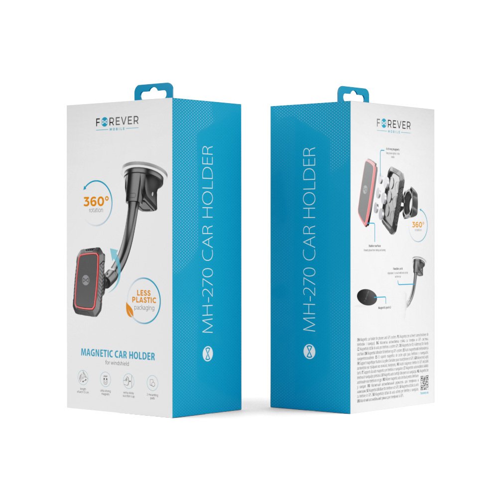 Магнитный держатель MH-270 от Forever - это уникальный продукт. Это простая и универсальная установка в любой автомобиль в сочетании с высоким качеством изготовления. Длинное оголовье с присоской и подвижной головкой-основанием обеспечивают идеальную функциональность. Оголовье с большой присоской приспособлено для установки на лобовое стекло автомобиля. Магнитный рычаг подвижен, а магнитное основание можно надежно зафиксировать, чтобы удерживать основание в одном и том же положении. Смартфон будет в безопасности на протяжении всего пути. Сильные магниты удерживают даже устройства с большими диагоналями экрана. В набор входят две магнитные наклейки. Вам просто нужно наклеить их на устройство или наложить поверх, чтобы держатель заработал.