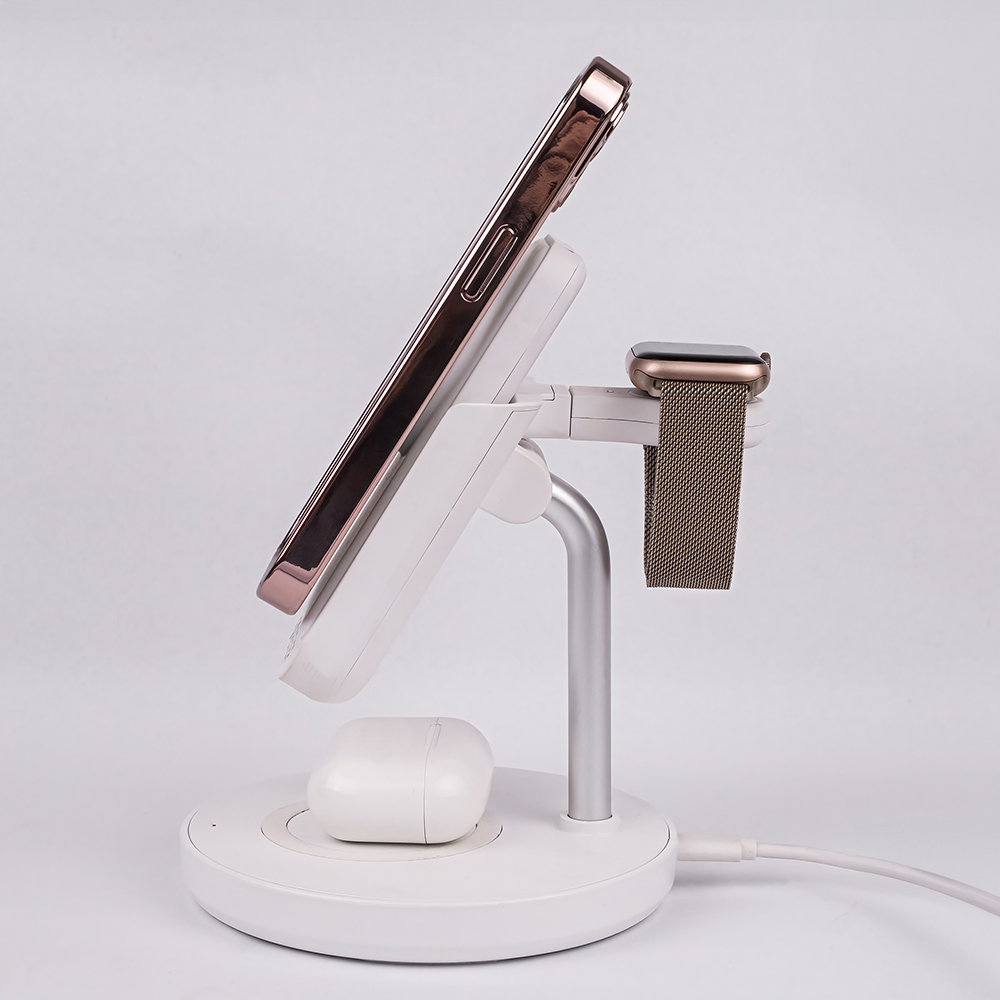 Магнитная беспроводная зарядная станция с Power Bank MACS-100 Магнитная беспроводная зарядная станция Forever 5-в-1 - это универсальное зарядное устройство, позволяющее одновременно заряжать 3 устройства. Совместимость с системой MagSafe и телефонами, поддерживающими беспроводную зарядку, обеспечивает беспроблемную зарядку различных моделей устройств. Устройство также оснащено встроенным портом USB-A. Кроме того, в комплект входит встроенный пауэрбанк емкостью 5000 мАч, который можно легко отсоединить и взять с собой в дорогу, гарантируя независимость и мобильность в любой ситуации. Это идеальное решение во время путешествий или в местах, где нет доступа к электрическим розеткам. В боковой части пауэрбанка встроен индикатор зарядки, а вентиляционные отверстия предназначены для отвода тепла, выделяемого при беспроводной зарядке. Он также оснащен портом USB-C, поддерживающим быструю зарядку мощностью 20 Вт. Банк питания также может заряжать AirPods с функцией MagSafe. Кроме того, он оснащен практичной подставкой, которая служит опорой во время зарядки телефона, что еще больше расширяет функциональность этого устройства. В комплект также входит зарядное устройство, совместимое с Apple Watch, подключаемое через порт USB-C, которое можно отсоединять и брать с собой в поездки. Это практичное решение, так как его можно подключить, например, к пауэрбанку, чтобы заряжать часы в любом месте. Станция оснащена быстрой беспроводной зарядкой. Магнитное крепление для телефона и опорная подставка обеспечивают оптимальное положение устройства во время зарядки, что не только облегчает процесс, но и повышает комфорт во время использования.
