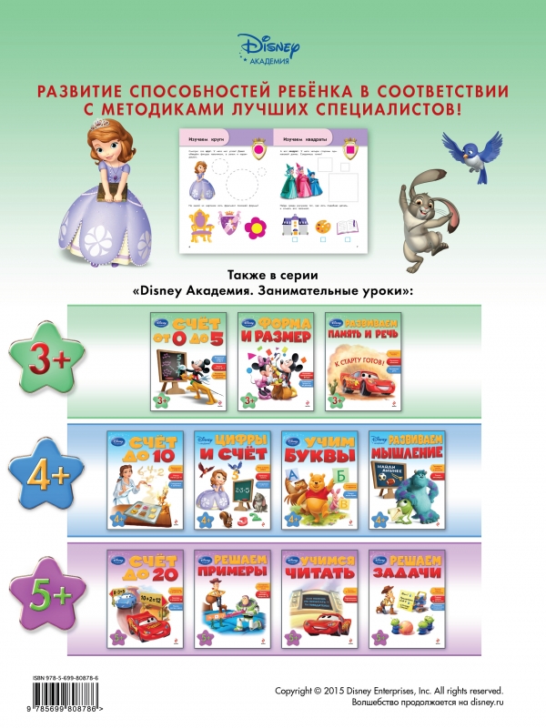 Книги серии «Disney. Занимательные уроки» являются незаменимыми помощниками в развитии вашего ребёнка. В них вы найдёте разнообразные увлекательные задания, которые позволят малышу приобрести навыки, необходимые для дальнейшего обучения в школе. Герои нового мультсериала Disney «София Прекрасная» помогут ребёнку не только быстро и легко запомнить основные цвета и геометрические фигуры, но и сделают процесс обучения более захватывающим. А в конце книги вы найдёте наградную медаль для малыша!