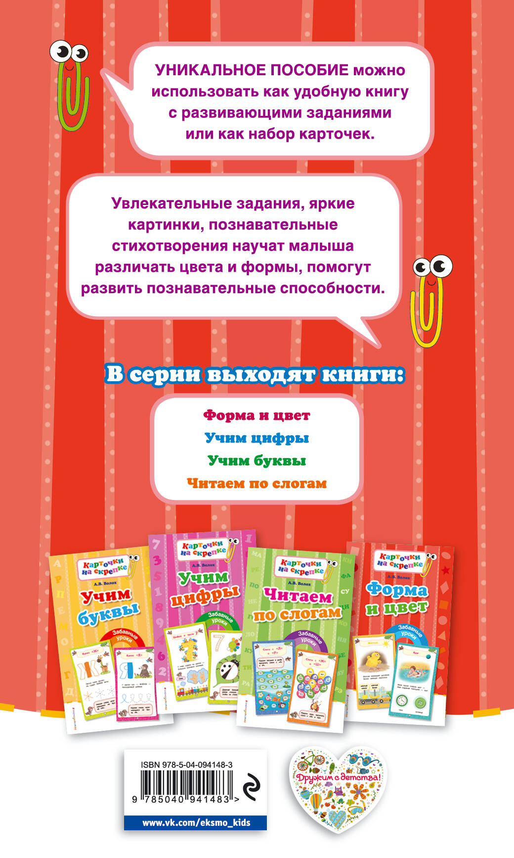 Книга очень удобна - ее можно использовать как пособие или как карточки, вырезав по указанным линиям. Разнообразные задания, яркие иллюстрации, познавательные стихотворения помогут малышу легко и быстро научиться различать и называть цвета и формы. Пособие удобно брать в дорогу, чтобы занять малыша полезным делом. Пособие поможет развить у ребенка: • мелкую моторику, • мышление и логику, • внимание и память, • речь и кругозор, • познавательный интерес.| Издательство | ООО "Издательство "Эксмо" |