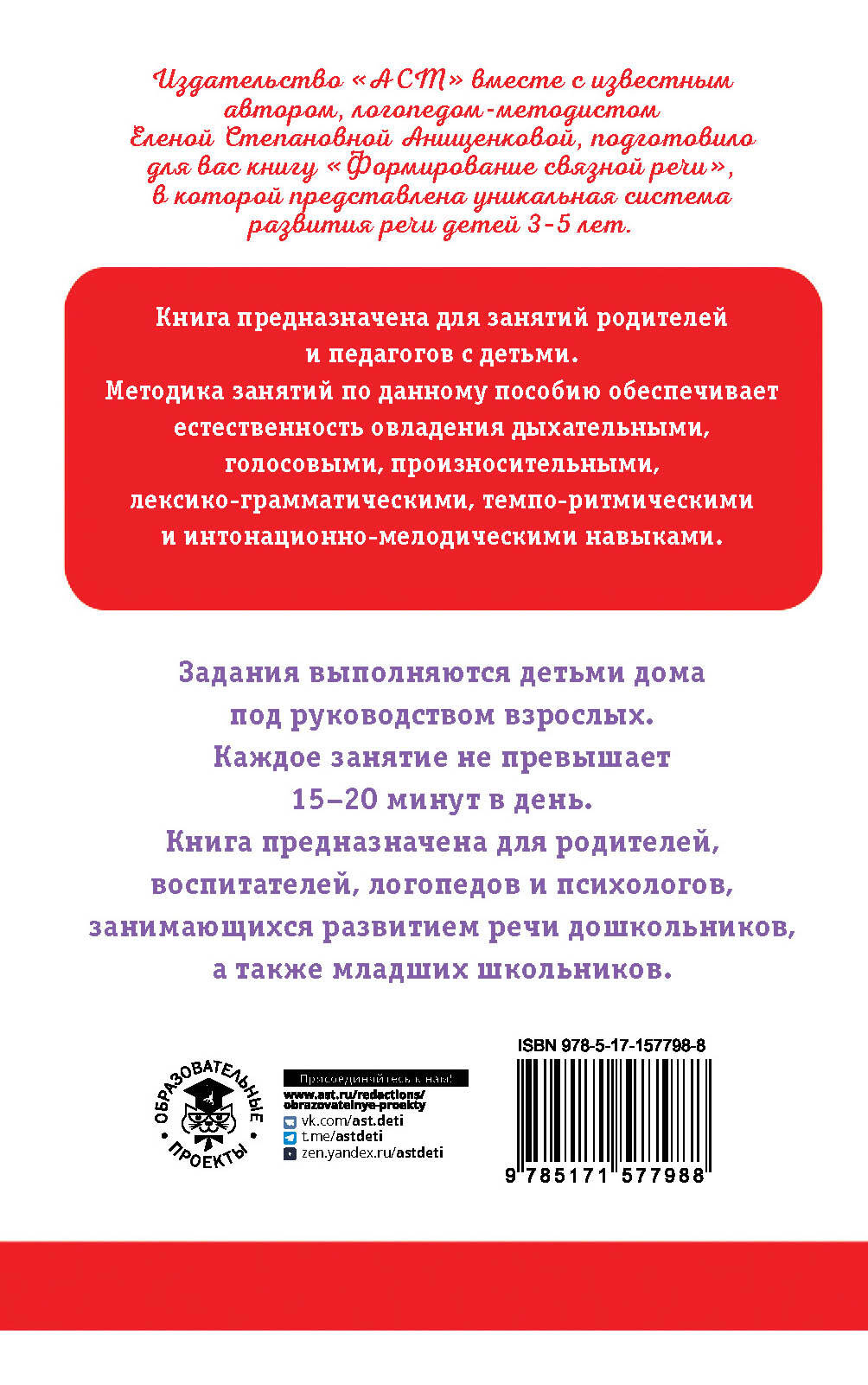 Издательство "АСТ" вместе с известным автором логопедом-методистом Еленой Степановной Анищенковой, подготовили книгу "Формирование связной речи", в которой представлена уникальная система развития речи детей 3-5 лет. Книга предназначена для занятий родителей и педагогов с детьми. Методика занятий по данному пособию обеспечивает естественность овладения дыхательными, голосовыми, произносительными, лексико-грамматическими, темпо-ритмическими и интонационно-мелодическими навыками. Задания выполняются детьми дома под руководством взрослых. Каждое занятие не превышает 15-20 минут в день. Книга предназначена для родителей, воспитателей и логопедов, занимающихся развитием речи дошкольников и младших школьников.| Издательство | ИЗДАТЕЛЬСТВО "АСТ" |