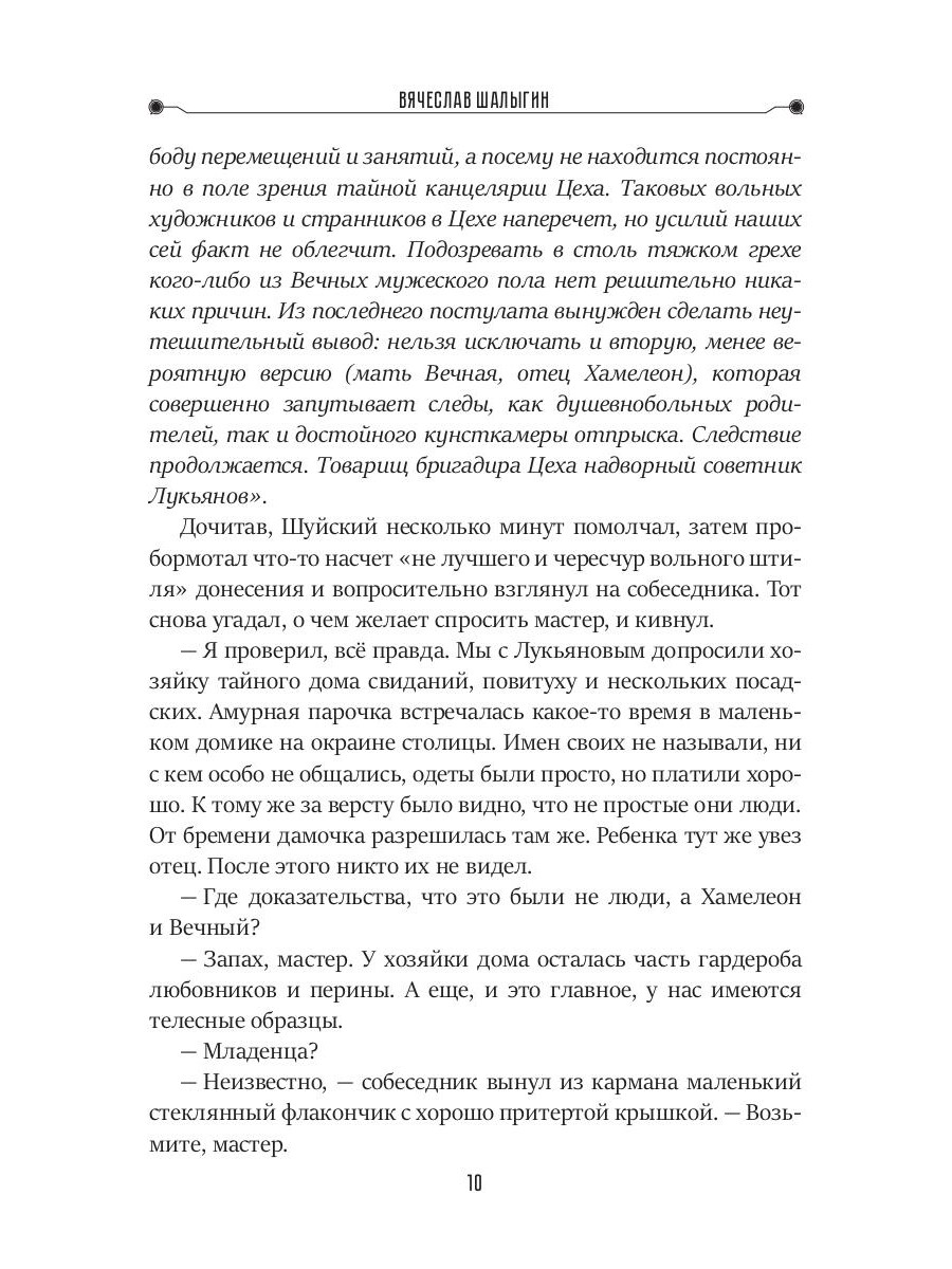 Люди мало знают даже о самих себе. Не совсем люди зачастую тоже не догадываются, что в них скрыто. Частный сыщик Виктор Туманов, до недавнего времени уверенный в том, что он стопроцентный человек, теперь и не знает, что о себе думать. Что он не человек, доказано. Но кто тогда? Вечный или Хамелеон? Или ни то, ни другое? Туманову очень важно это знать, поскольку он оказался меж двух тяжелых жерновов - Кланом Хамелеонов с одной стороны и Цехом Вечных с другой. Да поначалу Туманов принял сторону бессмертных и таких близких по духу Вечных, но попавшийся в ловушку Хамелеон пробудил в душе сыщика сомнения. Ведь не исключено, что Туманов это тот самый мальчик, потерянный двести лет назад одним из Вечных, надворным советником Лукьяновым. Плод запретной любви Вечной женщины и Хамелеона. Избранный из древнего пророчества. Впрочем, так это или нет не важно. Остановить «жернова», а заодно, возможно, и войну между Кланом и Цехом кроме Туманова все равно некому.| Издательство | Т8 RUGRAM |