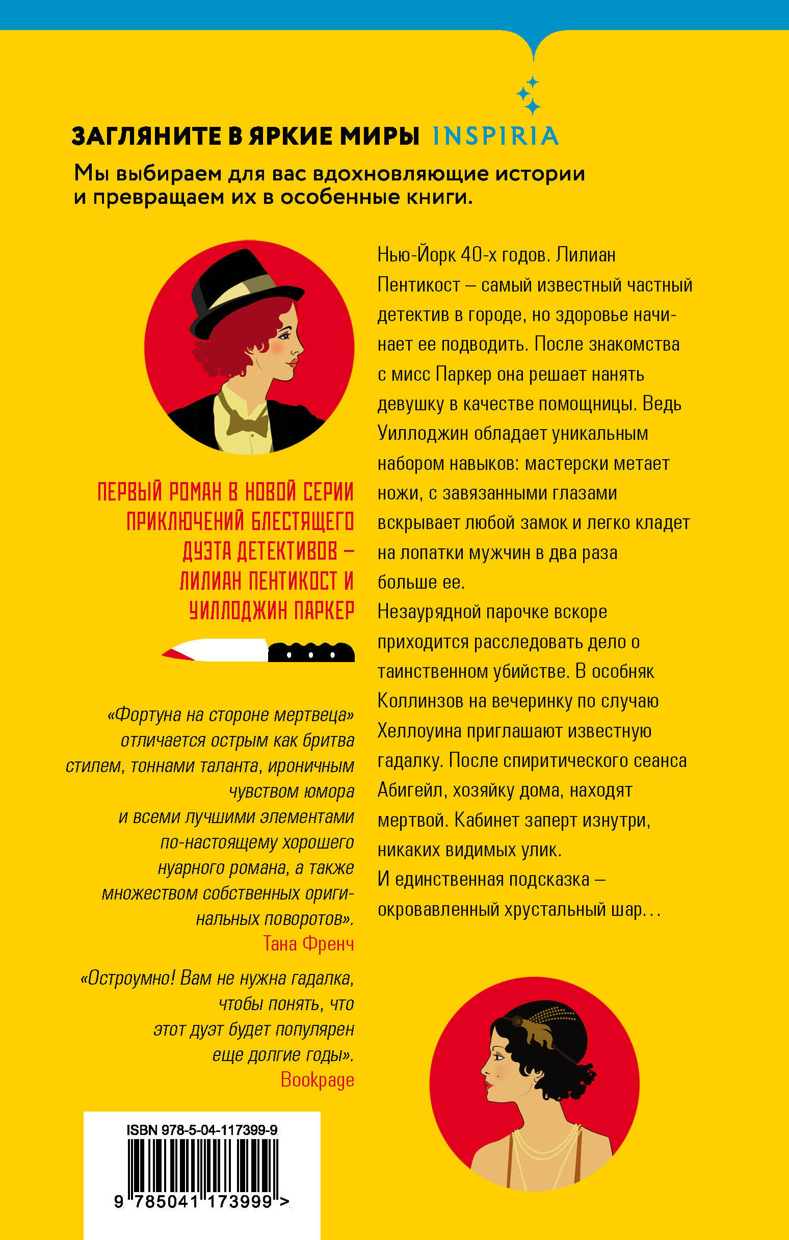 Нью-Йорк 40-х годов. Лилиан Пентикост - самый известный частный детектив в городе, но здоровье начинает ее подводить. После знакомства с мисс Паркер она решает нанять девушку в качестве помощницы. Ведь Уиллоджин обладает уникальным набором навыков: мастерски метает ножи, с завязанными глазами вскрывает любой замок и легко кладет на лопатки мужчин в два раза больше нее. Незаурядной парочке вскоре приходится расследовать дело о таинственном убийстве. В особняк Коллинзов, на вечеринку по случаю Хэллоуина, приглашают известную гадалку. После спиритического сеанса Абигейл, хозяйку дома, находят мертвой. Кабинет заперт изнутри, никаких видимых улик. И единственная подсказка - окровавленный хрустальный шар… Первый роман в новой серии приключений блестящего дуэта детективов - Лилиан Пентикост и Уиллоджин Паркер. «"Удача на стороне мертвеца" обладает острым как бритва стилем, тоннами таланта, ироничным чувством юмора и всеми лучшими элементами по-настоящему хорошего нуарного романа, а также множеством собственных оригинальных поворотов». - Тана Френч «Коварство, кровь, криминал и колкости: все ингредиенты классического детективного романа. Стивен Спотсвуд варит из них лучшее!» - Алан Брэдли «Спотсвуд берет суровый нуар 40-х, встряхивает его и придает ему незабываемого стиля. Мой новый любимый дуэт сыщиков - Пентекост и Паркер, духовные сестры Ниро Вулфа и Арчи Гудвина. Совершенно блестящий дебют!» - Дина Рейборн «Остроумно! Вам не нужна гадалка, чтобы понять, что этот дуэт будет популярен еще долгие годы» - Bookpage «Выдающийся дебют Спотсвуда придает классическому жесткому нуару современные черты. Глубокая и продуманная характеристика главных героев в сочетании с богатым на детали описанием и тонким юмором делает этот роман незабываемым». - Publishers Weekly| Издательство | ООО "Издательство "Эксмо" |