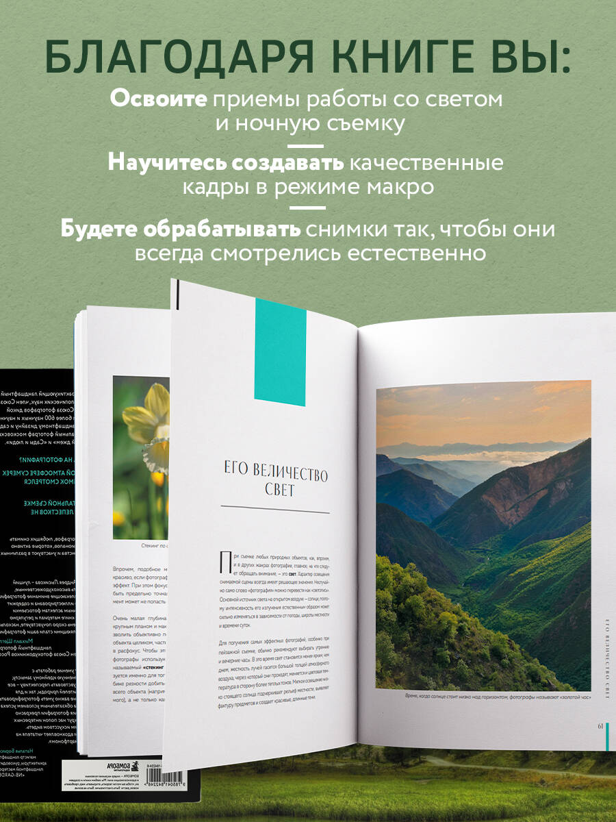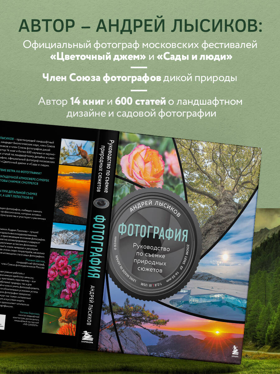 Любите фотографировать, но цветы при детальной съемке выглядят плоскими, а цвет лепестков искажается? Пытаетесь запечатлеть действие ветра на фотографии, но снимок выходит размазанным? Мечтаете заснять пейзаж в загадочной атмосфере сумерек? Как же передать всю красоту, удивительность и многогранность природы через фотографию? Все ответы вы найдете в этой книге! Автор делится своим мастерством и дает практические рекомендации по природной съемке, которые помогут усовершенствовать свои навыки как начинающему фотографу-любителю, так и профессионалу. Благодаря советам из книги вы узнаете об особенностях ночной съемки, научитесь создавать качественные кадры в режиме макро, а также поймете, как грамотно обрабатывать фотографии в графических редакторах так, чтобы снимки смотрелись естественно. Все методики, представленные в книге, наглядно иллюстрируются авторскими фотографиями. Андрей Лысиков - практикующий ландшафтный фотограф, кандидат биологических наук, автор 14 книг и более 600 научных и научно-популярных статей по ландшафтному дизайну и садовой фотографии, официальный фотограф московских фестивалей «Цветочный джем» и «Сады и люди». «Новая книга от гуру ландшафтной фотосъемки Андрея Лысикова - лучший мотиватор для всех, кто хочет научиться создавать высокохудожественные, эмоциональные, технически безупречные и привлекающие внимание фотографии. Книга написана доступным языком, великолепно иллюстрирована и содержит множество авторских примеров по самым различным аспектам фотосъемки природных сюжетов. Освоив весь изложенный в книге материал и регулярно применяя полученные знания на практике, вы очень скоро почувствуете, насколько более качественными, выразительными и впечатляющими стали ваши фотографии». - Михаил Щеглов, ландшафтный фотограф, член Союза фотохудожников России «Взгляд через объектив фотоаппарата развивает умение работать с пространством, выстраивать композицию, подчиненную идейному замыслу, создавать многоплановые пейзажные картины, чувствовать перспективу - все это будет полезным как для широкого круга любителей природы, так и для специалистов. Ландшафтному архитектору крайне важно уметь фотографировать, а фотогеничность рукотворного ландшафта стала обязательным условием успеха проекта. В книге Андрея Лысикова базовая теория фотографии прекрасно иллюстрирована авторскими снимками. Мир вокруг нас полон интересных моментов, и автор с удовольствием делится своим искусством видеть. Замечательная книга дает необходимые знания и вдохновляет читателя на творческие эксперименты с фотоаппаратом и смартфоном». - Наталья Борисова, магистр ландшафтной архитектуры, руководитель ландшафтной мастерской «NB-GARDEN»