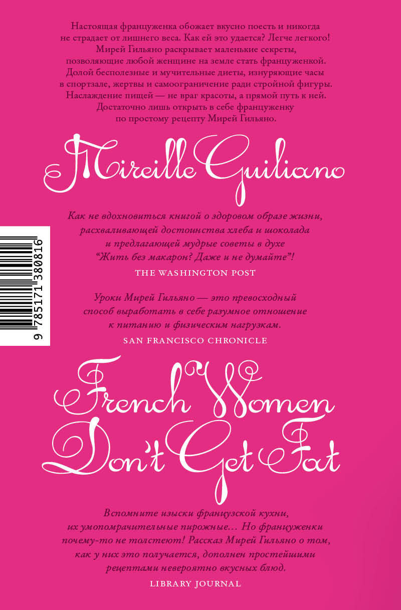 Хотите обрести стройную фигуру и хорошее настроение на всю жизнь, не прибегая к изнуряющим диетам, дающим лишь краткосрочный результат, не выдыхаясь в спортзалах, не напрягая до предела силу воли? Это отнюдь не утопия, и француженки - лучший тому пример. Они обожают хорошо поесть, не слишком жалуют активный спорт, всячески себя балуют и… не толстеют. Секреты их на удивление просты - чтобы стать француженкой, достаточно лишь желания и этой книги. Мирей Гильяно, в прошлом глава американского филиала компании Veuve Clicquot ("Вдова Клико"), стала известна на весь мир как автор бестселлеров о здоровом образе жизни. Мирей родилась и выросла во Франции, но после замужества переехала в США, где не уставала поражаться "эпидемии ожирения" и мучительной борьбе новых сограждан с лишним весом. И она решила поделиться опытом - написать книгу о том, как с помощью элементарных приемов (а также изысканных и легких рецептов!) похудеть навсегда, не отказываясь от радостей жизни и гастрономических удовольствий.| Издательство | ИЗДАТЕЛЬСТВО "АСТ" |