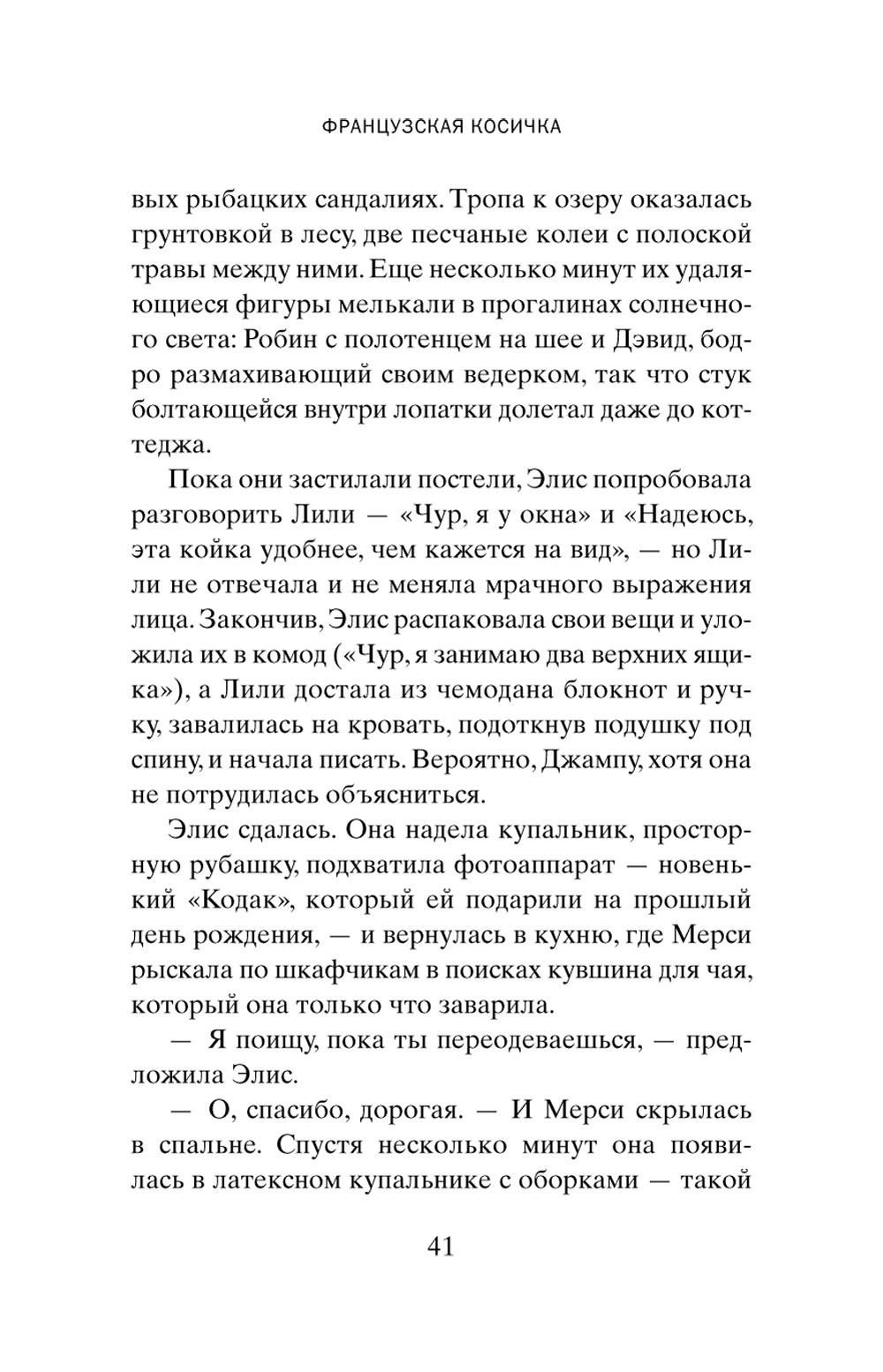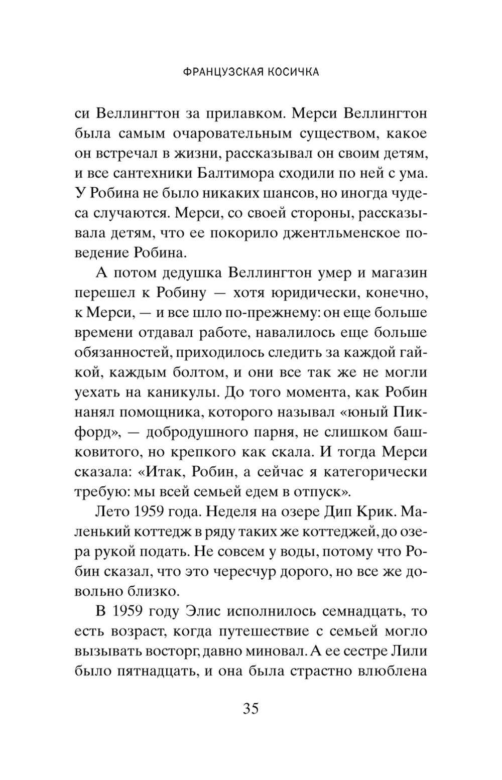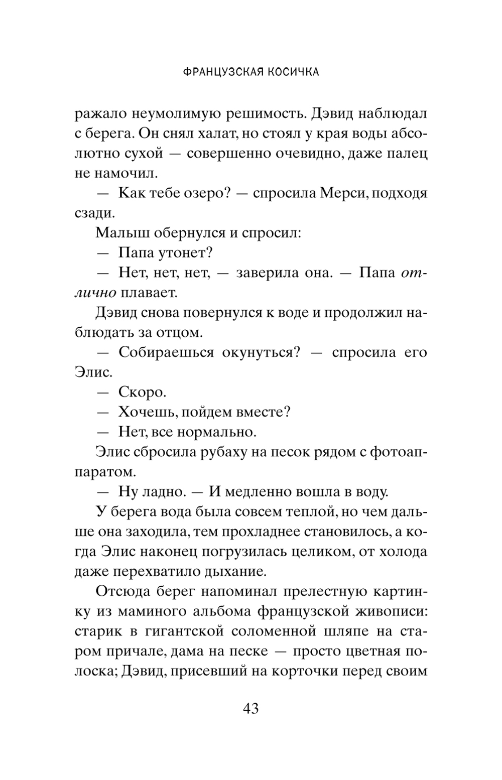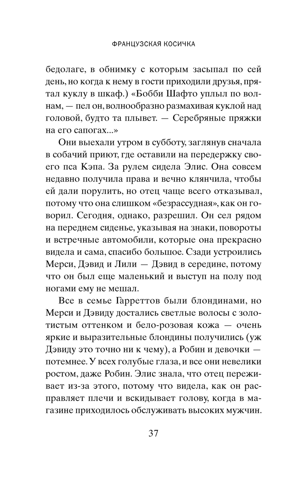 Новый роман всеми любимого классика. Теплый, чуть ироничный, проницательный. Это снова путешествие в мир обычной семьи. От 1950-х, когда за окном сигналит сверкающий красный «шевроле», до наших дней, окуклившихся в пандемии. Летом 1959 года Гарретты отправляются в свой первый и последний семейный отпуск. Они почти не покидают съемный коттедж, но в каком-то смысле они никогда не были так далеки друг от друга. После той поездки все в семье незаметно, но все уверенней начинают отдаляться друг от друга. Мерси с трудом сопротивляется зуду - она так сильно хочет стать художницей. Но кто тогда будет заботиться о доме, готовить обеды для мужа Робина? Ее дочери, уравновешенная Элис и помешанная на мальчиках Лили, совершенно не похожи друг на друга и не находят общего языка. Их младший брат Дэвид, уехав учиться, почти разрывает связи с семьей. И все же что-то соединяет их всех, несмотря на все разногласия и непонимание, что-то неуловимое. И каждый член этой вроде бы разобщенной семьи оказывает влияние на жизнь всех остальных. Потому что семья - это нечто более глубокое, чем просто родственные отношения, семья - словно французская косичка: ты думаешь, что сбежал от родных, но освободиться от них невозможно, они, точно завитки распущенной косички, все равно сплетены. Полная любви к людям, надежды, радости, смешанной с горечью, «Французская косичка» - это классическая история Энн Тайлер. Удивительно проницательный роман о семейных безднах, о невозможности освободиться от тех, кто любит нас.