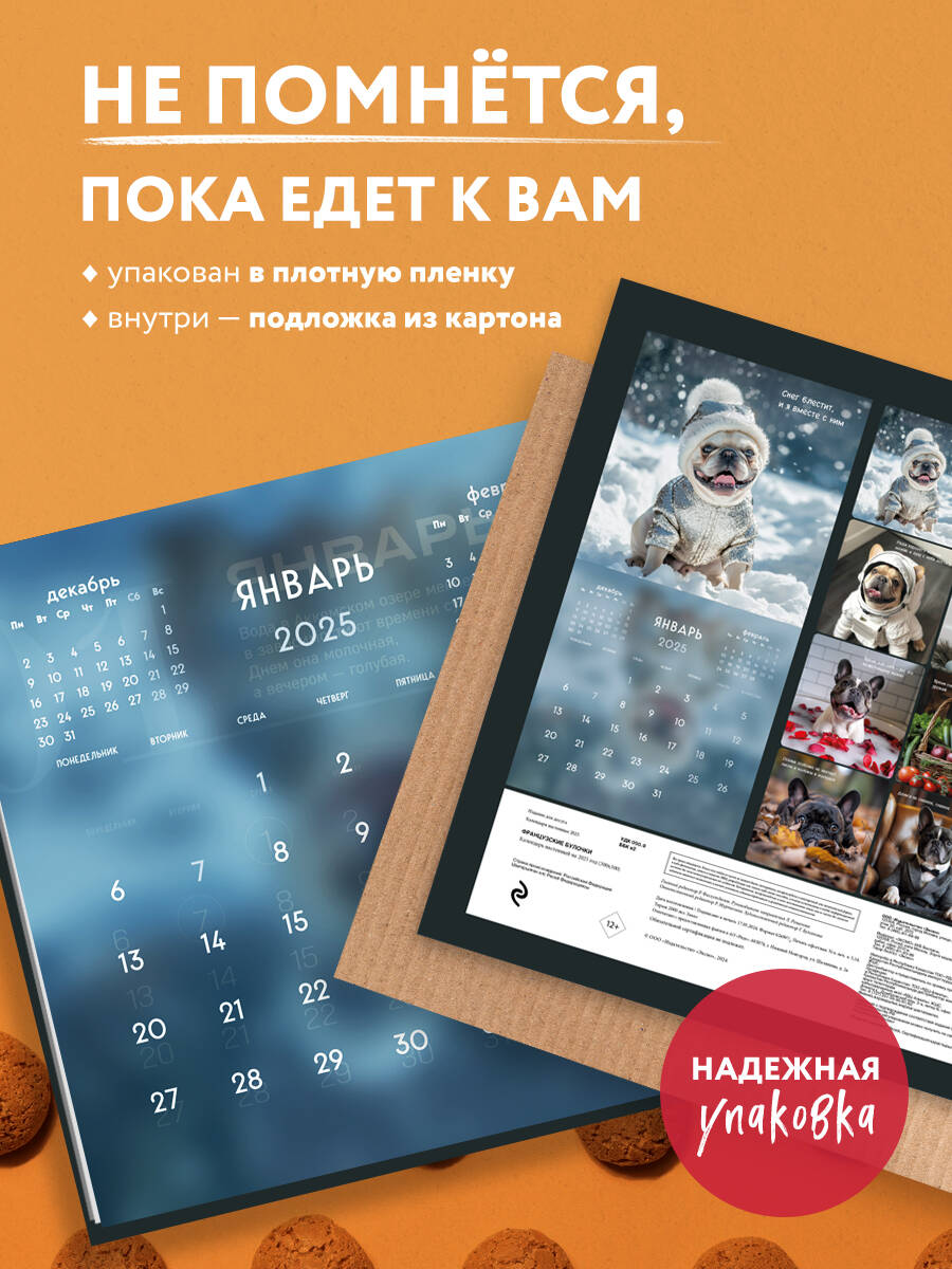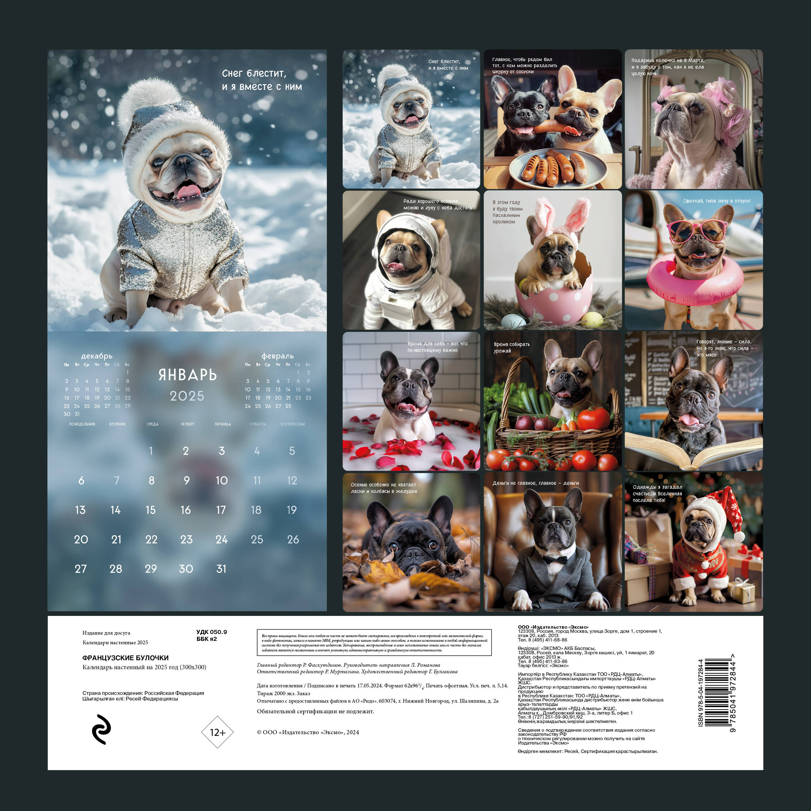 О серии: Наши настенные календари отличаются высоким качеством исполнения! Тщательно подобранные иллюстрации, напечатанные на матовой бумаге высочайшего качества, станут настоящим украшением дома, а в календарной сетке найдется место для ваших планов: большие клетки позволят делать записи и организовать свой год! В календаре также отмечены все государственные праздники. В серии настенных календарей издательства «ЭКСМО» каждый найдет тему по вкусу: великие художники, великолепные подборки с самыми знаменитыми произведениями искусства, легендарные кинематографические саги и игры, главные книжные авторы и бестселлеры, фотографии и иллюстрации любимых животных и многое-многое другое! О календаре: Забавный календарь с милыми французскими бульдогами, чьи изображения родились благодаря нейросети. Для кого: Календарь с милыми собачками и смешными фразами идеально подойдет в качестве подарка владельцам бульдогов, заводчикам и просто почитателям породы. Технические параметры: - Тип календаря - настенный перекидной. - Год - 2025. - Календарная сетка - с разбивкой по месяцам. - Вид скрепления - скрепка. - Ширина - 30 см. - Высота - 30 см. - Внутренний блок - мелованная бумага 115 г/м2. - Подложка - плотный гофрокартон для поддержания формы. - Индивидуальная упаковка в плотный целлофановый пакет.| Издательство | ООО "Издательство "Эксмо" |