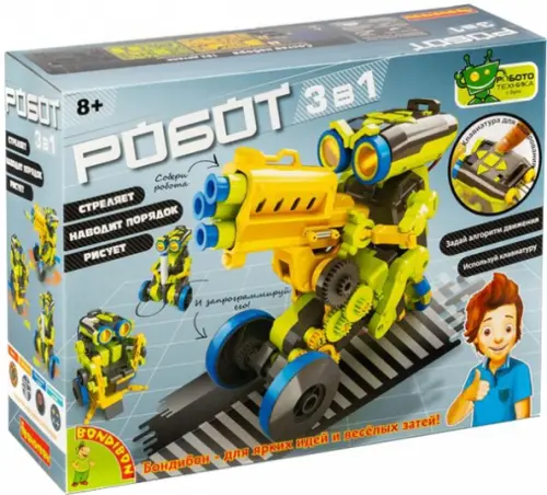 Трибот - уникальный программируемый робот типа "Сделай сам". Этот замечательный исполнительный приятель спроектирован таким образом, чтобы воодушевить любого человека на изучение начального уровня кодирования без использования цифровых устройств (компьютера, планшета, мобильного телефона). Ты можешь собирать и переставлять все части робота в 3-х разных конструкциях: стрелок, художник и уборщик. Робот не требует подключения к электросети, его кодирующая система находится в верхней части его головы, и дети могут легко запрограммировать его на выполнение каких-либо действий, а понять, как это делать, не составит большого труда! Система программирования позволяет роботу двигаться в 8 разных направлениях. Для программирования надо всего лишь нажимать на кнопки и наблюдать, как робот будет выполнять различные команды!