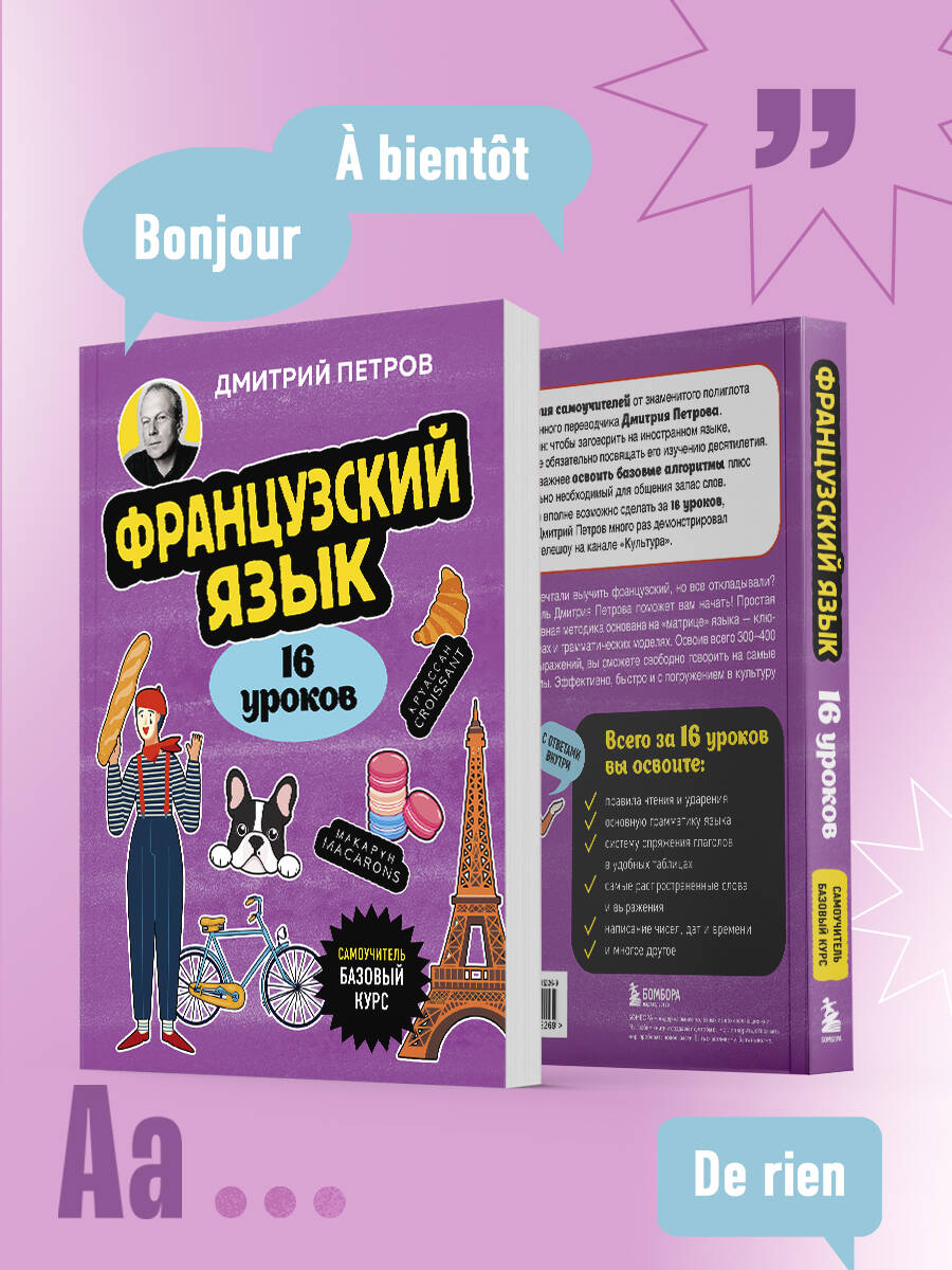 Это серия самоучителей от знаменитого полиглота и синхронного переводчика Дмитрия Петрова. Он уверен: чтобы заговорить на иностранном языке, совсем не обязательно посвящать его изучению десятилетия. Гораздо важнее освоить базовые алгоритмы, плюс - минимально необходимый для общения запас слов. И все это вполне возможно сделать за 16 уроков, что сам Дмитрий Петров много раз демонстрировал в своем телешоу на канала "Культура".| Издательство | ООО "Издательство "Эксмо" |