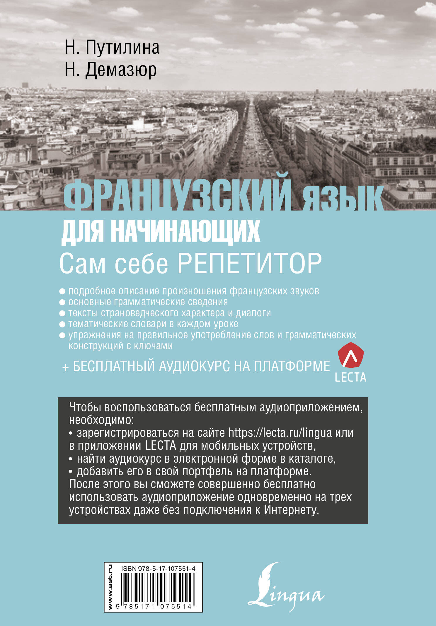 «ФРАНЦУЗСКИЙ ЯЗЫК ДЛЯ НАЧИНАЮЩИХ. САМ СЕБЕ РЕПЕТИТОР» Популярные авторы пособий по французскому языку Н.Демазюр и Н.Путилина предлагают в этом самоучителе: - подробное описание произношения французских звуков - основные грамматические сведения (в объеме уровней А1 - А2+) - тексты страноведческого характера и диалоги - тематические словари в каждом уроке - упражнения на правильное употребление слов и грамматических конструкций с ключами Издание снабжено бесплатным аудиокурсом на платформе Lecta. Его можно скачать на сайте https://lecta.ru/lingua, предварительно зарегистрировавшись, и потом использовать на 3 устройствах даже без подключения к Интернету. Для всех, кто решил начать изучение французского языка.| Издательство | Издательство "АСТ" |