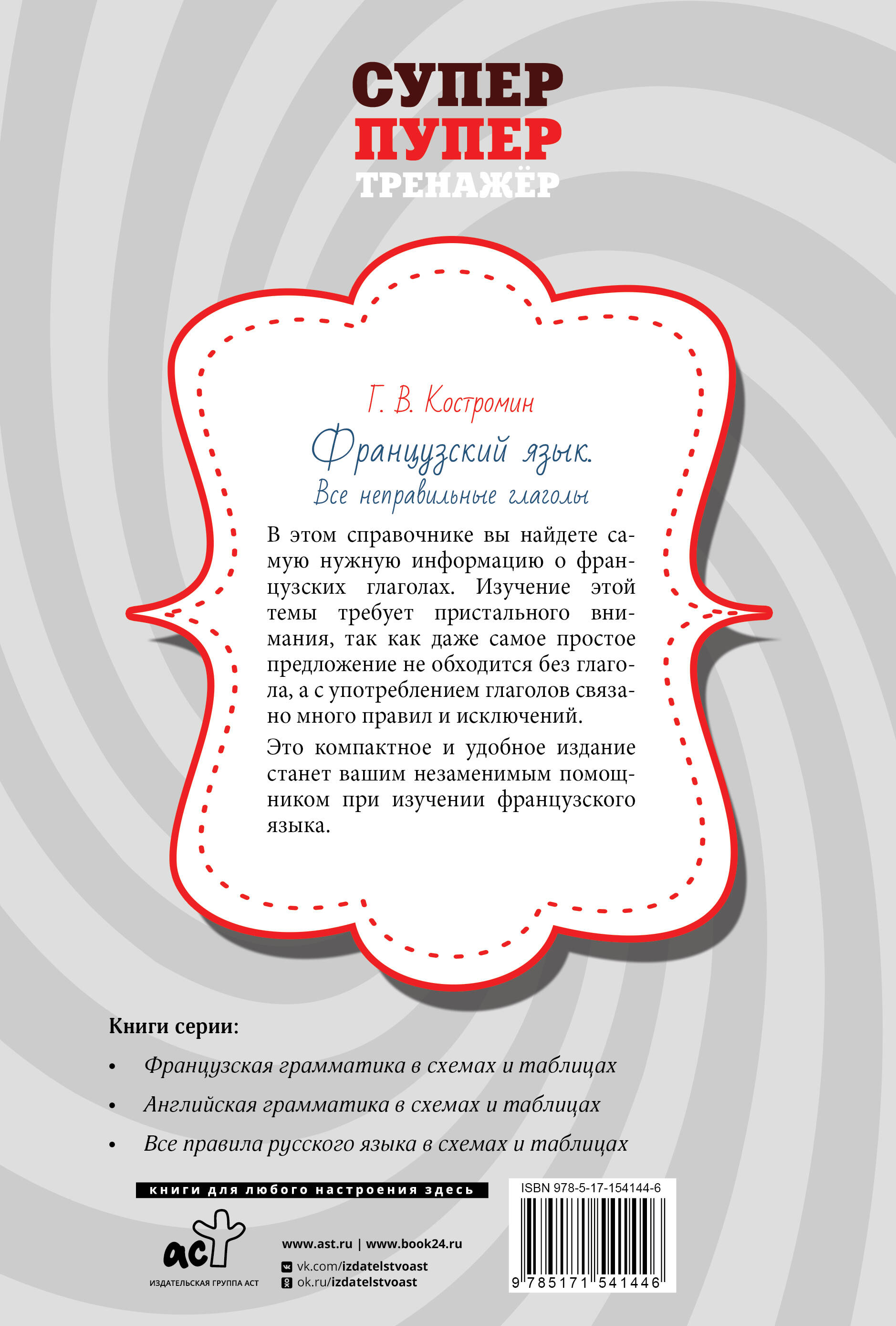 Костромин Георгий Васильевич - автор популярных пособий по французскому языку, преподаватель с многолетним опытом работы со школьниками и студентами. В этом справочнике вы найдете самую нужную информацию о французских глаголах. Изучение этой темы требует пристального внимания, так как даже самое простое предложение не обходится без глагола, а с употреблением глаголов связано много правил и исключений. Это компактное и удобное издание станет вашим незаменимым помощником при изучении французского языка. Учебный материал соответствует знанию языка на уровнях А1 и A2.| Издательство | ИЗДАТЕЛЬСТВО "АСТ" |