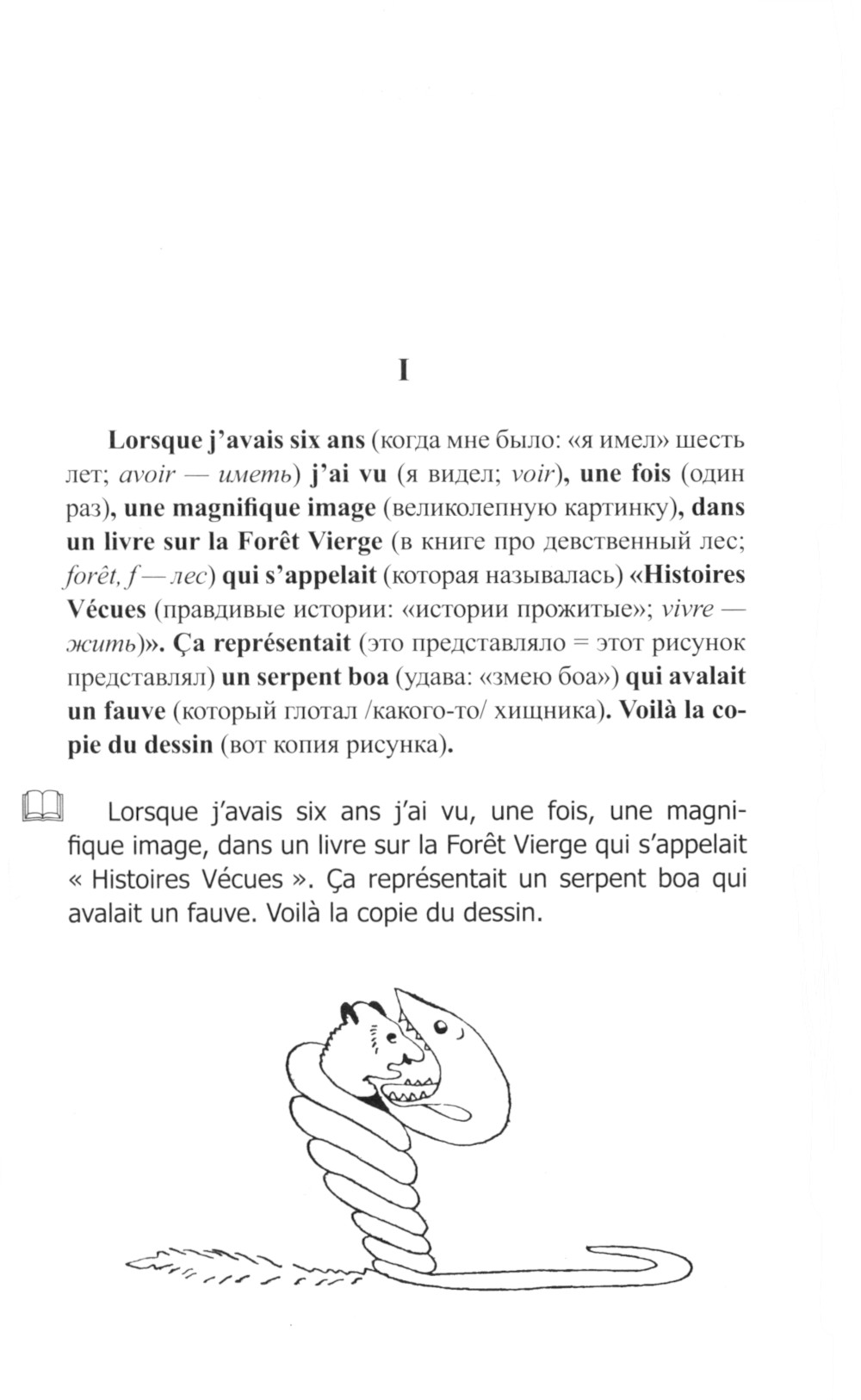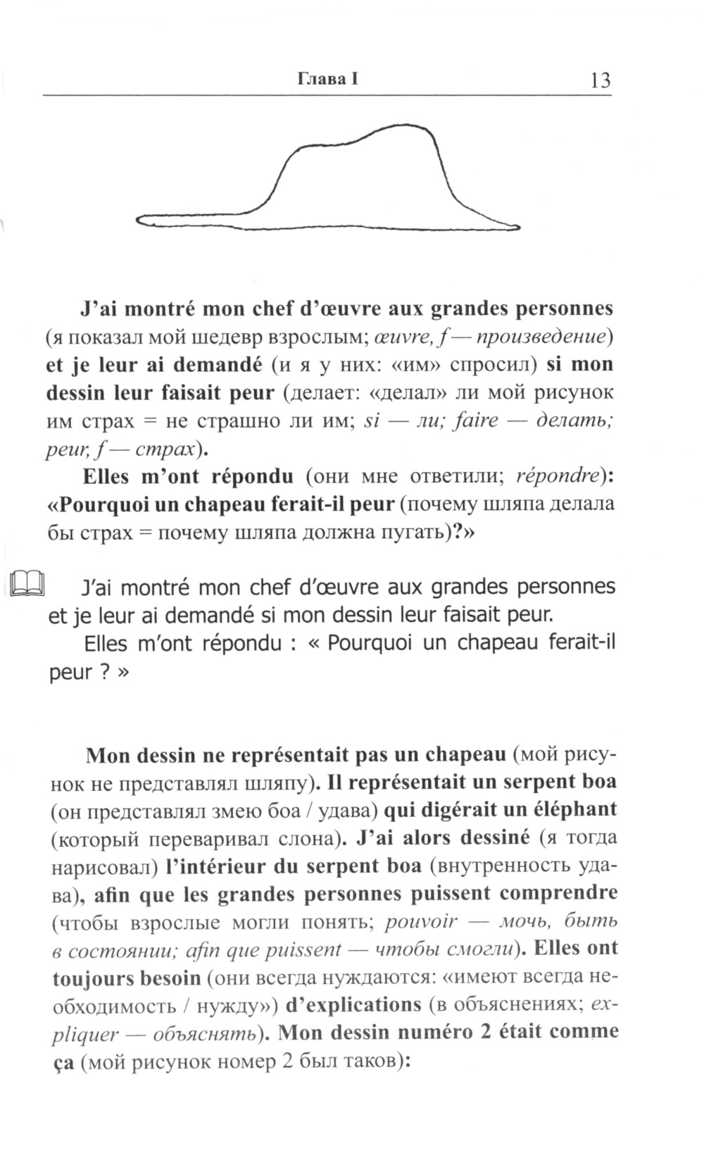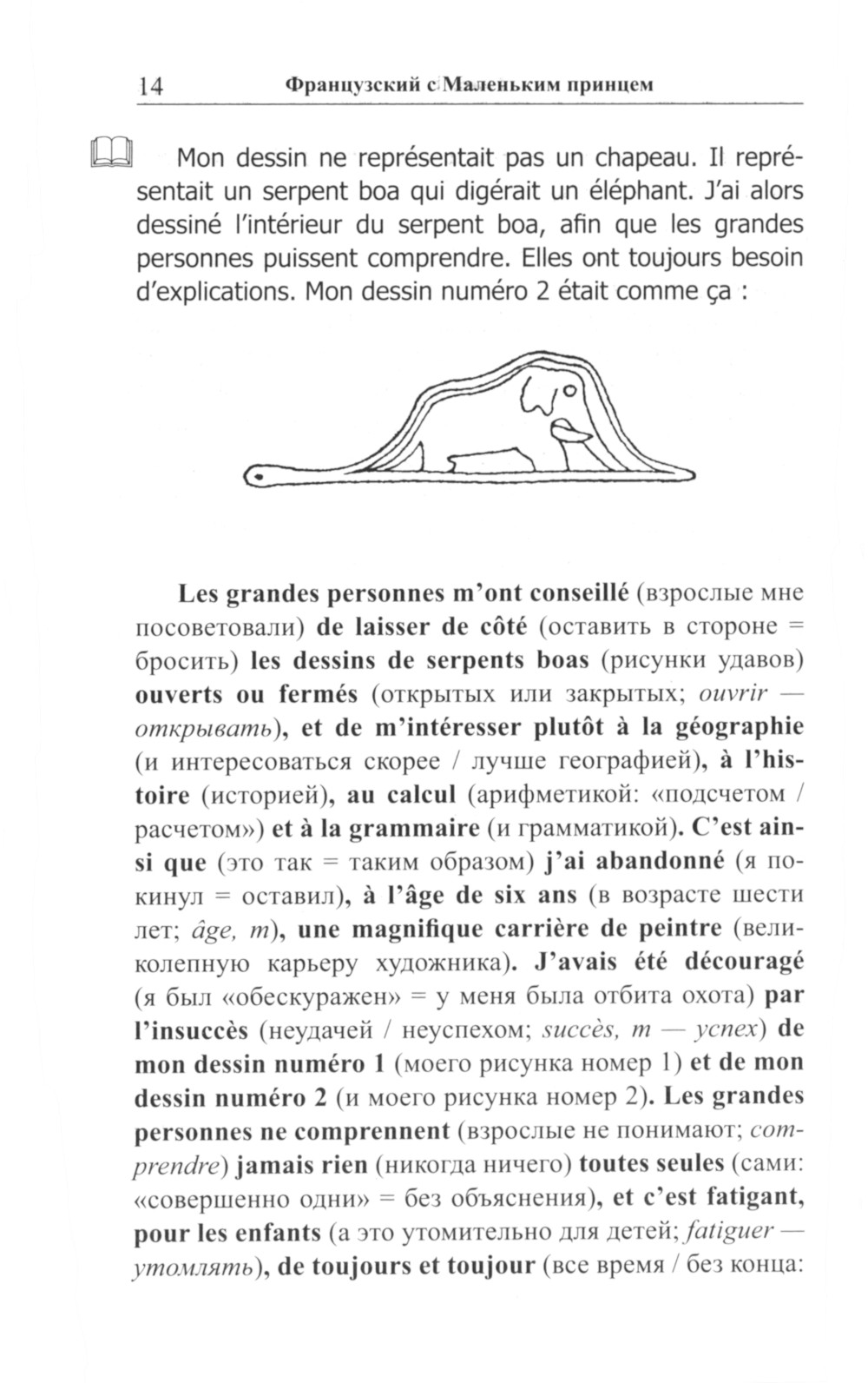 В книге предлагается сказочная повесть Антуана де Сент-Экзюпери «Маленький принц», адаптированная (без упрощения текста оригинала) по методу Ильи Франка. Уникальность метода заключается в том, что запоминание слов и выражений происходит за счет их повторяемости, без заучивания и необходимости использовать словарь. Кроме того, читатель привыкает к логике французского языка, начинает его «чувствовать». Пособие способствует эффективному освоению языка, может служить дополнением к учебной программе. Предназначено для широкого круга лиц, изучающих французский язык и интересующихся французской культурой.| Издательство | Восточная книга |