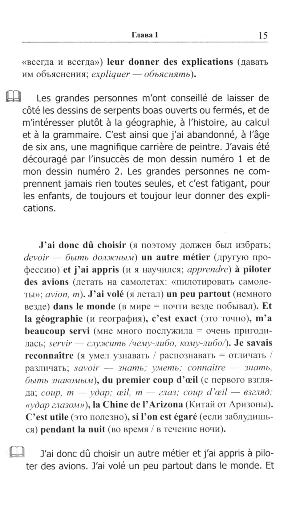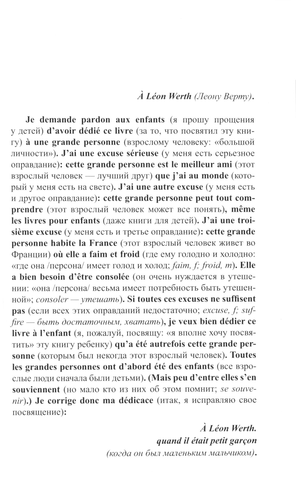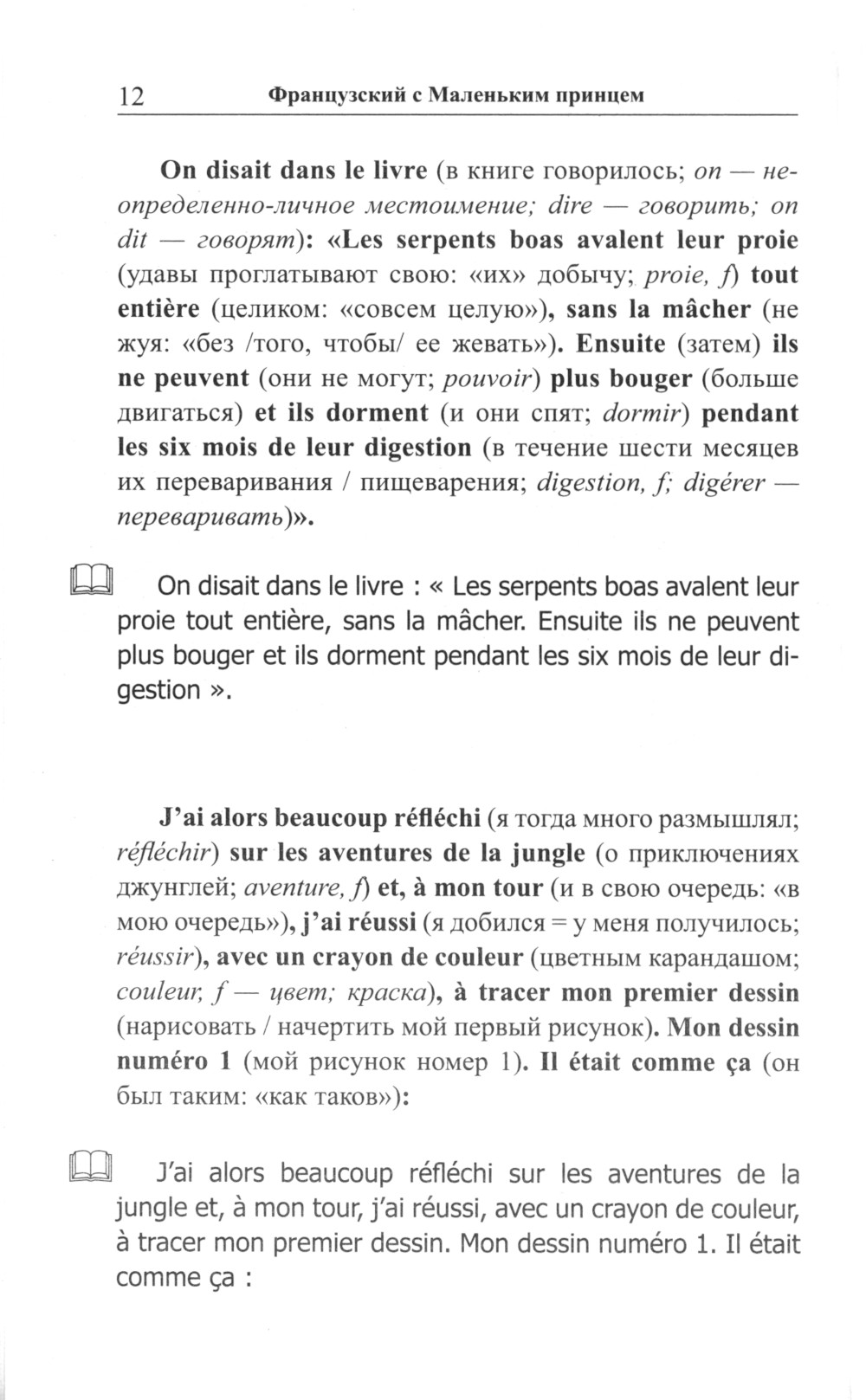 В книге предлагается сказочная повесть Антуана де Сент-Экзюпери «Маленький принц», адаптированная (без упрощения текста оригинала) по методу Ильи Франка. Уникальность метода заключается в том, что запоминание слов и выражений происходит за счет их повторяемости, без заучивания и необходимости использовать словарь. Кроме того, читатель привыкает к логике французского языка, начинает его «чувствовать». Пособие способствует эффективному освоению языка, может служить дополнением к учебной программе. Предназначено для широкого круга лиц, изучающих французский язык и интересующихся французской культурой.| Издательство | Восточная книга |