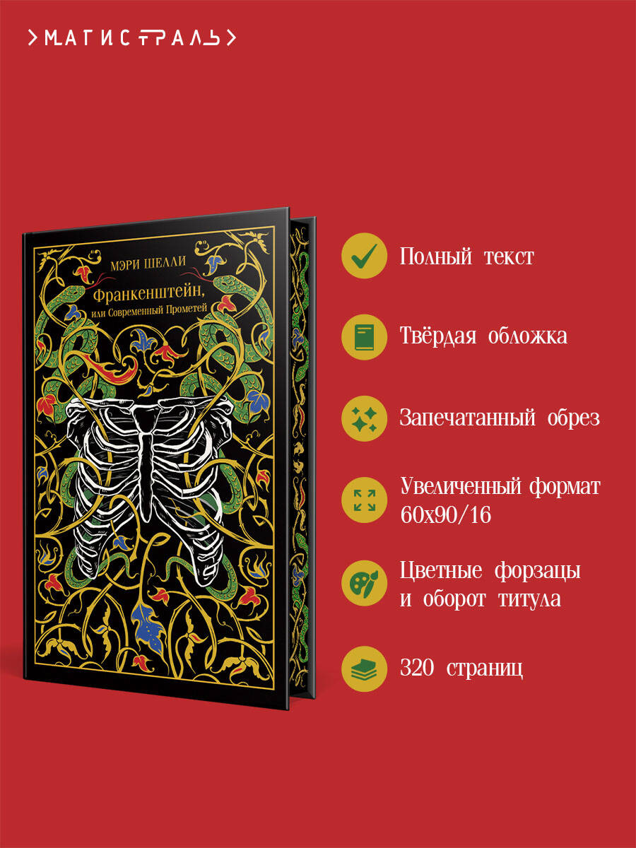 Новая серия классики для поклонников «Магистраль. Главный тренд» в твёрдой обложке. Безупречность стиля, лаконичность, тактильные материалы, цветные форзацы, рисунок на обрезе. Это пугающая и мрачная история о гениальном ученом и его страшном творении. Виктор Франкенштейн постиг тайну зарождения жизни и научился оживлять безжизненную материю. Он мечтал победить смерть и создал монстра из частей трупов. Однако стремление к славе и признанию привело к ужасающе трагическим последствиям... Замысел и первые эпизоды романа «Франкенштейн, или Современный Прометей» (1818) возникли как импровизация на заданную тему - сочинение страшных историй, инициированное лордом Байроном на швейцарской вилле Диодати летом 1816 года, а образ чудовища, сотворенного главным героем, явился автору - восемнадцатилетней англичанке Мэри Шелли - в ночном кошмаре. Однако, несмотря на юный возраст начинающей писательницы и почти случайные обстоятельства создания книги, «Франкенштейну» суждено было стать событием национальной и мировой литературы. Классика научно-фантастической прозы, шедевр романтической готики, оригинальный философский роман, источник знаковых образов современной культурной мифологии - таков далеко не полный ряд расхожих определений этого впечатляющего литературного дебюта. Трагический сюжет, придуманный автором, породил множество подражаний, переложений и продолжений - в художественной прозе, драматургии, театре и, разумеется, кинематографе. Настоящее издание подробно комментировано. В ноябре 2025 на экране выходит фильм Гильермо дель Торо «Франкенштейн», а в 2026 нас ждет еще одна премьера - фильм «Невеста» Мэгги Джилленхол, ремейк классического кинофильма «Невеста Франкенштейна» 1935 года. Оба фильма сняты по мотивам произведения Мэри Шелли.| Издательство | ООО "Издательство "Эксмо" |