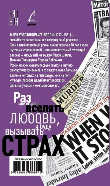 Мэри Уолстонкрафт Шелли (1797-1851) - английская писательница и литературный редактор. Свой самый известный роман она написала в 18 лет в ходе шуточных соревнований - кто напишет самый пугающий рассказ - между ней, ее мужем Перси Шелли, Джоном Полидори и Лордом Байроном. Роман можно назвать первым опытом в научно-фантастическом жанре; его сюжет оказал большое влияние не только на литературу, но и на поп-культуру, породив целый пласт рассказов фильмов ужасов и компьютерных игр.| Издательство | Яуза-каталог ООО |