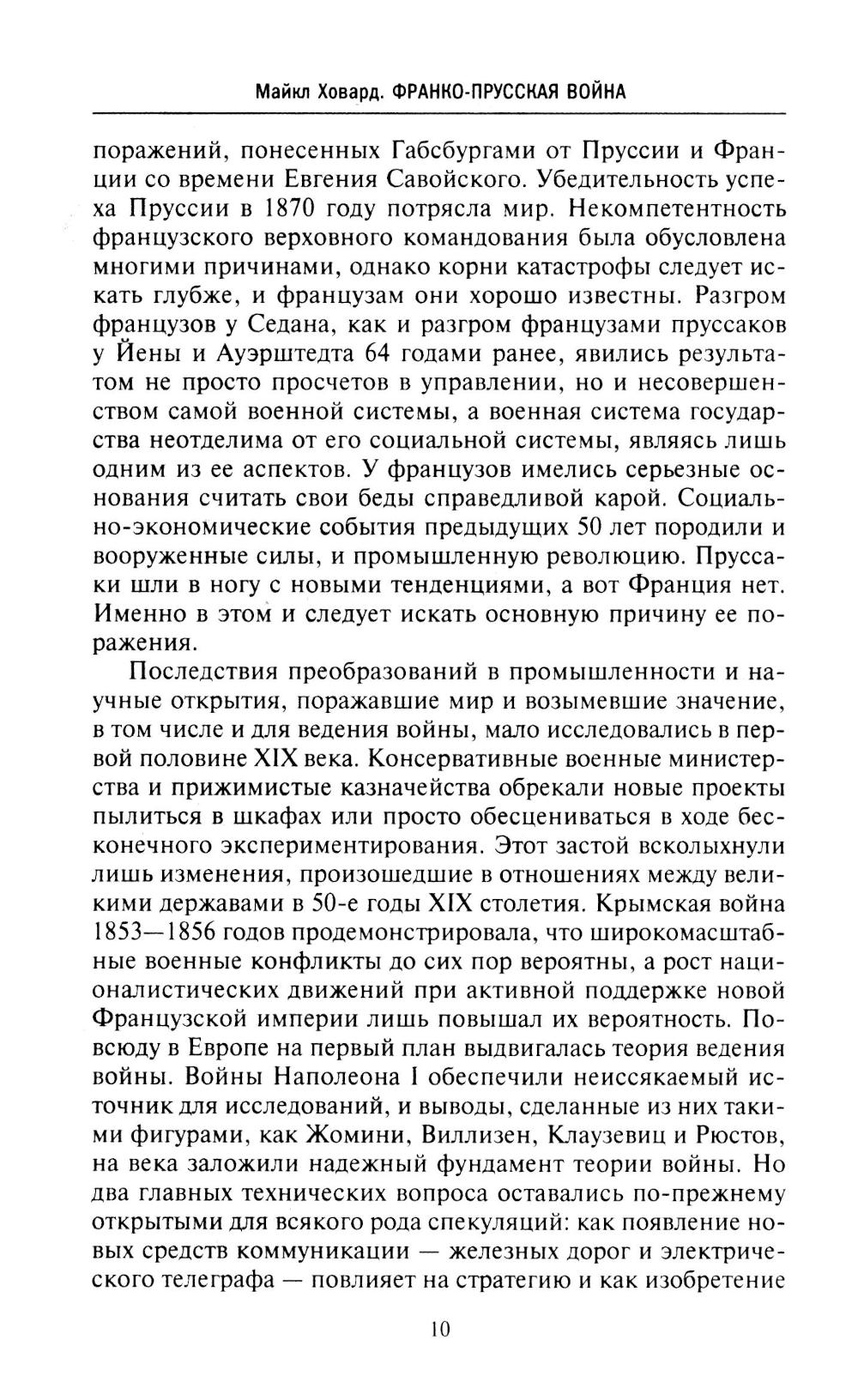 Британский военный историк, профессор Оксфордского университета посвятил свой труд военному конфликту между империей Наполеона III и германскими государствами во главе с Пруссией. Война, спровоцированная прусским канцлером О. Бисмарком и формально начатая Наполеоном III, закончилась поражением и крахом Франции, в результате чего Пруссия сумела преобразовать Северогерманский союз в единую Германскую империю. Работая над книгой, автор исследовал и привлек колоссальный объем научного и документального материала и предложил свой взгляд на причины и последствия этой войны. Ховард проанализировал состояние войск противников, включая структуру, вооружение и технику, дал яркое описание сражений и представил галерею портретов ключевых фигур событий, среди них Вильгельм I, Бисмарк, Леопольд Гогенцоллерн, Бенедетти и другие. В заключение ученый отмечает, что великая победа Германии впоследствии обернулась бедствием, как для нее самой, так и для остального мира.| Издательство | Центрполиграф |