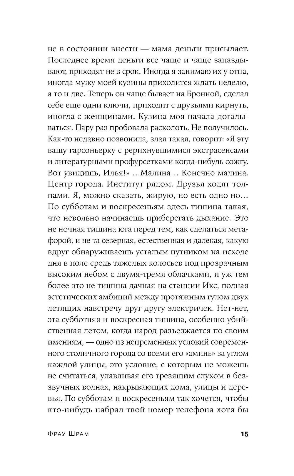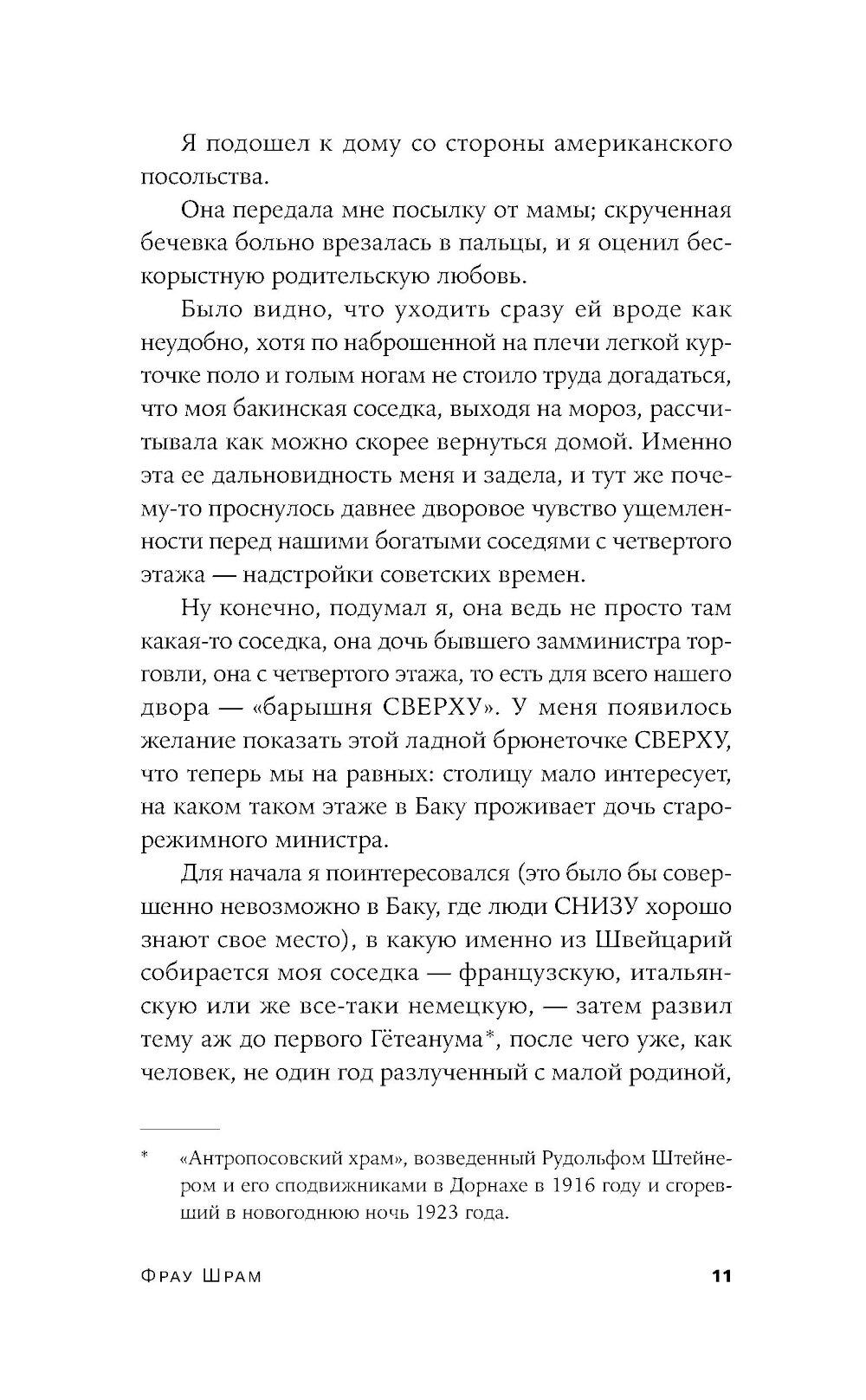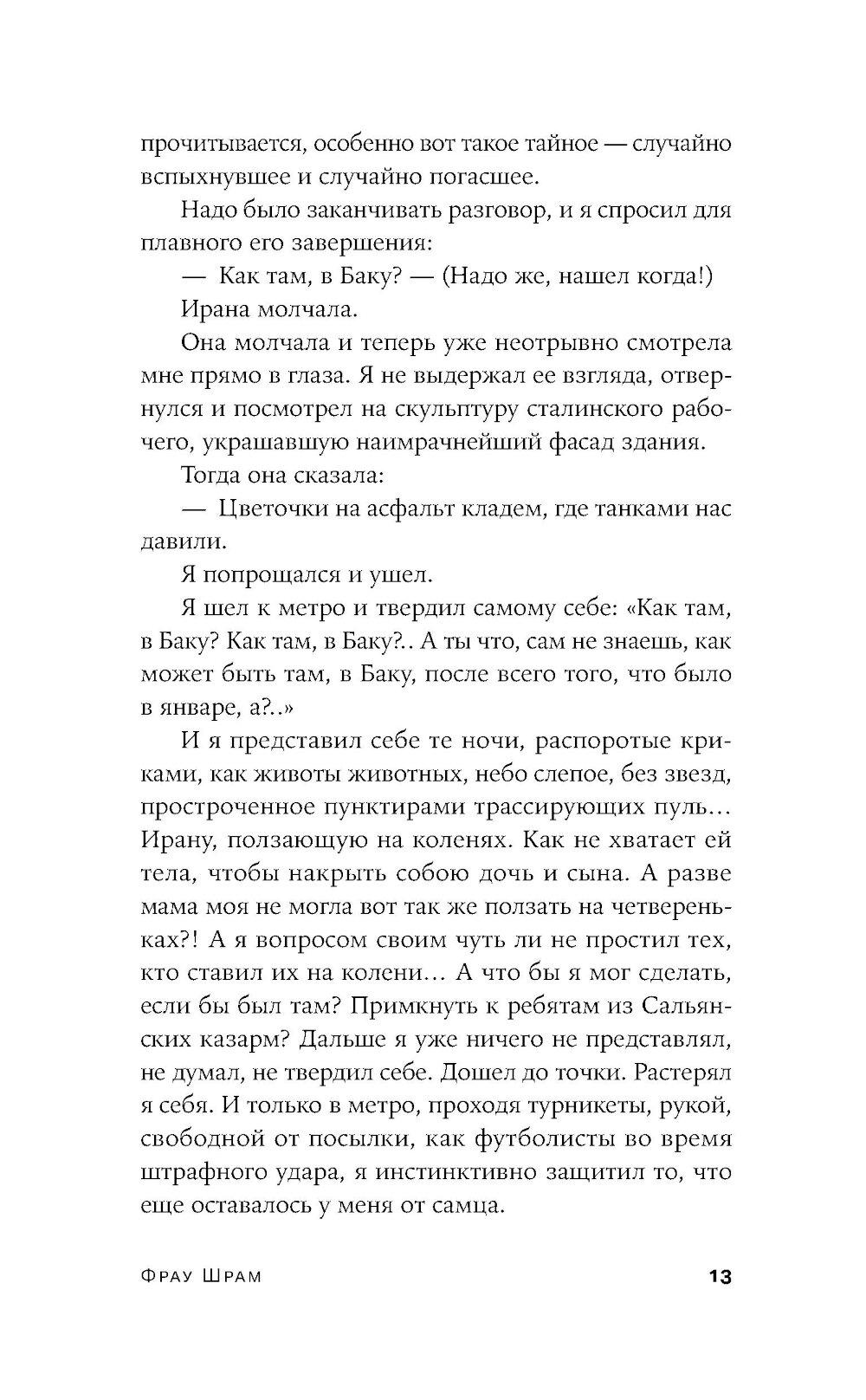 СОДЕРЖИТ ИНФОРМАЦИЮ О НАРКОТИЧЕСКИХ ИЛИ ПСИХОТРОПНЫХ ВЕЩЕСТВАХ, УПОТРЕБЛЕНИЕ КОТОРЫХ ОПАСНО ДЛЯ ЗДОРОВЬЯ. ИХ НЕЗАКОННЫЙ ОБОРОТ ВЛЕЧЕТ УГОЛОВНУЮ ОТВЕТСТВЕННОСТЬ. Москва, девяностые. Студент московского Литинститута Илья едет в родной Баку, чтобы повидаться с матерью и разобраться в себе. На фоне политических и социальных потрясений и личного кризиса у Ильи случается роман, ставший точкой невозврата в его собственной жизни. «Фрау Шрам» - история о прошлом и настоящем, о любви и долге, о горькой романтике «каникул» в стране, где еще теплятся отголоски империи и зарождаются новые идентичности. Голос этого текста - исключительно мужской, прямой, удивляющий откровенностью, при этом герой тонко чувствует происходящее и рефлексирует, сопоставляя собственную жизнь с перспективной Москвой и ретроспективным Баку, в декорациях которых разворачиваются события. Тема социальных этажей, личной свободы и выбора становится метафорой того, как живут и меняются люди в переломные времена.| Издательство | Альпина Паблишер |