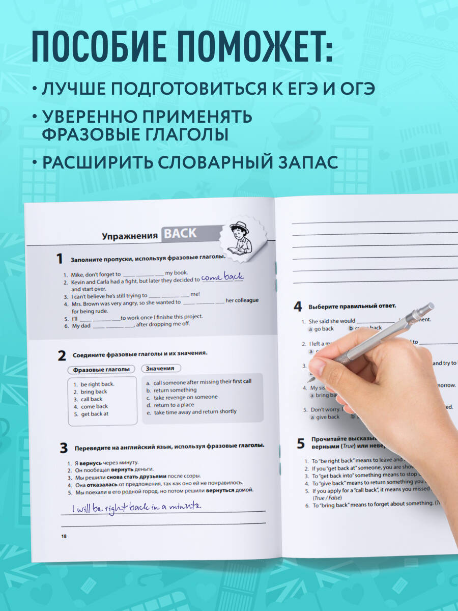 «Фразовые глаголы английского языка» - практический тренажер, который поможет вам уверенно овладеть одной из самых сложных, но необходимых тем английского языка. В книге собраны самые употребительные фразовые глаголы с переводом и примерами, а также упражнения для закрепления. Знание фразовых глаголов особенно важно при подготовке к ОГЭ и ЕГЭ, где они встречаются в текстах для чтения, аудирования и в заданиях на использование лексики. Умение правильно их понимать и применять значительно повышает шансы на высокий балл. Пособие делает изучение понятным и системным: таблицы, примеры и тренировки помогут не только запомнить глаголы, но и научиться использовать их в речи и на письме. Это надежный инструмент для расширения словарного запаса и успешной сдачи экзаменов.| Издательство | ООО "Издательство "Эксмо" |
