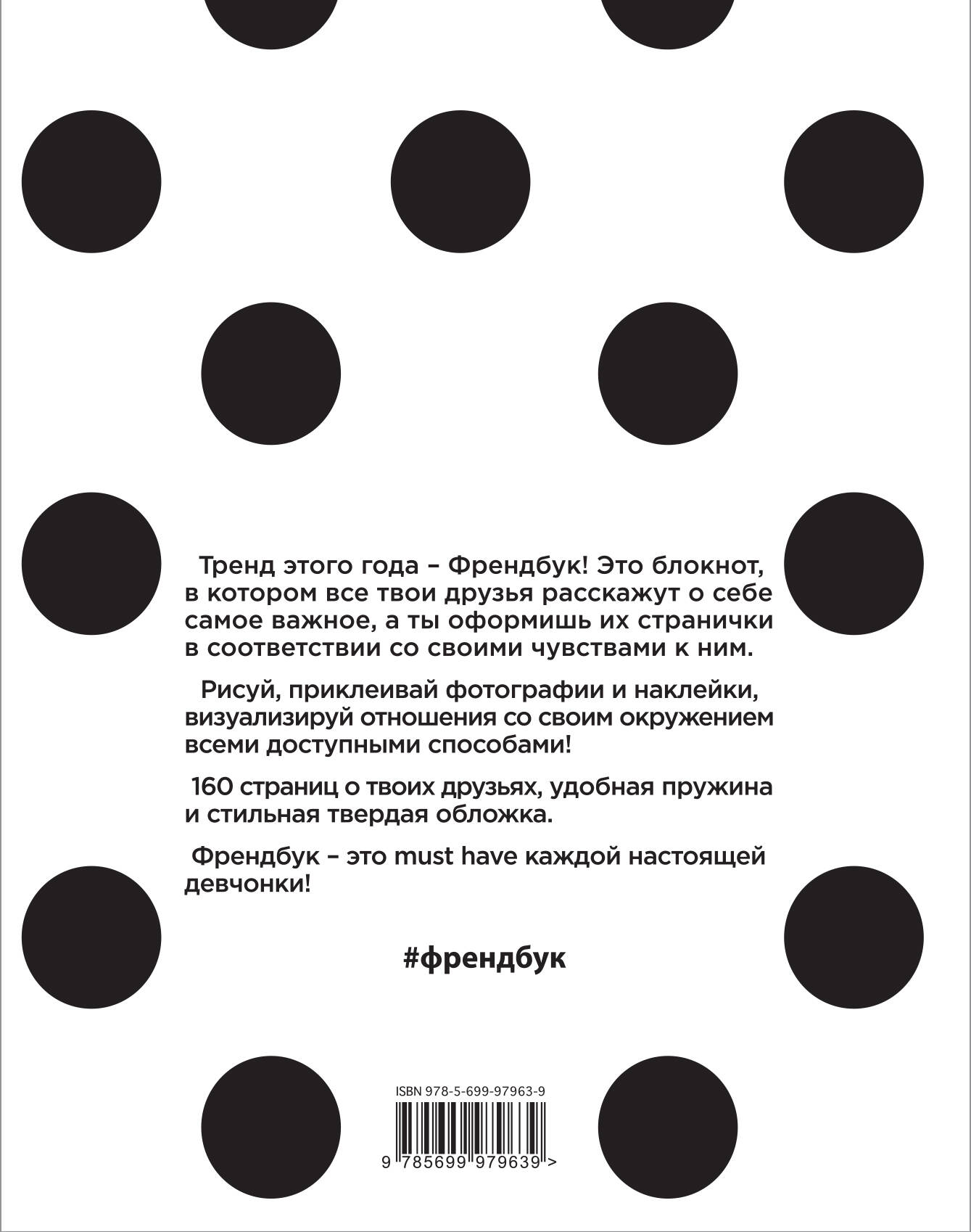 Тренд этого года - Френдбук! Это блокнот, в котором все твои твои друзья расскажут о себе самое важное, а ты оформишь их странички в соответствии со своими чувствами к ним. Рисуй, приклеивай фотографии и наклейки, визуализируй отношения со своим окружением всеми доступными способами! 160 страниц о твоих друзьях, блок с наклейками, удобная пружина и стильная твердая обложка. Френдбук - это must have каждой настоящей девчонки!| Издательство | ООО "Издательство "Эксмо" |