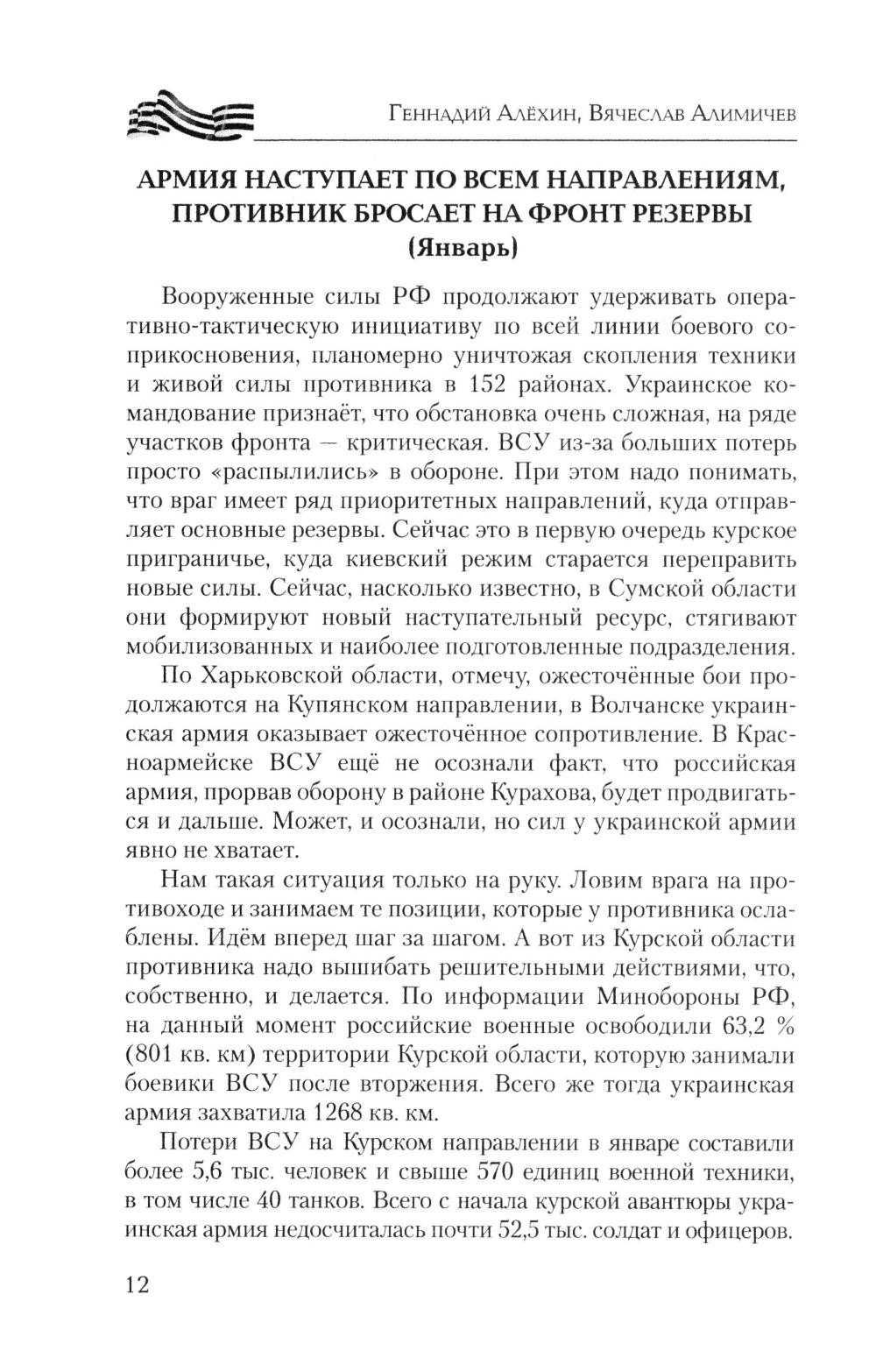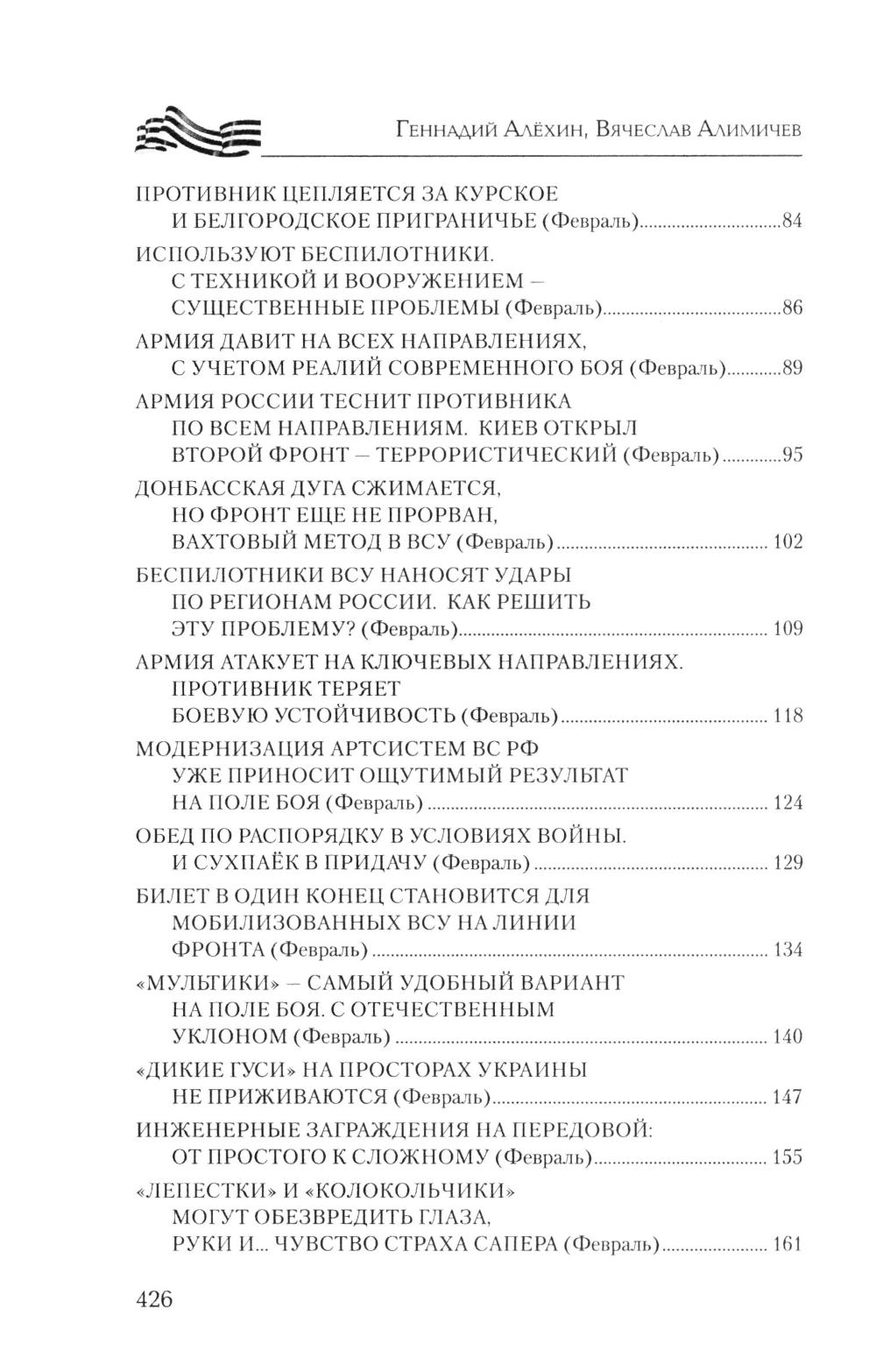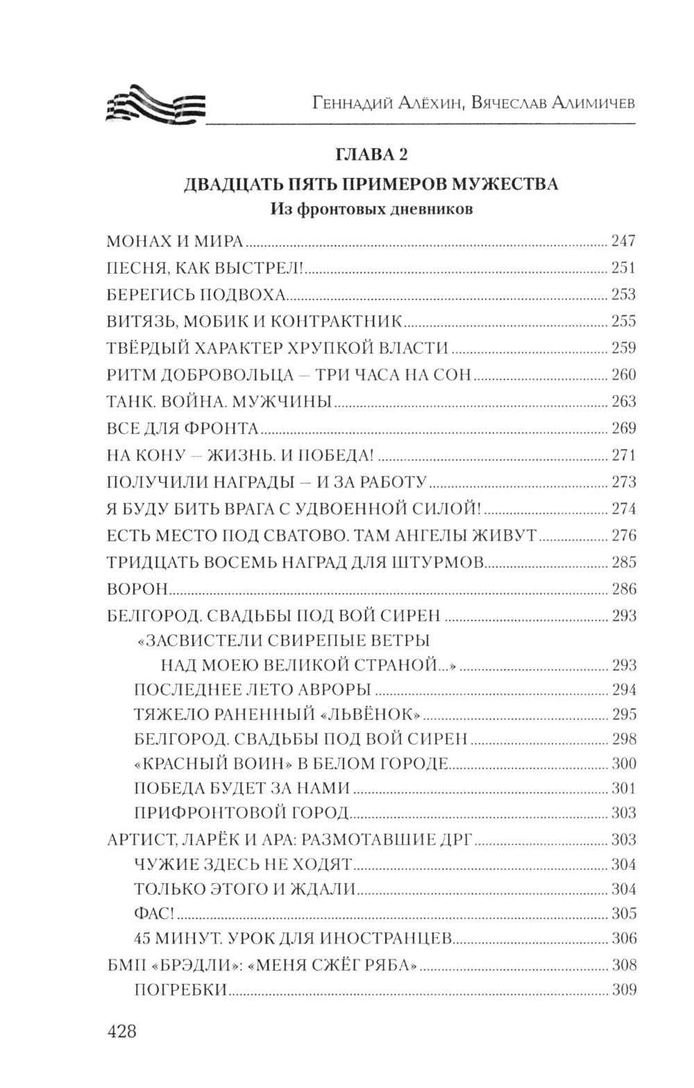 Книга военных журналистов Геннадия Алёхина и Вячеслава Алимичева - настоящий дневник войны, хроника прошедших и текущих событий, за рамками которых героизм тысяч и тысяч людей не только на передовой - «за ленточкой», но и в глубоком тылу. Движение наших войск и войск противника, новая боевая техника, стратегия и тактика командования, сложные задачи снабжения, невыдуманные истории о простых героях войны. Об этом и многом другом расскажет читателю новая книга серии.