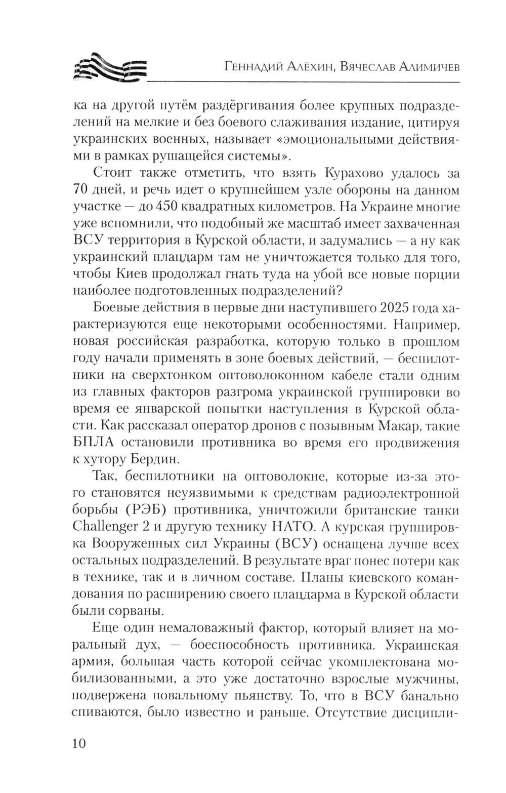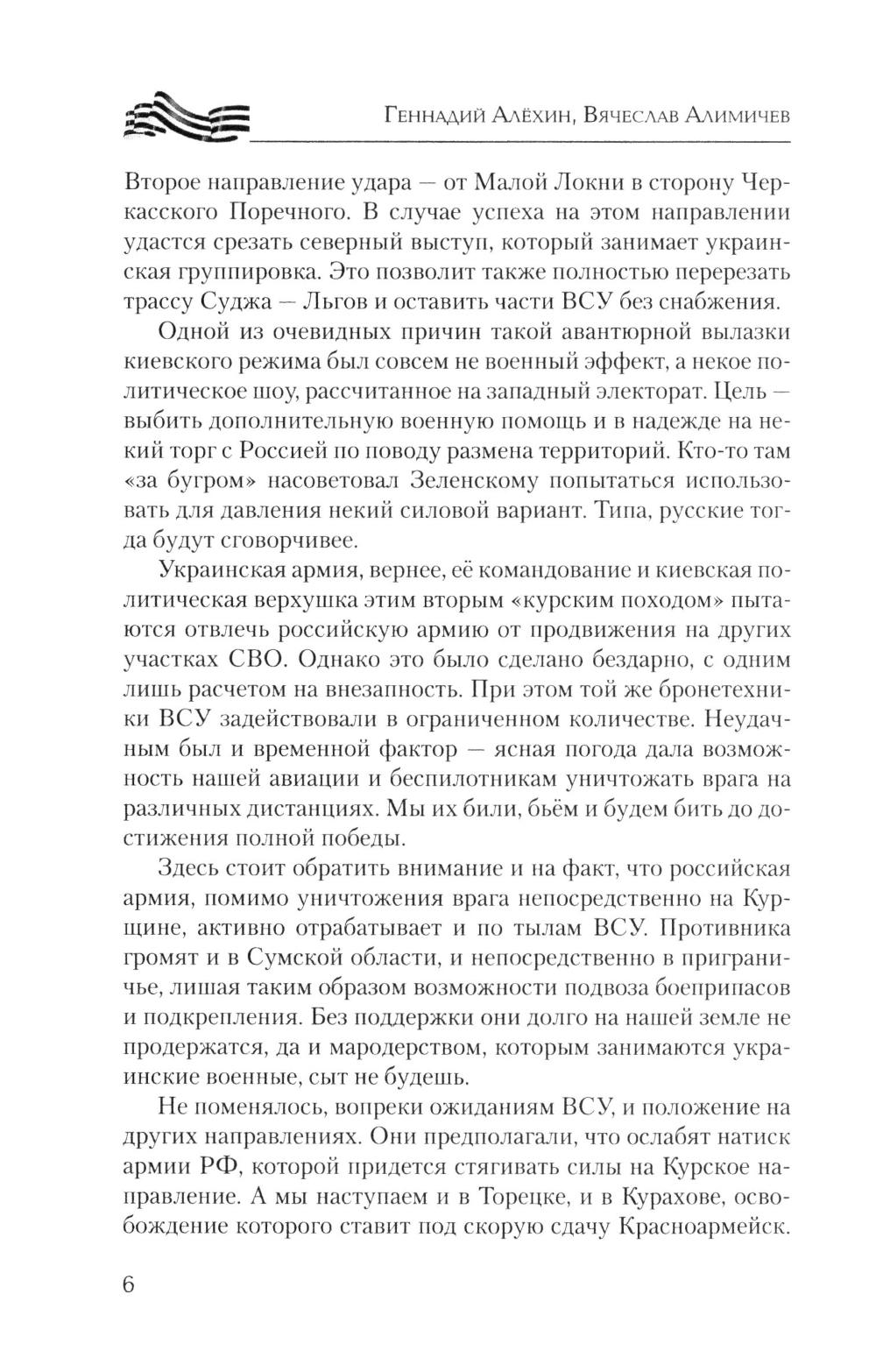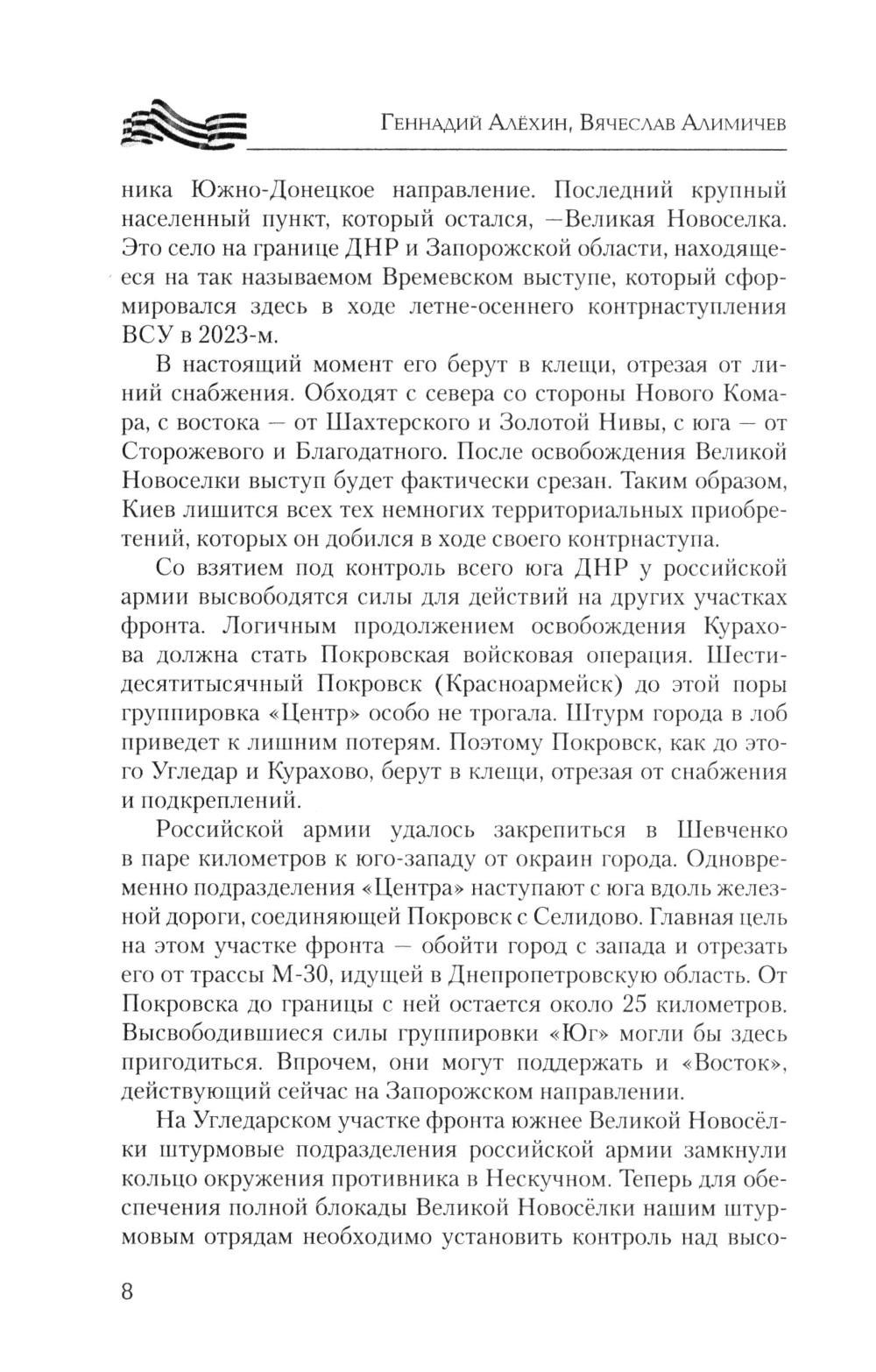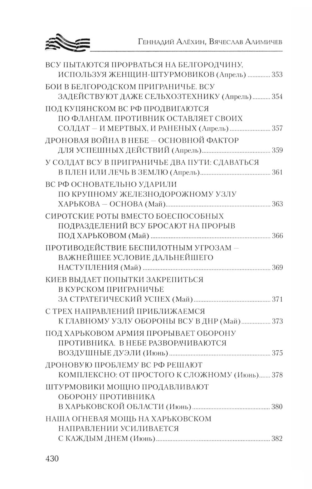 Книга военных журналистов Геннадия Алёхина и Вячеслава Алимичева - настоящий дневник войны, хроника прошедших и текущих событий, за рамками которых героизм тысяч и тысяч людей не только на передовой - «за ленточкой», но и в глубоком тылу. Движение наших войск и войск противника, новая боевая техника, стратегия и тактика командования, сложные задачи снабжения, невыдуманные истории о простых героях войны. Об этом и многом другом расскажет читателю новая книга серии.