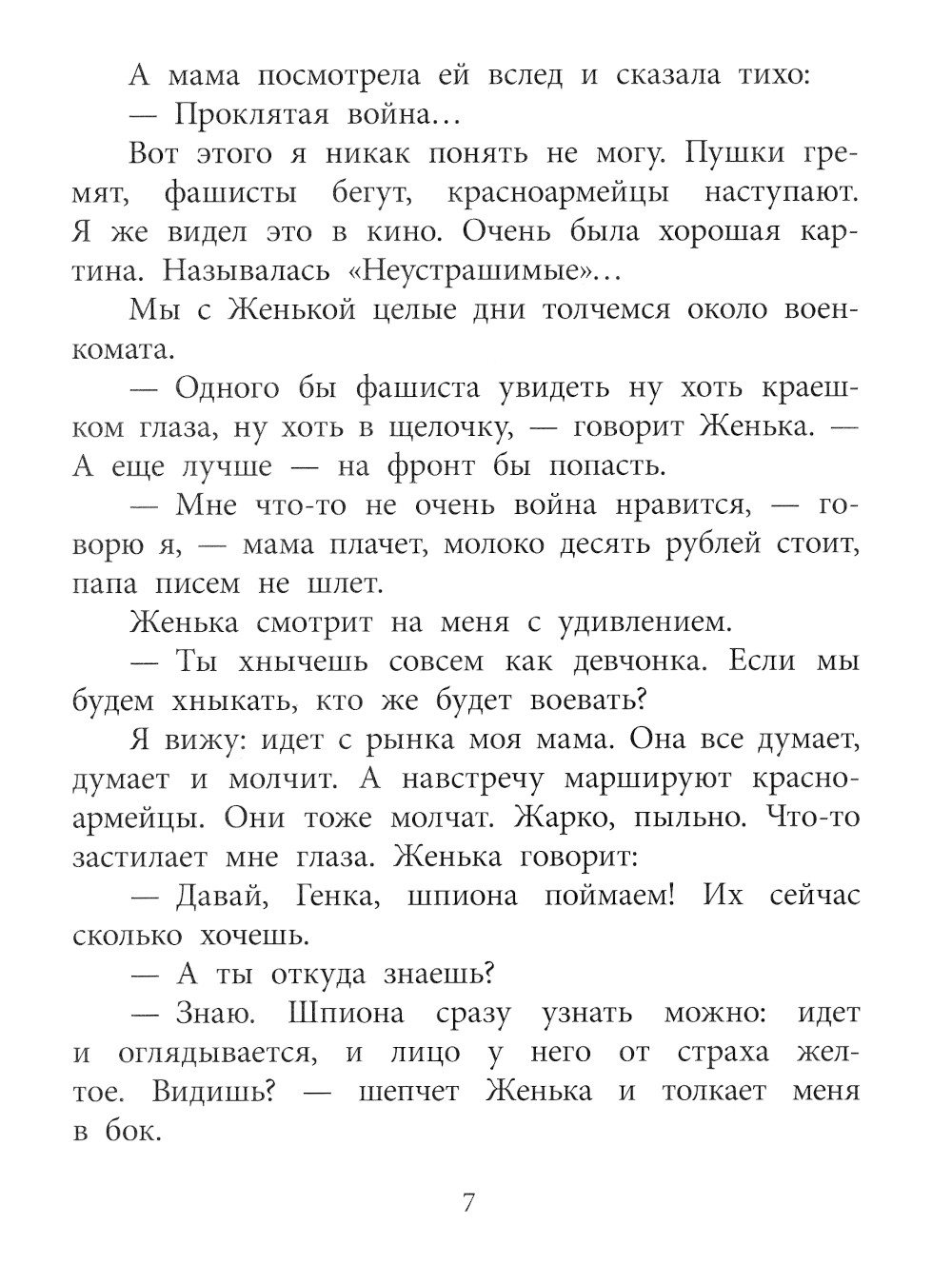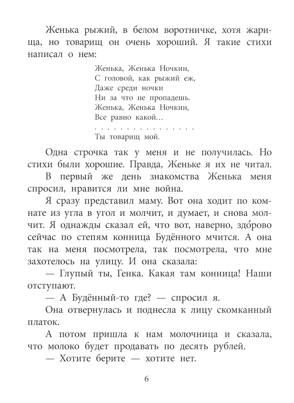 С тех пор как началась война, юный поэт Генка живет с мамой в Январске. Генка с лучшим другом Женькой Ночкиным мечтают поскорее попасть на фронт, сделаться настоящими маршалами, скакать на арабском скакуне со шпагой наголо и «хлопать» минимум по одному фашисту в день. Мальчики даже пытаются сбежать на фронт тайком от взрослых. По-настоящему им предстоит понять, что такое война, когда фронт сам приходит в тихий Январск. Для среднего школьного возраста.| Издательство | Детская литература |