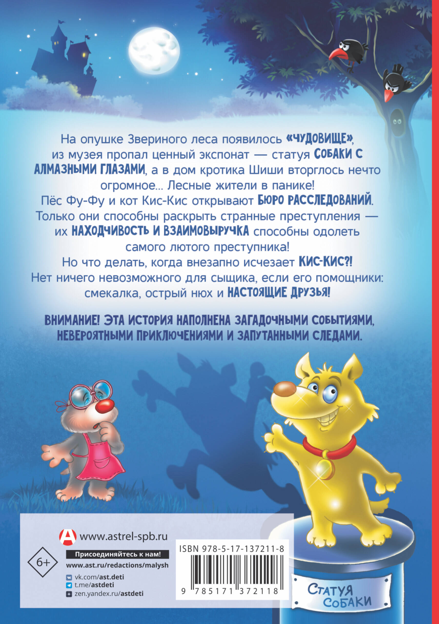 На опушке Звериного леса появилось "чудовище", из музея пропал ценный экспонат - статуя Собаки с алмазными глазами, а в дом кротика Шиши вторглось нечто огромное… Лесные жители в панике! Пёс Фу-Фу и кот Кис-Кис открывают Бюро расследований. Только они способны раскрыть странные преступления - их находчивость и взаимовыручка способны одолеть самого лютого преступника! Но что делать, когда внезапно исчезает Кис-Кис?! Нет ничего невозможного для сыщика, если его помощники: смекалка, острый нюх, и настоящие друзья! Эта история наполнена загадочными событиями, невероятными приключениями и запутанными следами.| Издательство | ИЗДАТЕЛЬСТВО "АСТ" |