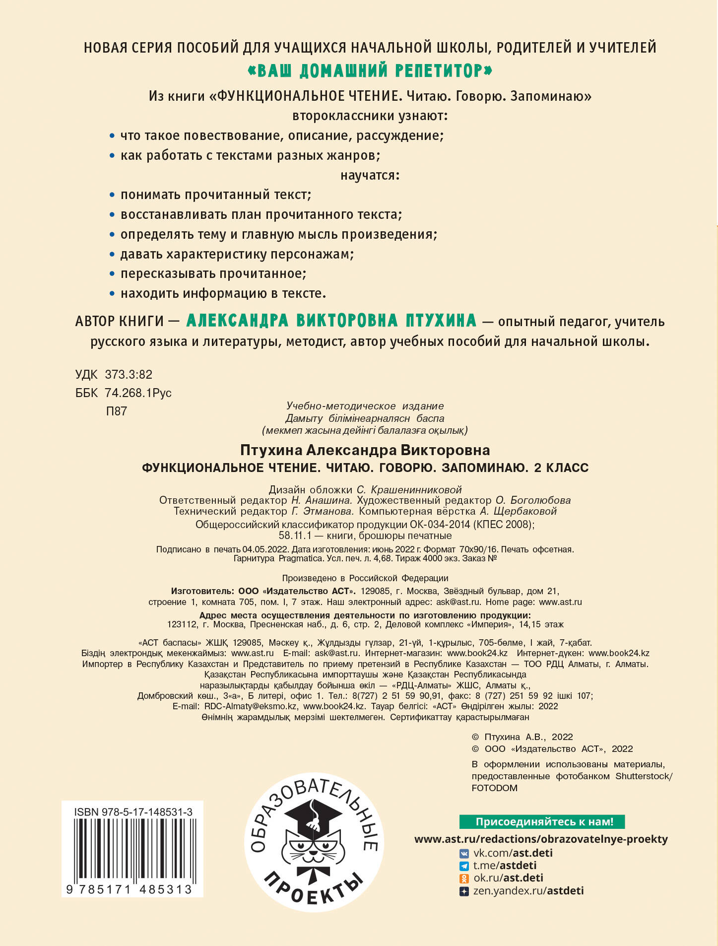 Цель данного пособия - формирование у младших школьников навыков функционального чтения. На сегодняшний день функциональная грамотность не только одно из требований ФГОС НОО, но и основа успешного и продуктивного обучения, поскольку только достаточно сформированная в этом отношении личность способна осознанно и самостоятельно действовать и развиваться, познавать мир. Именно чтение позволяет сформировать базовые навыки получения, обработки и использования информации, на основе которых в дальнейшем и будет строиться общая функциональная грамотность человека. Работы пособия разделены на три части в зависимости от функциональной принадлежности текстов (повествование, описание и рассуждение). Каждую часть предваряет краткая характеристика типа текста, Тексты различны как по содержанию (сказка, загадка, правило и т.д.), так и по форме (стихи, проза). После каждого текста предложено выполнить ряд заданий, которые направлены на развитие таких умений как: • проверка понимания прочитанного (фактическая информация); • выявление и анализ необходимой информации (поисковое чтение); • аргументированное выражение собственного отношения к прочитанному (первичные навыки цитирования); • определение авторской точки зрения (т.е. анализ текст на лингвистическом уровне); • поиск информации, представленной в неявном виде.| Издательство | АСТ |