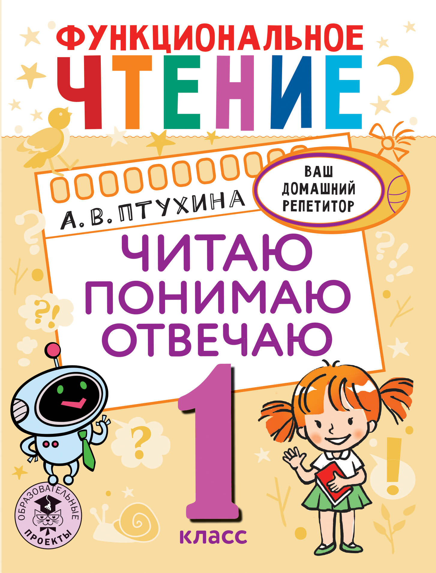 Новая серия пособий для учащихся начальной школы, родителей и учителей "Ваш домашний репетитор". Из книги "Функциональное чтение. Читаю. Понимаю. Отвечаю" первоклассники узнают: - что такое повествование, описание, рассуждение; - как работать с текстами разных жанров; Научатся: - понимать прочитанный текст; - определять последовательность событий и находить главных героев произведений; - отвечать на вопросы по тексту; - подбирать заголовок к тексту. Автор книги - Александра Викторовна Птухина - опытный педагог, учитель русского языка и литературы, методист, автор учебных пособий для начальной школы.| Издательство | АСТ |