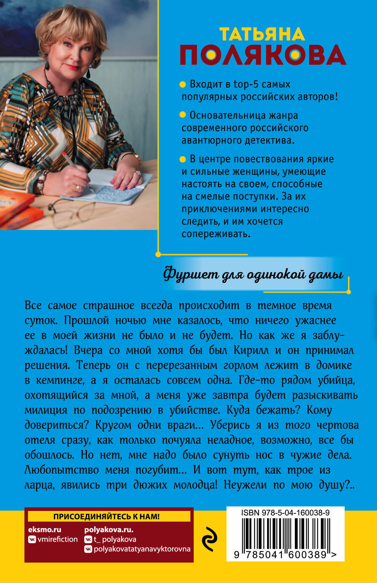 Все самое страшное всегда происходит в темное время суток. Прошлой ночью мне казалось, что ничего ужаснее ее в моей жизни не было и не будет. Но как же я заблуждалась! Вчера со мной хотя бы был Кирилл, и он принимал решения. Теперь он с перерезанным горлом лежит в домике в кемпинге, а я осталась совсем одна. Где-то рядом убийца, охотящийся за мной, а меня уже завтра будет разыскивать милиция по подозрению в убийстве. Куда бежать? Кому довериться? Кругом одни враги… Уберись я из того чертова отеля сразу, как только почуяла неладное, возможно, все бы обошлось. Но нет, мне надо было сунуть нос в чужие дела. Любопытство меня погубит… И вот тут, как трое из ларца, явились три дюжих молодца! Неужели по мою душу?.. Татьяна Полякова - один из самых популярных российских писателей в жанре детектива. За время писательской карьеры из-под ее пера вышло более 85 книг общим тиражом более 36 миллионов экземпляров. По свидетельствам читателей, романы Татьяны Поляковой - это «захватывающий сюжет и непредсказуемая развязка, обаятельные герои и невероятные приключения, легкий стиль и яркие диалоги».| Издательство | Эксмо |