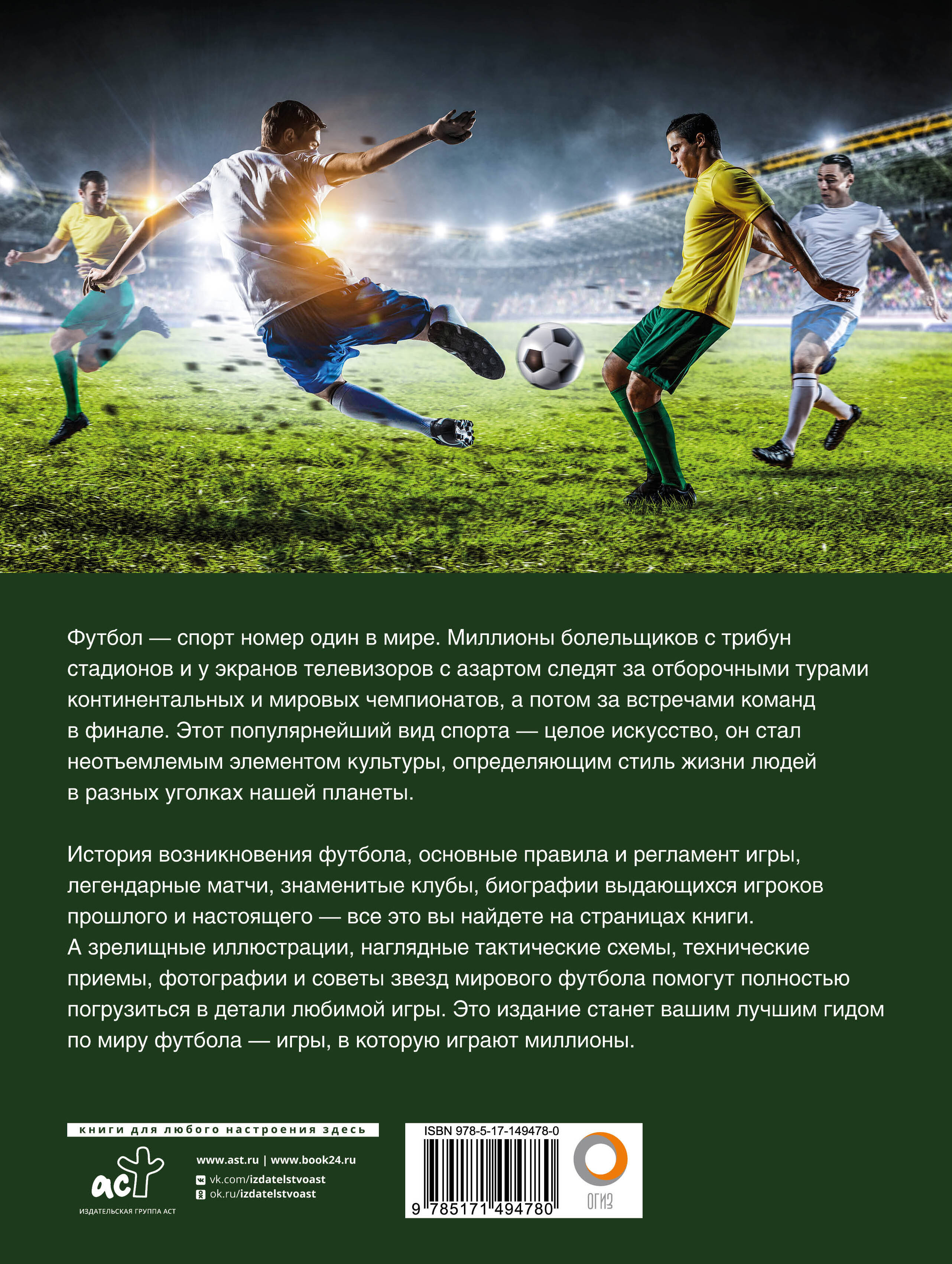 Футбол - спорт номер один в мире. Миллионы болельщиков с трибун стадионов и у экранов телевизоров с азартом следят за отборочными турами континентальных и мировых чемпионатов, а потом за встречами команд в финале. Этот популярнейший вид спорта - целое искусство, он стал неотъемлемым элементом культуры, определяющим стиль жизни людей в разных уголках нашей планеты. История возникновения футбола, основные правила и регламент игры, легендарные матчи, знаменитые клубы, биографии выдающихся игроков прошлого и настоящего - все это вы найдете на страницах книги. А зрелищные иллюстрации, наглядные тактические схемы, технические приемы, фотографии и советы звезд мирового футбола помогут полностью погрузиться в детали любимой игры. Это издание станет вашим лучшим гидом по миру футбола - игры, в которую играют миллионы.| Издательство | ИЗДАТЕЛЬСТВО "АСТ" |