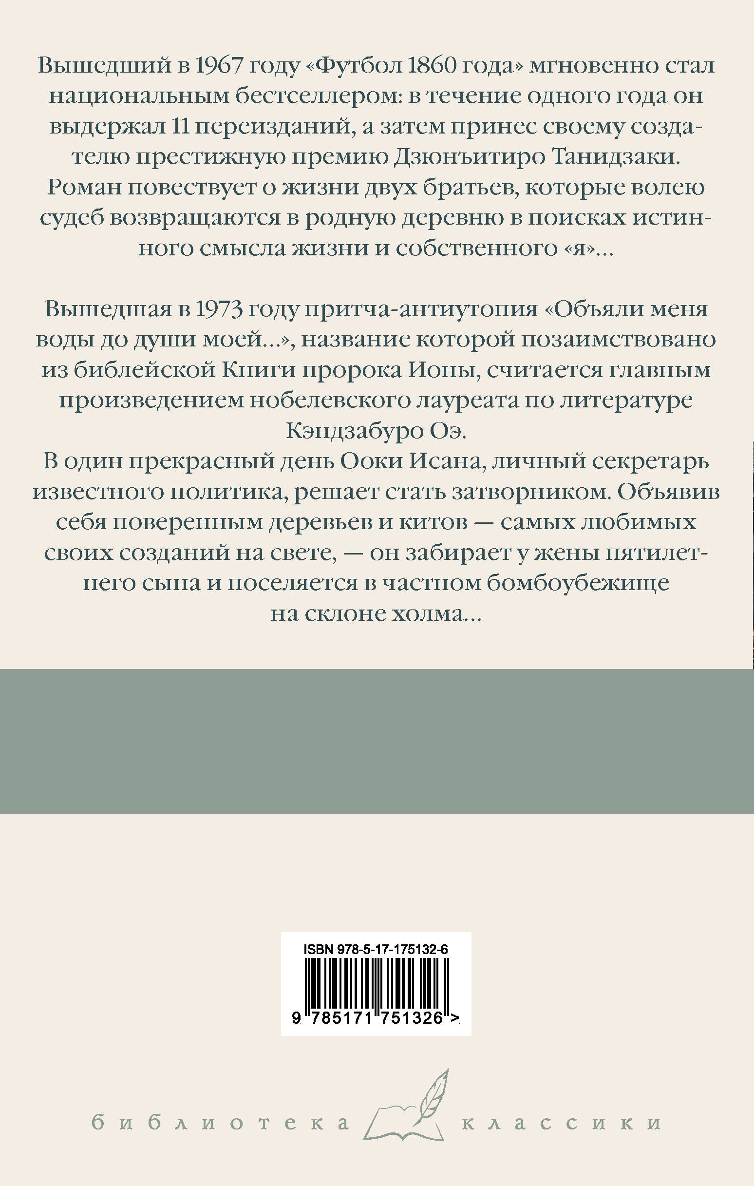 - Лауреат Нобелевской премии по литературе Кэндзабуро Оэ - один из главных японских писателей XX века. - Сразу два романа автора в одном томе. - Вышедший в 1967 году «Футбол 1860 года» в течение одного года выдержал 11 переизданий и принес своему автору престижную премию имени Танидзаки. - Вышедшая в 1973 году притча-антиутопия «Объяли меня воды до души моей…» считается одним из самых известных произведений Оэ. - Издание в строгом оформлении серии «Библиотека классики».| Издательство | Издательство "АСТ" |