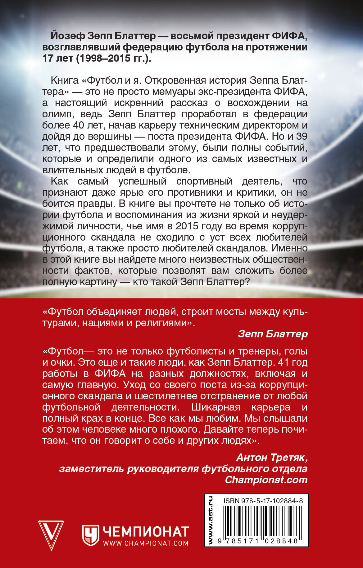 Йозеф Зепп Баттер - восьмой президент ФИФА, возглав- лявший федерацию футбола на протяжении 17 лет (1998- 2015 гг.). Книга "Футбол и я. Откровенная история Зеппа Блатте- ра" - это не просто мемуары экс-президента ФИФА, а насто- ящий искренний рассказ о восхождении на Олимп, ведь Зепп Блаттер проработал в федерации более 40 лет, начав карьеру техническим директором и дойдя до вершины - поста пре- зидента ФИФА. Но и 39 лет, что предшествовали этому, были полны событий, которые и определили одного из самых из- вестных и влиятельных людей в футболе. Как самый успешный спортивный деятель - что признают даже ярые его противники и критики, - он не боится правды. В книге вы прочтете не только об истории футбола и воспо- минания из жизни яркой и неудержимой личности, чье имя в 2015 году - во время коррупционного скандала - не сходило с уст всех любителей футбола, а также просто любителей скан- далов. Именно в этой книге вы найдете много неизвестных общественности фактов, которые позволят сложить вам более полную картину - кто такой Зепп Блаттер?