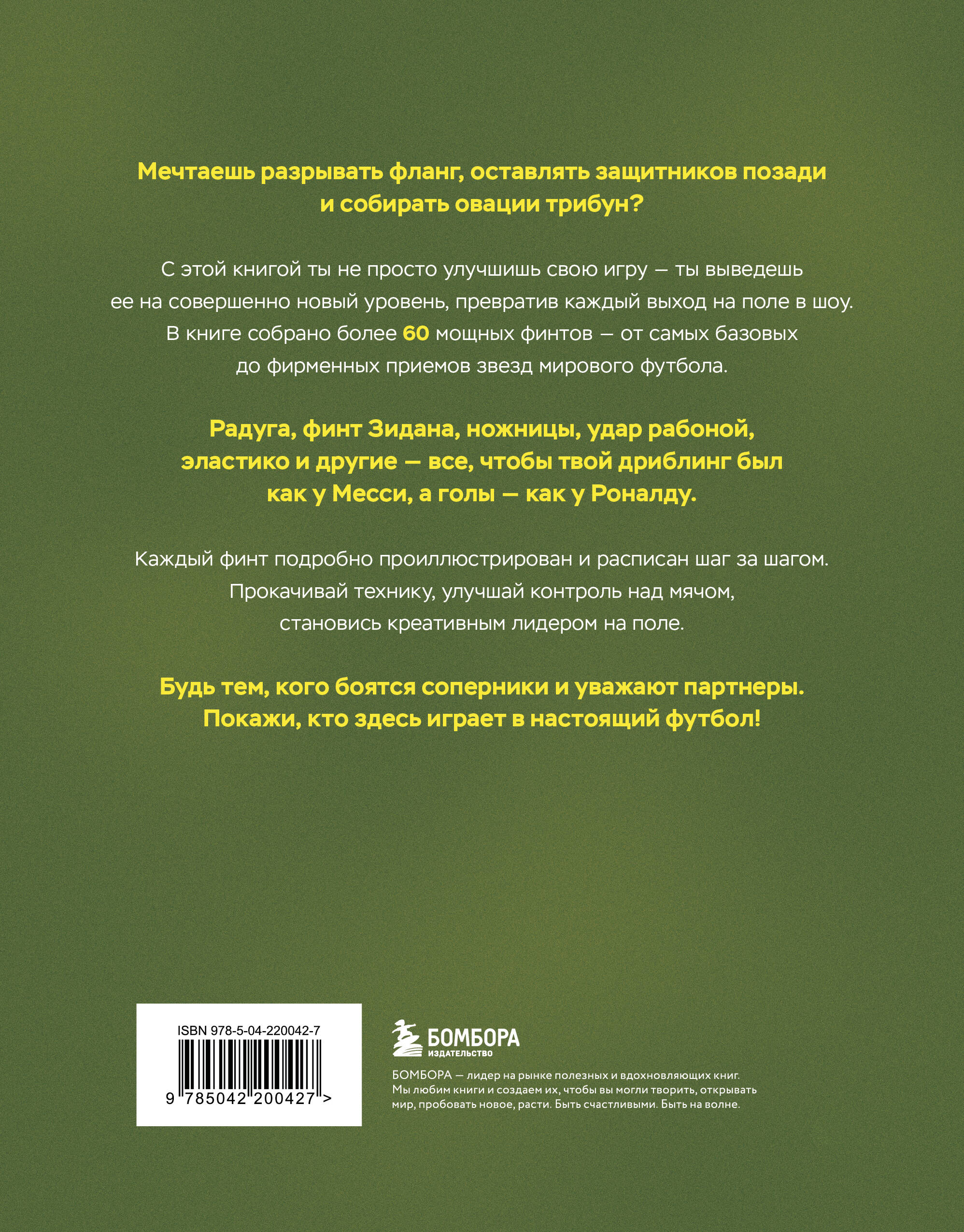 Мечтаешь разрывать фланг, оставлять защитников позади и собирать овации трибун? С этой книгой ты не просто улучшишь свою игру - ты выведешь её на совершенно новый уровень, превратив каждый выход на поле в шоу. В книге собрано более 60 мощных финтов - от самых базовых до фирменных приемов звёзд мирового футбола. «Радуга», финт Зидана, «ножницы», удар «рабоной», «эластико» и другие - всё, чтобы твой дриблинг был как у Месси, а голы - как у Роналду. Каждый финт подробно проиллюстрирован и расписан шаг за шагом. Прокачивай технику, улучшай контроль над мячом, становись креативным лидером на поле. Будь тем, кого боятся соперники и уважают партнёры. Покажи, кто здесь играет в настоящий футбол!| Издательство | ООО "Издательство "Эксмо" |