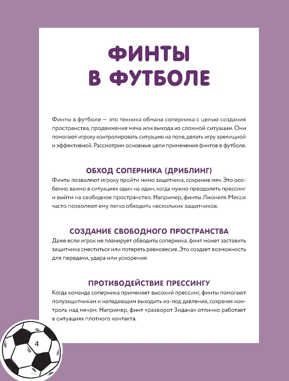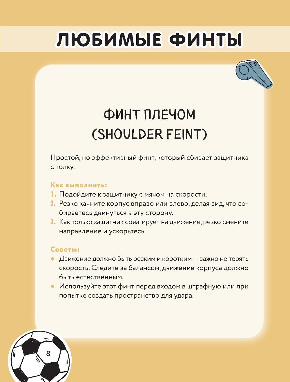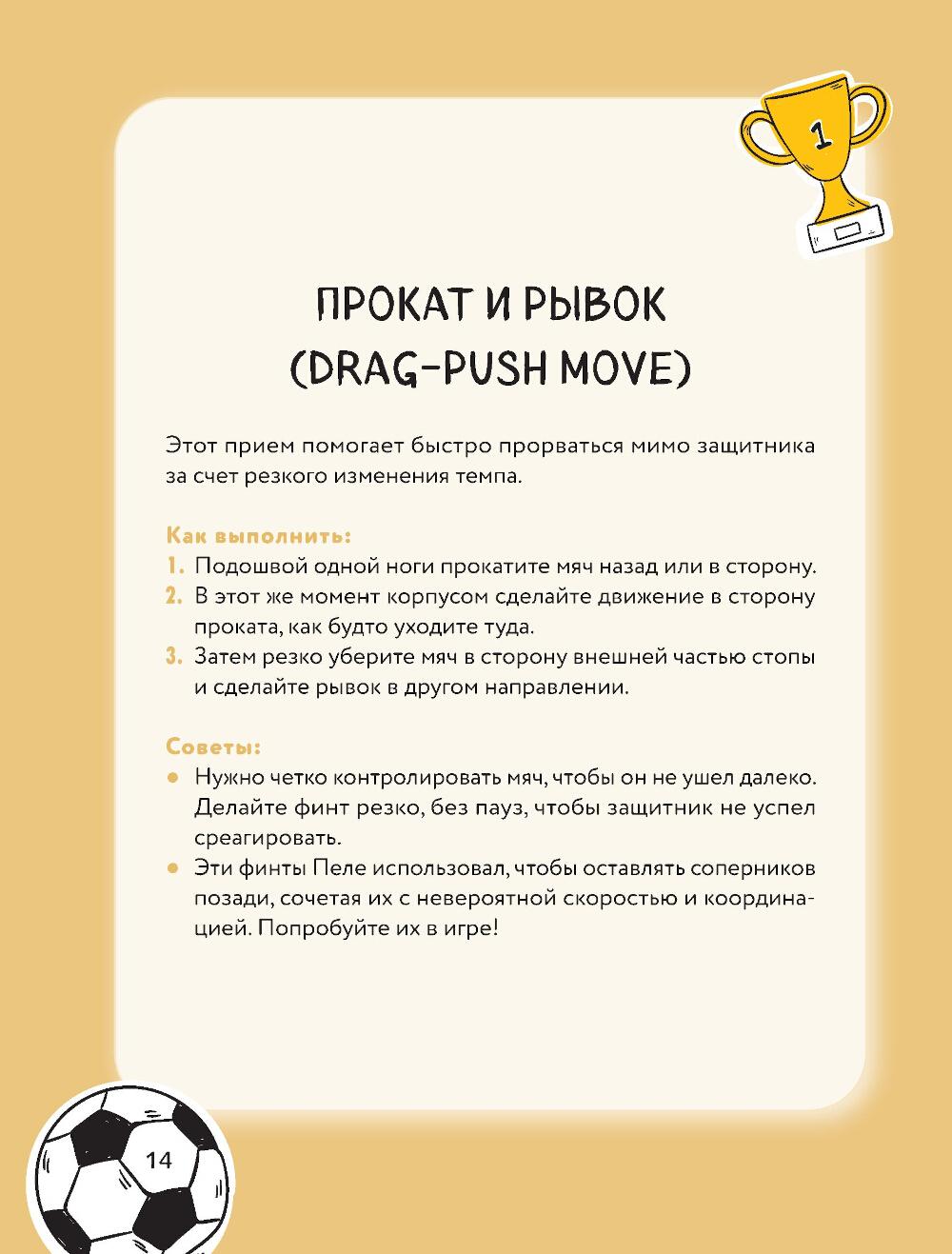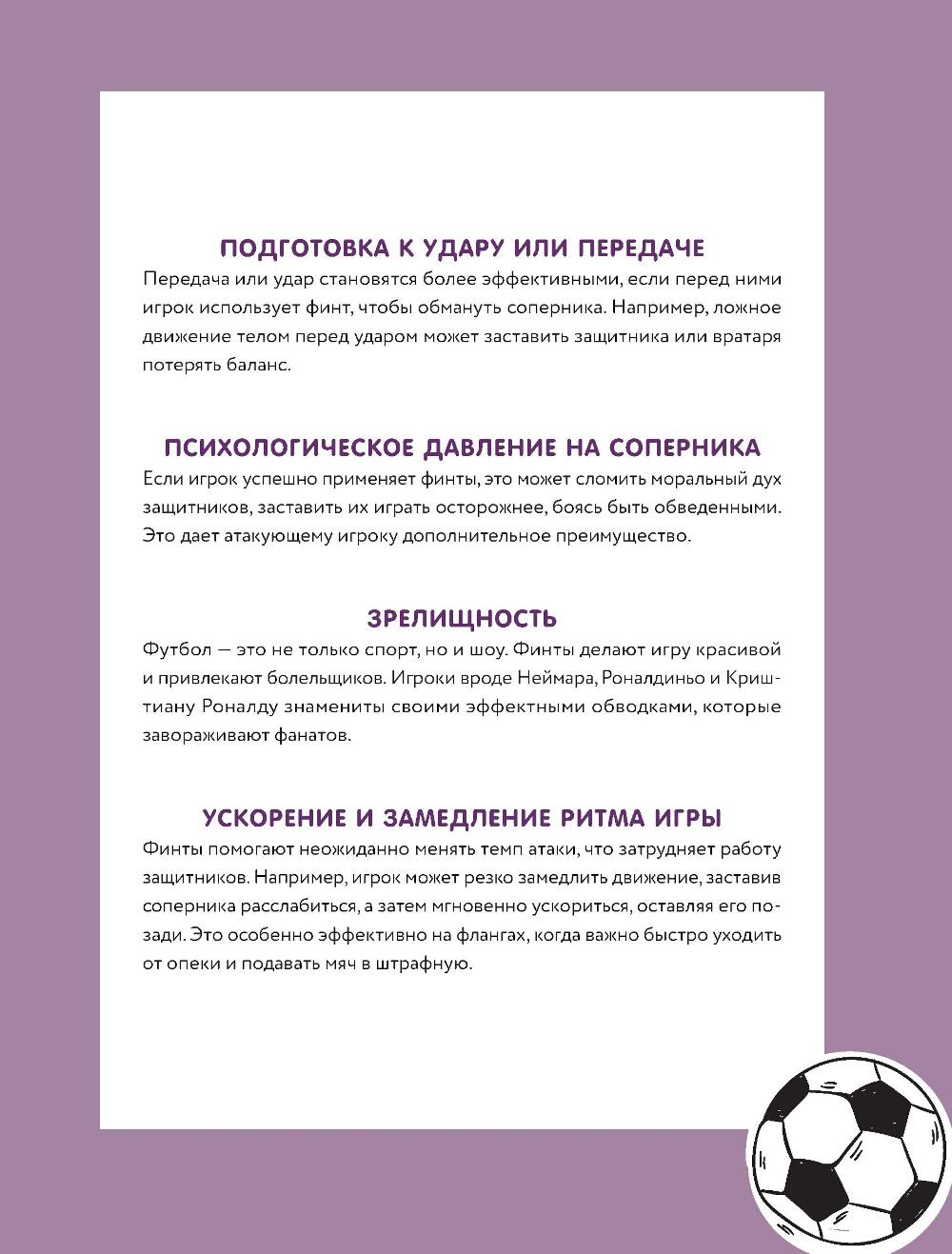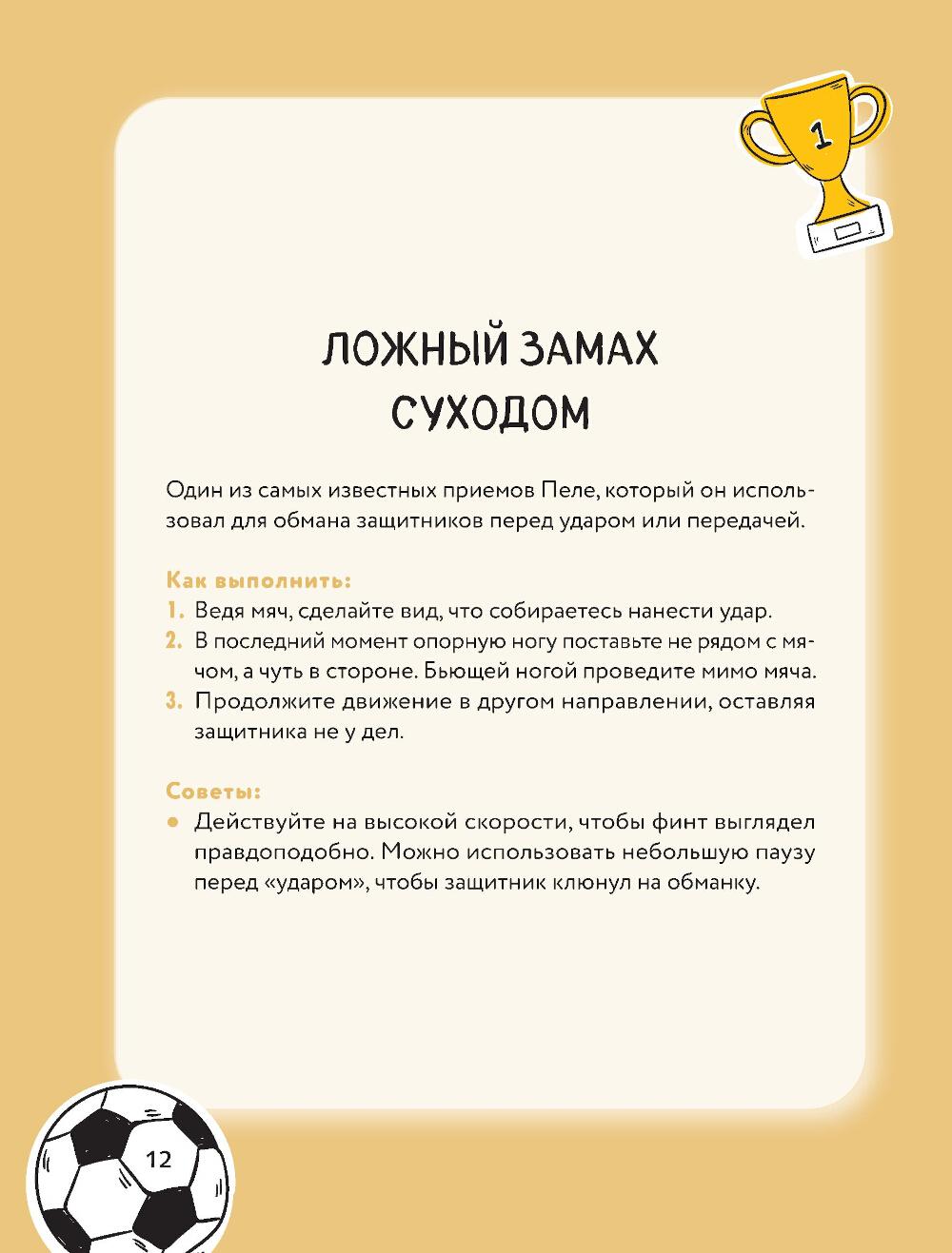 Мечтаешь разрывать фланг, оставлять защитников позади и собирать овации трибун? С этой книгой ты не просто улучшишь свою игру - ты выведешь её на совершенно новый уровень, превратив каждый выход на поле в шоу. В книге собрано более 60 мощных финтов - от самых базовых до фирменных приемов звёзд мирового футбола. «Радуга», финт Зидана, «ножницы», удар «рабоной», «эластико» и другие - всё, чтобы твой дриблинг был как у Месси, а голы - как у Роналду. Каждый финт подробно проиллюстрирован и расписан шаг за шагом. Прокачивай технику, улучшай контроль над мячом, становись креативным лидером на поле. Будь тем, кого боятся соперники и уважают партнёры. Покажи, кто здесь играет в настоящий футбол!| Издательство | Эксмо |