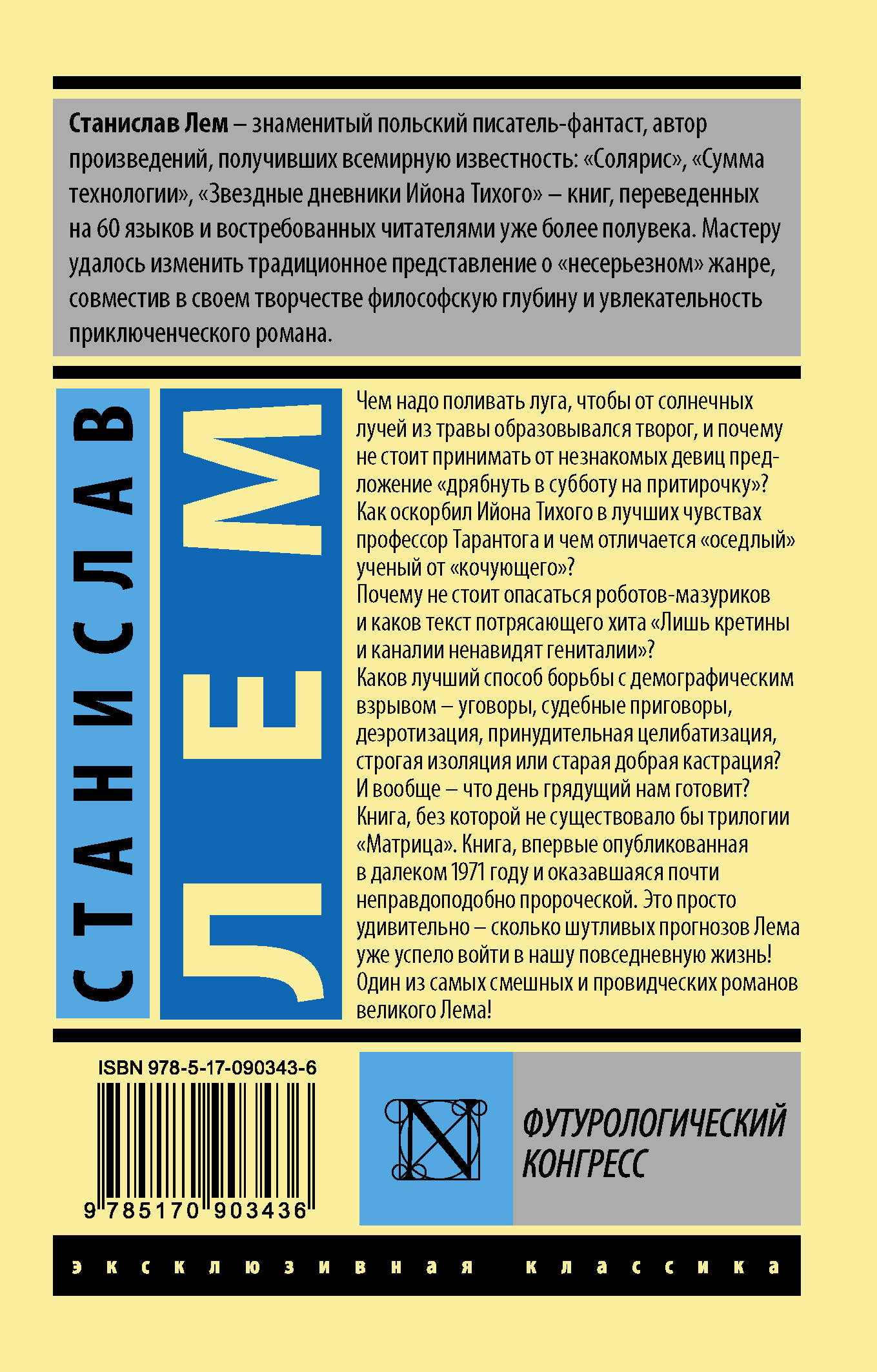 Чем надо поливать луга, чтобы от солнечных лучей из травы образовывался творог, и почему не стоит принимать от незнакомых девиц предложение "дрябнуть в субботу на притирочку"? Как оскорбил Ийона Тихого в лучших чувствах профессор Тарантога и чем отличается "оседлый" ученый от "кочующего"? Почему не стоит опасаться роботов-мазуриков и каков текст потрясающего хита "Лишь кретины и каналии ненавидят гениталии"? Каков лучший способ борьбы с демографическим взрывом - уговоры, судебные приговоры, деэротизация, принудительная целибатизация, строгая изоляция или старая добрая кастрация? И вообще - что день грядущий нам готовит? Книга, без которой не существовало бы трилогии "Матрица". Книга, впервые опубликованная в далеком 1971 году и оказавшаяся почти неправдоподобно пророческой.| Издательство | Издательство "АСТ" |