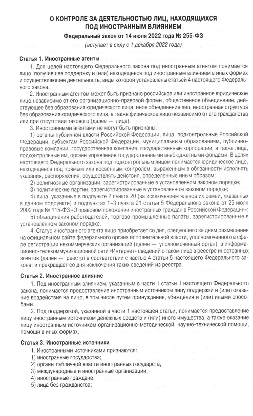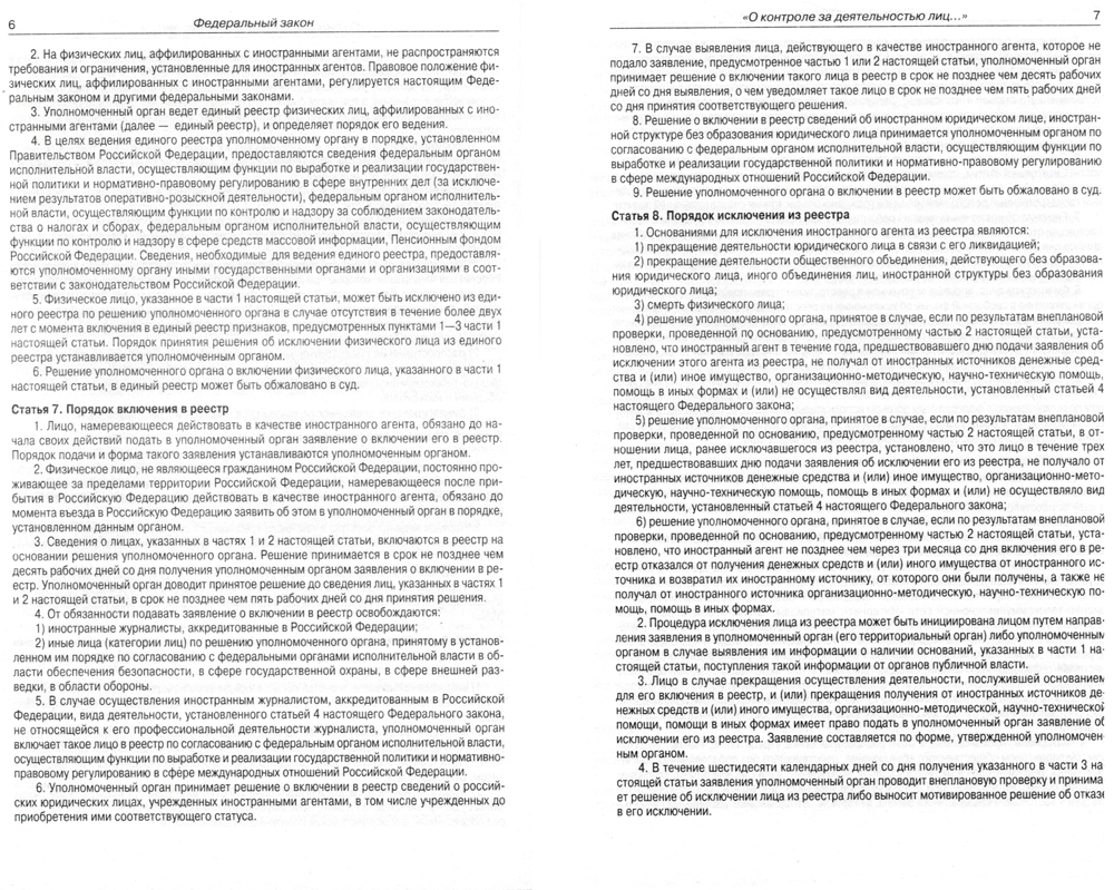 Для целей настоящего Федерального закона под иностранным агентом понимается лицо, получившее поддержку и (или) находящееся под иностранным влиянием в иных формах и осуществляющее деятельность, виды которой установлены статьей 4 настоящего Федерального закона. Иностранным агентом может быть признано российское или иностранное юридическое лицо независимо от его организационно-правовой формы, общественное объединение, действующее без образования юридического лица, иное объединение лиц, иностранная структура без образования юридического лица, а также физическое лицо независимо от его гражданства или при отсутствии такового.| Издательство | Омега-Л |