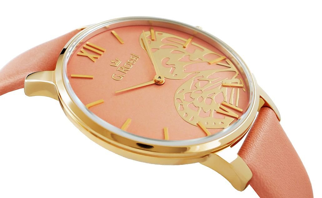 Женские часы G.Rossi 12177A5-5E2 + BOX Официальная польская дистрибуция - оригинальный товар Описание товара:<br /><br /> • Бренд: G.Rossi.<br /><br /> • Высокое качество: Высокое качество изготовления.<br /><br /> • Механизм: кварцевый.<br /><br /> • Циферблат: аналоговый с темой.<br /><br /> • Корпус: Высококачественная сталь, покрытая специальным покрытием PLATING с повышенной устойчивостью к истиранию,<br /><br /> • КРИСТАЛЛ: Минерал с повышенной устойчивостью к царапинам и случайным ударам.<br /><br /> • Ремешок: натуральная кожа.<br /><br /> • Водонепроницаемость: 3 атм.<br /><br /> • ПОКРЫТИЕ и/или технология: - Инновационный ионный метод напыления покрытия, позволяющий получить однородную, гладкую поверхность с повышенной устойчивостью к истиранию.<br /><br /> • Гипоаллергенный: да - не содержит никеля - отлично подходит для аллергиков.<br /><br /> • подлинность: на задней крышке часов имеется гравировка и информация от производителя, подтверждающая подлинность.<br /><br /> • Дело: 38<br /><br /> • Наберите: 35<br /><br /> • Толщина: 7,6<br /><br /> • Ремешок: 16<br /><br /> • Окружность запястья: 155-200 Цветовая гамма:<br /><br /> • Корпус: золото<br /><br /> • Циферблат: розовый с узором.<br /><br /> • часовые метки: золото<br /><br /> • Стрелки: золото<br /><br /> • Ремешок: розовый.