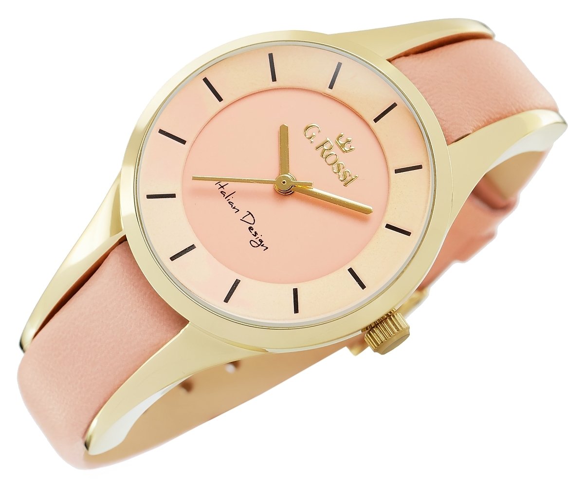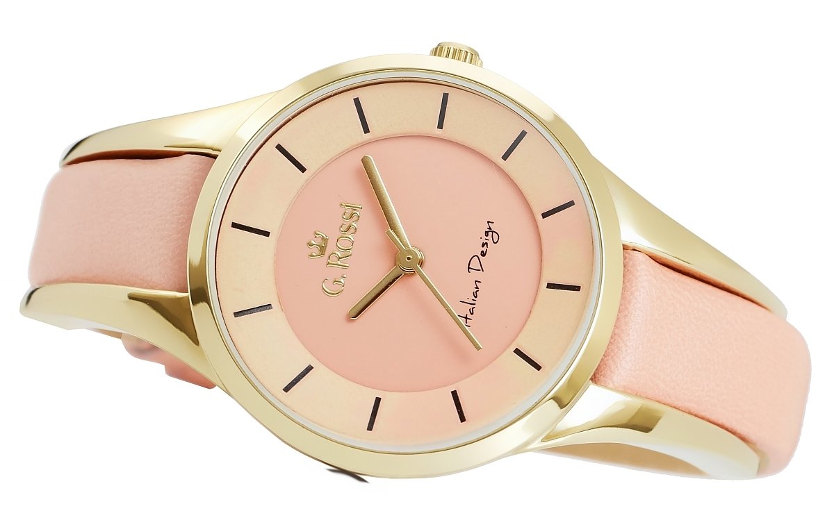 Женские часы G.Rossi 8154A-5E2 + BOX Официальная польская дистрибуция - оригинальный товар Описание товара:<br /><br /> • Корпус: 30<br /><br /> • Наберите: 26<br /><br /> • Толщина: 9,3<br /><br /> • Ремешок: 10<br /><br /> • Окружность запястья: 140-185 Цветовая гамма:<br /><br /> • Корпус: золото<br /><br /> • Циферблат: пудрово-розовый.<br /><br /> • часовые метки: черные<br /><br /> • Стрелки: золото<br /><br /> • Ремешок: пудрово-розовый.